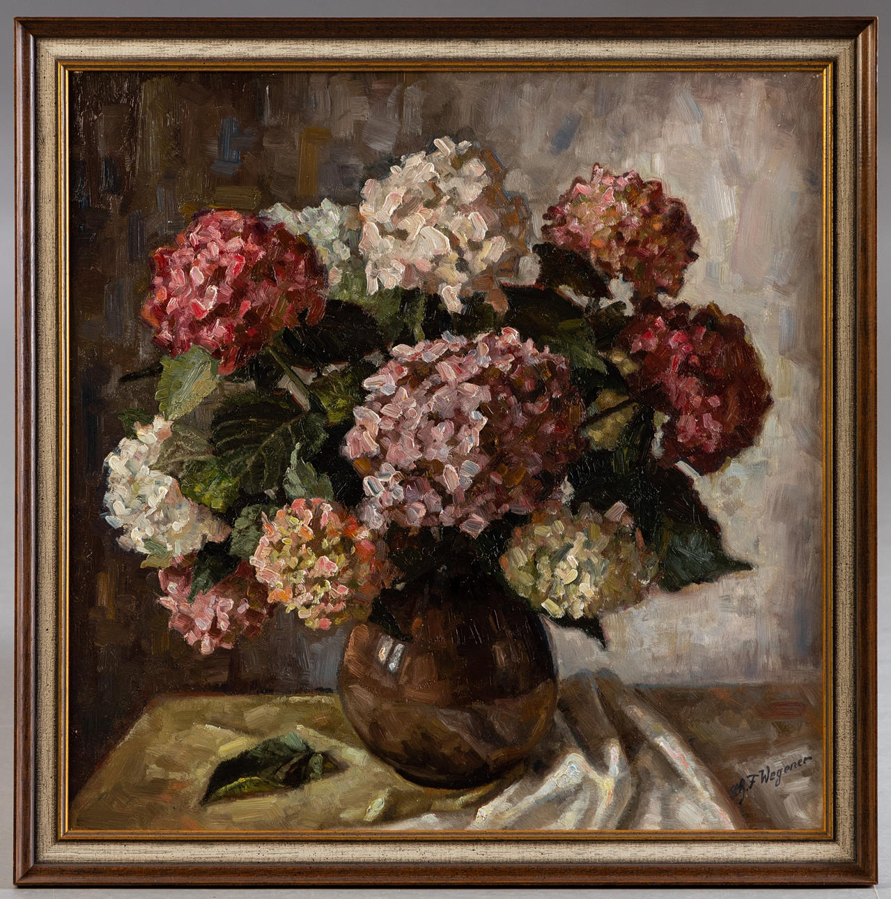 Ch. F. Wegener, Hortensienstrauss, Öl auf Hartfaserplatte, signiert, ca. 56 x 56 cm, mit Rahmen ca. 62 x 62 cm.