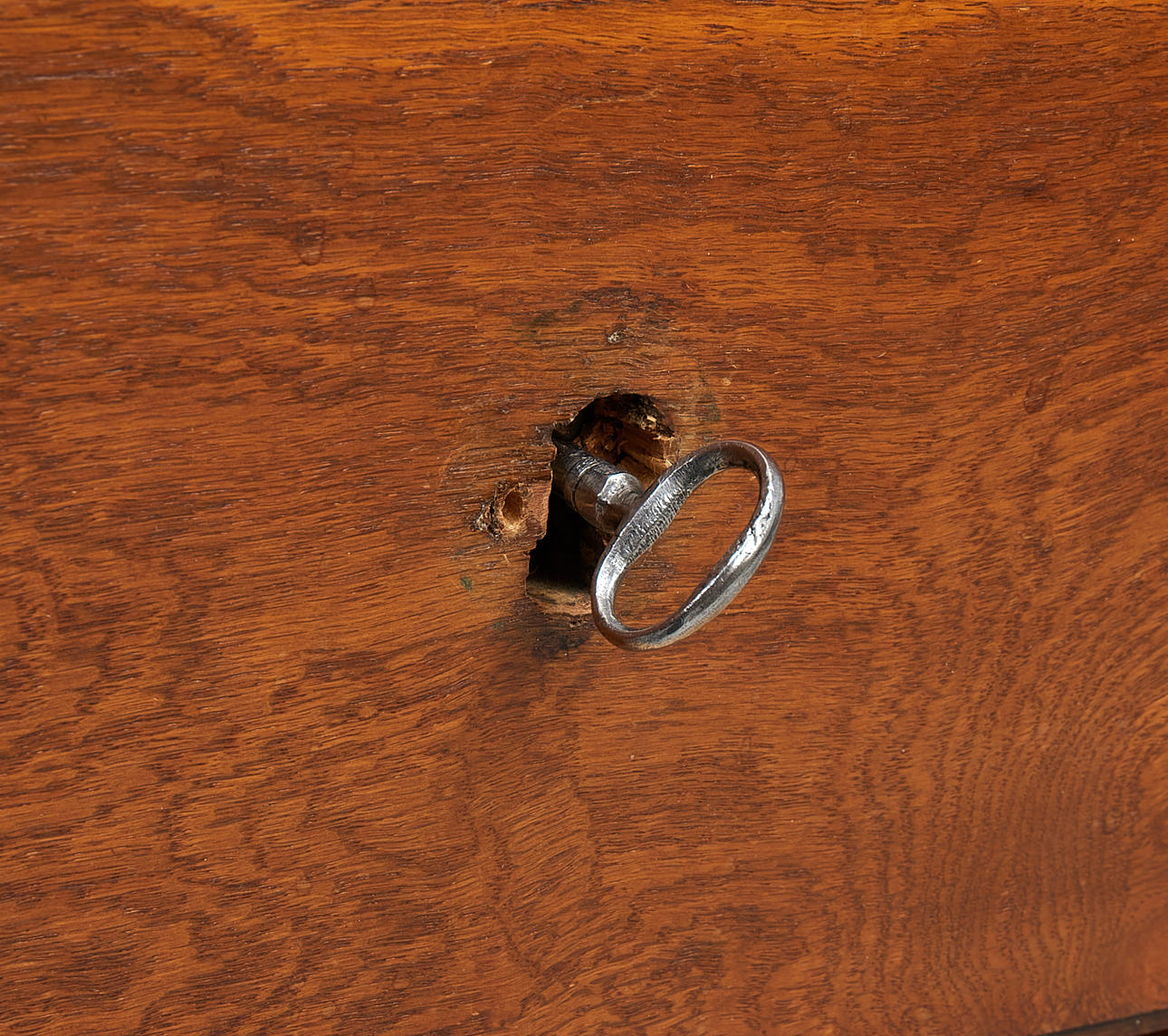 Verschleiß, Kratzer, Schlagspuren, Furnierschäden. Scheibe mit Beule / Kerbe. Beschädigung und fehlende Beschläge am Schlüsselloch der unteren Schublade. 2 Schlüssel dabei, einer für die obere Schublade, einer für die beiden unteren.