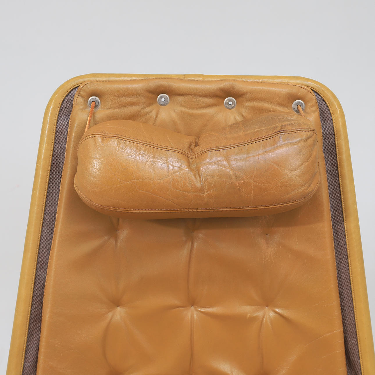 Beine aus verchromtem Metall. Abnehmbares Kissen, loses Nackenkissen. Polsterung aus Leder. Rückenhöhe ca. 98 cm.