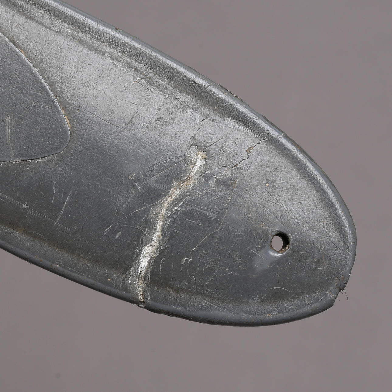 Wanne mit Beschädigung und Reparatur. Tragen. Trockene Risse am Griff.