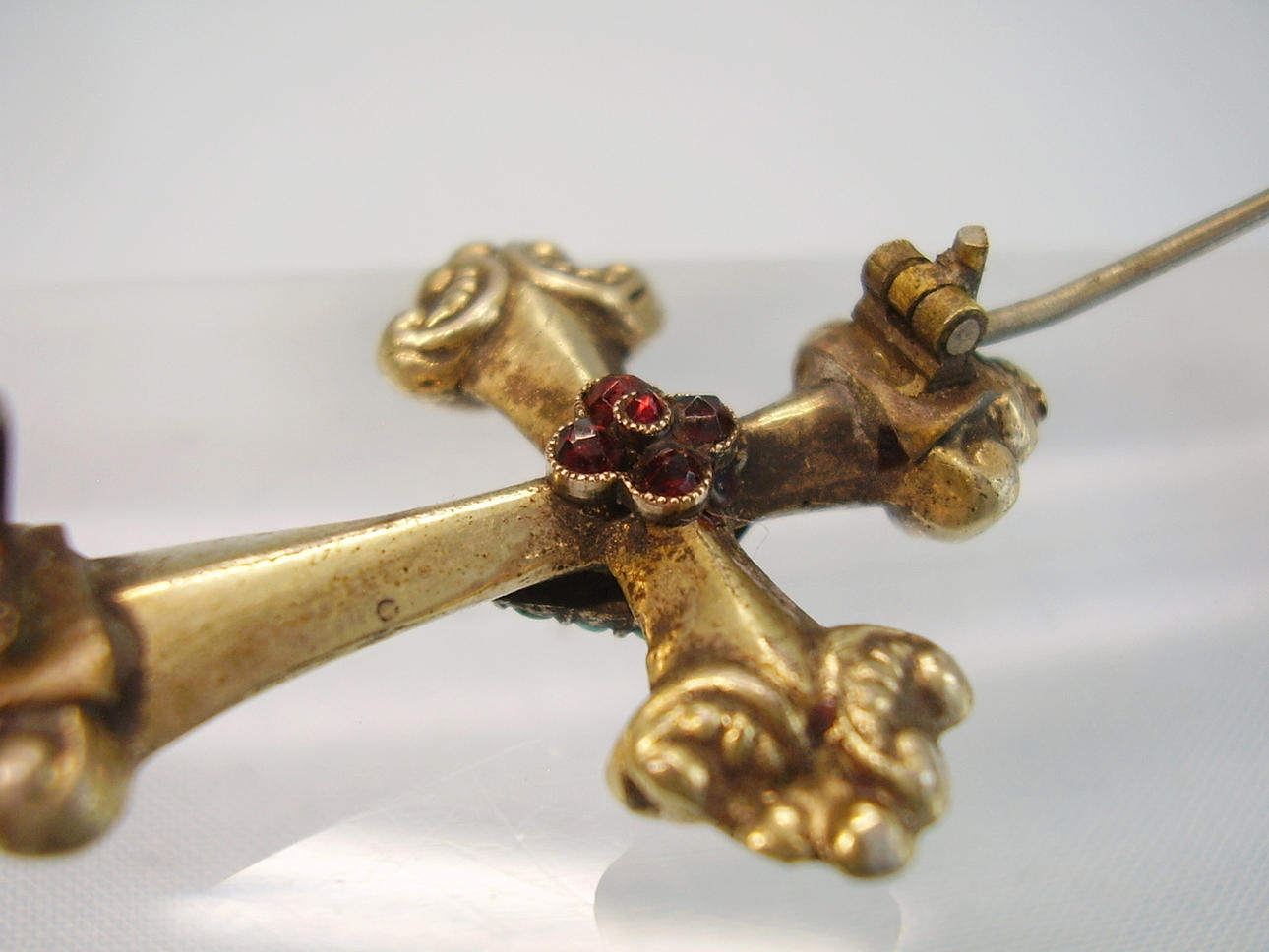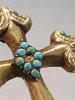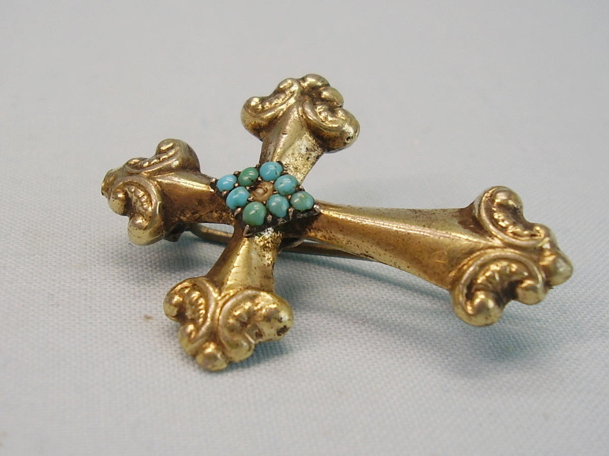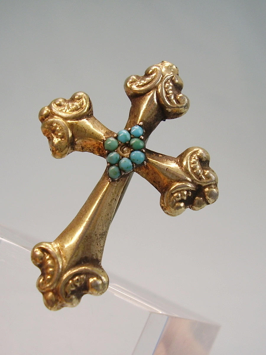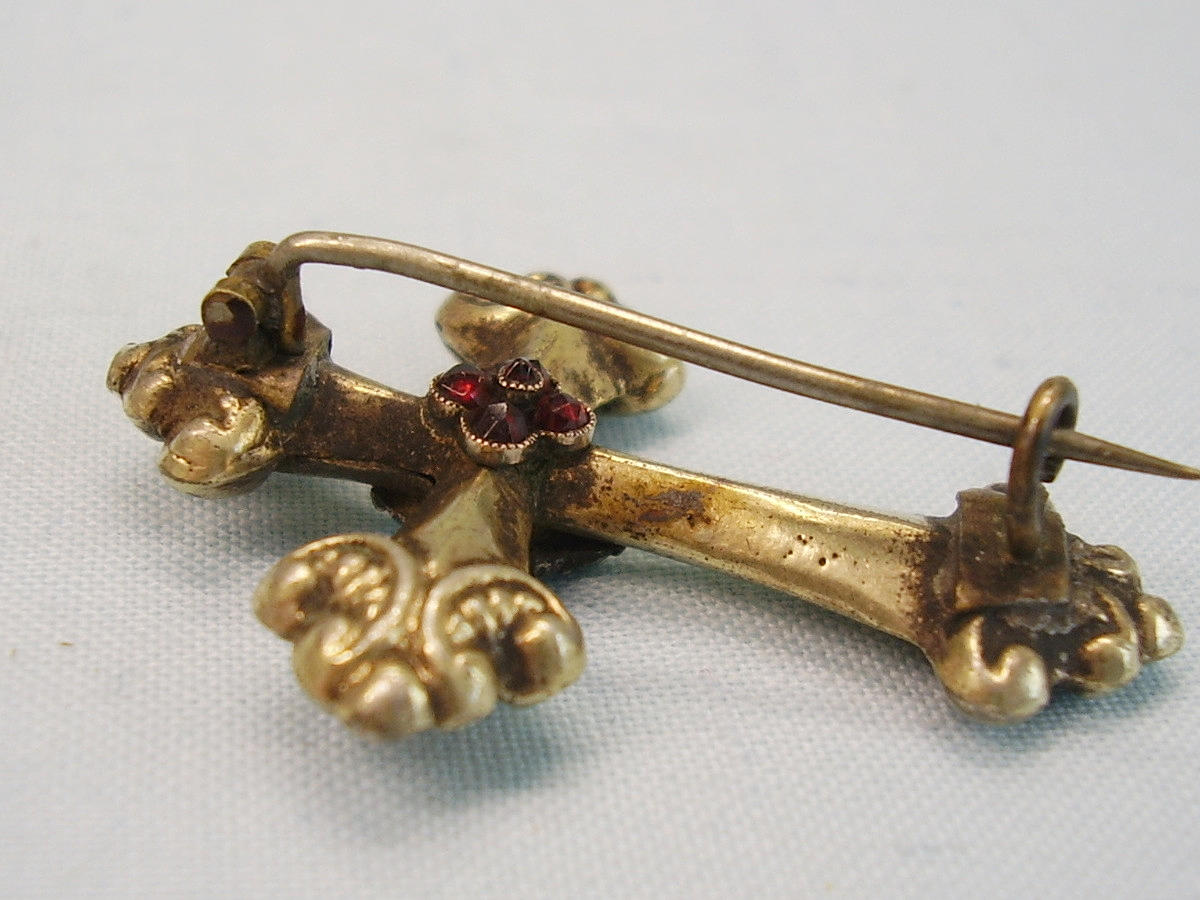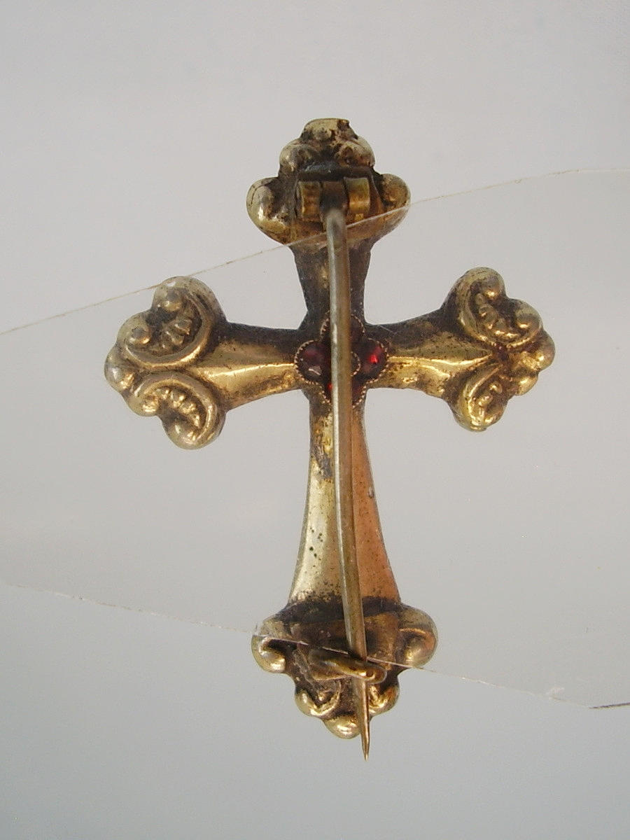 Sie ist als Kreuz ausgeführt und zentral eine Raute mit kleinen Türkisen, die Rückseite trägt eine Rosette aus blutroten böhmischen Granaten im antiken Rosenschliff.