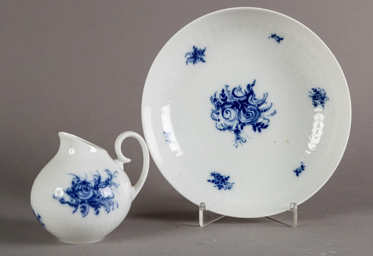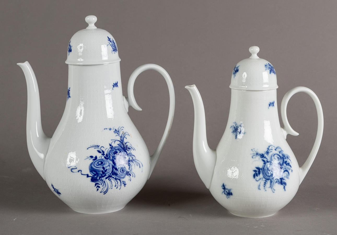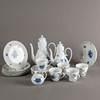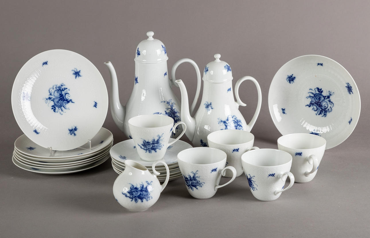 Weißporzellan mit blauer Unterglasurbemalung. 22-teilig bestehend aus 1 Kaffeekanne, 1 Teekanne, 1 Schale, 1 Sahnegießer, 5 Kaffeetassen, 6 Untertassen und 7 Kuchentellern. Unterglasurgrüne Firmenmarke.