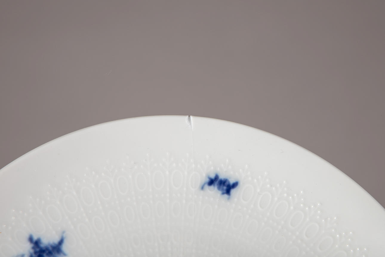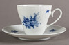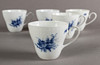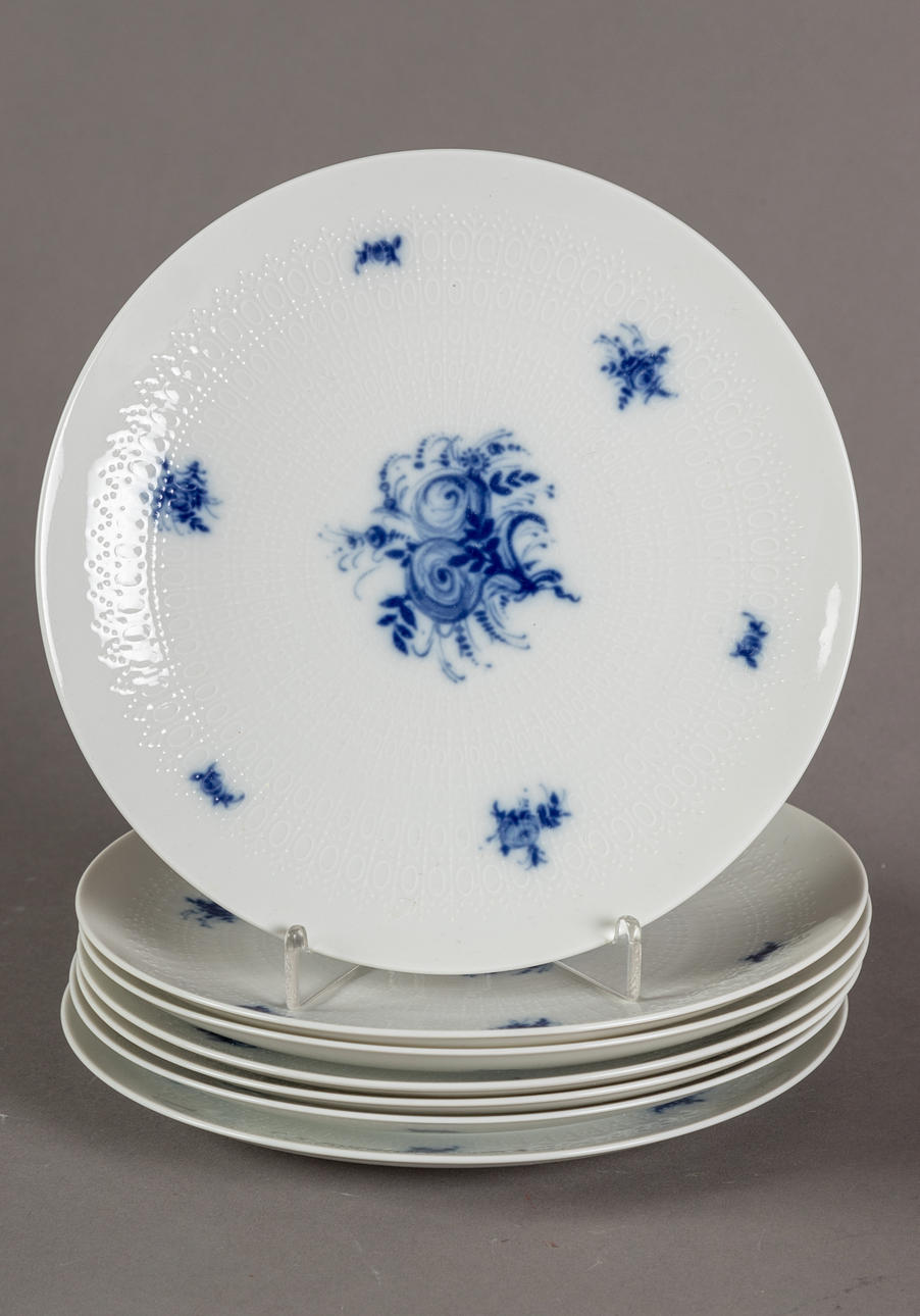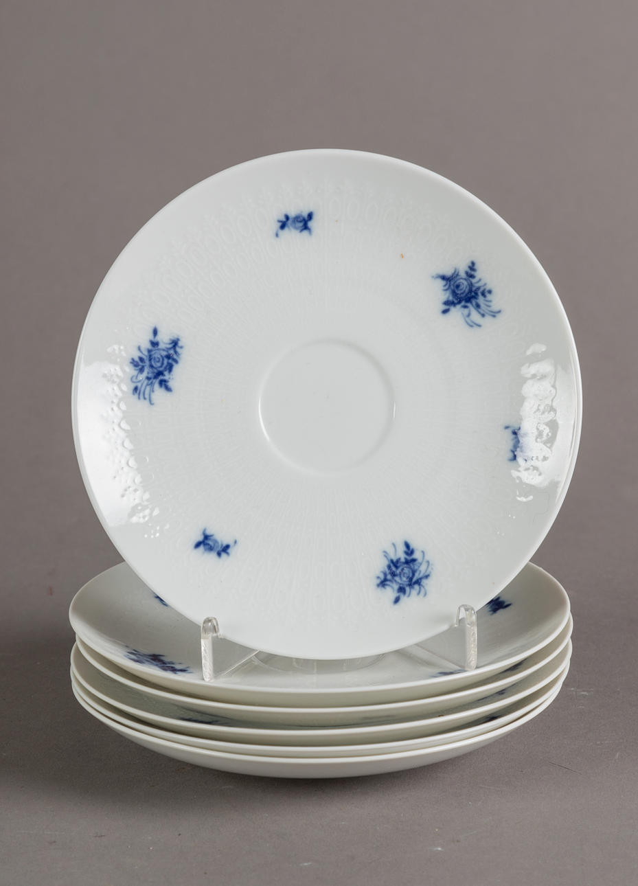 Weißporzellan mit blauer Unterglasurbemalung. 22-teilig bestehend aus 1 Kaffeekanne, 1 Teekanne, 1 Schale, 1 Sahnegießer, 5 Kaffeetassen, 6 Untertassen und 7 Kuchentellern. Unterglasurgrüne Firmenmarke.