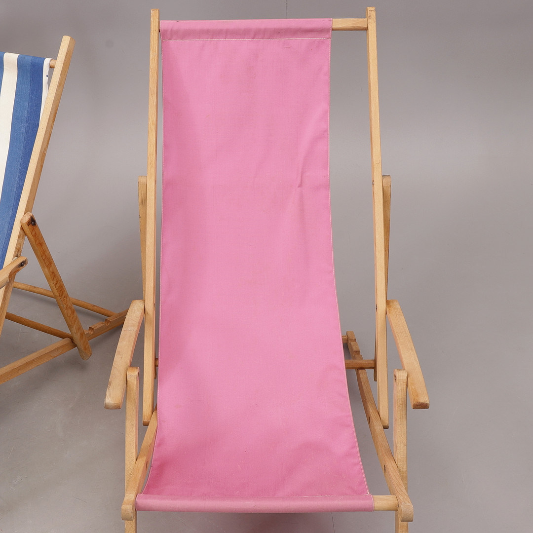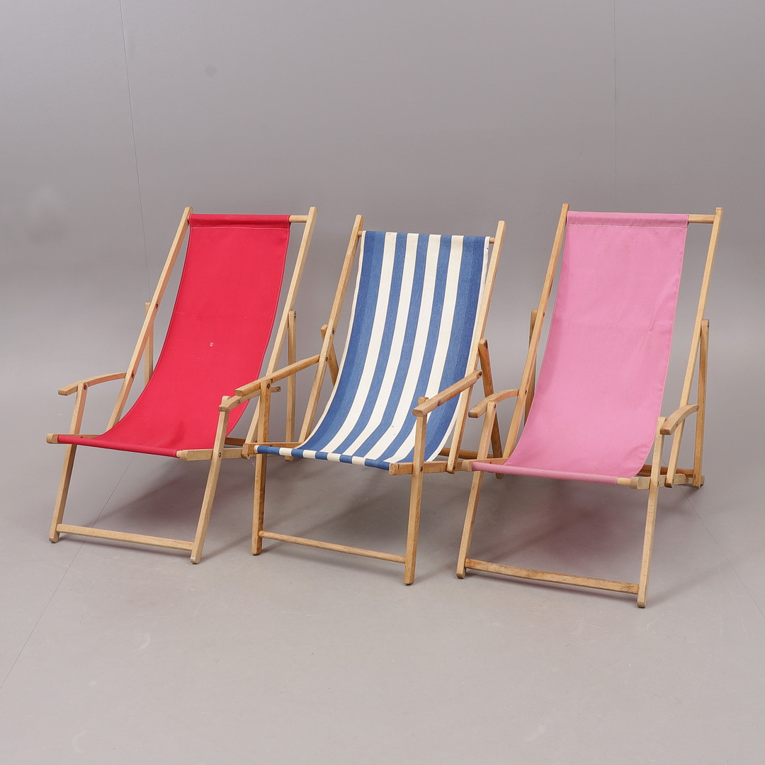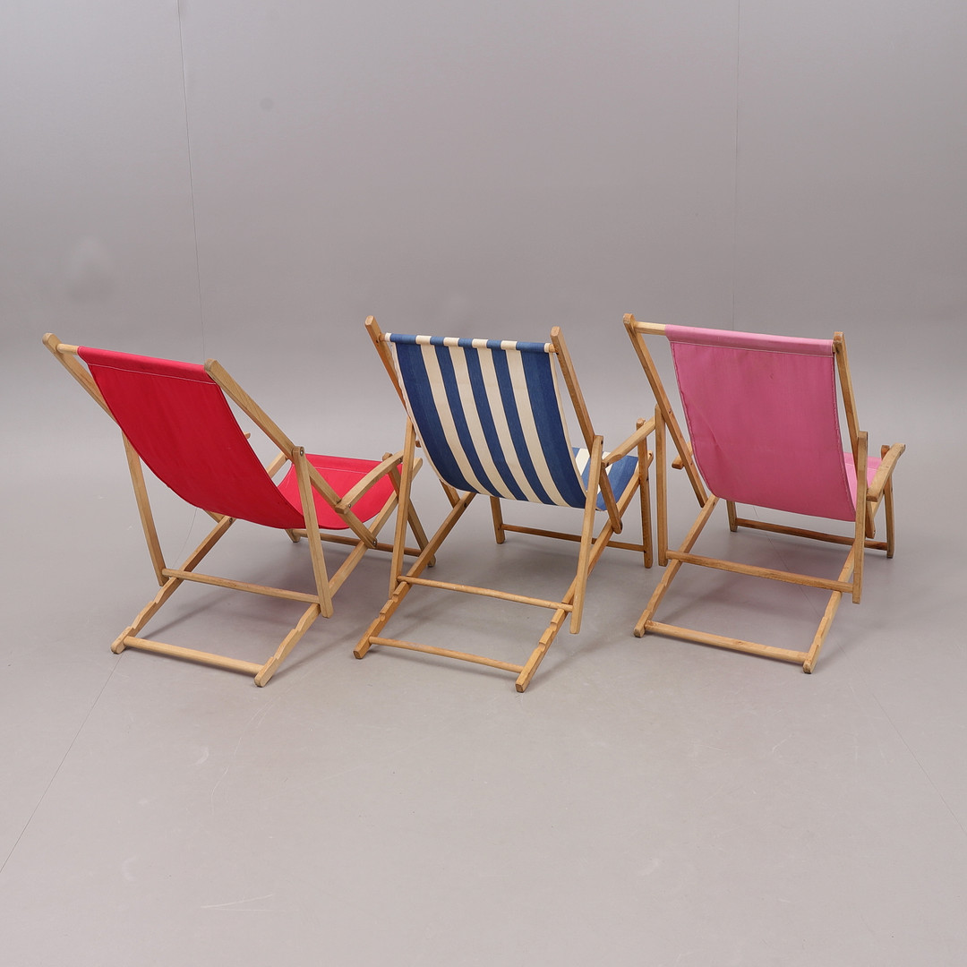 2166047. SONNENSTÜHLE, 3 Stück, faltbar, Holz/Stoff, 1900er Jahre.