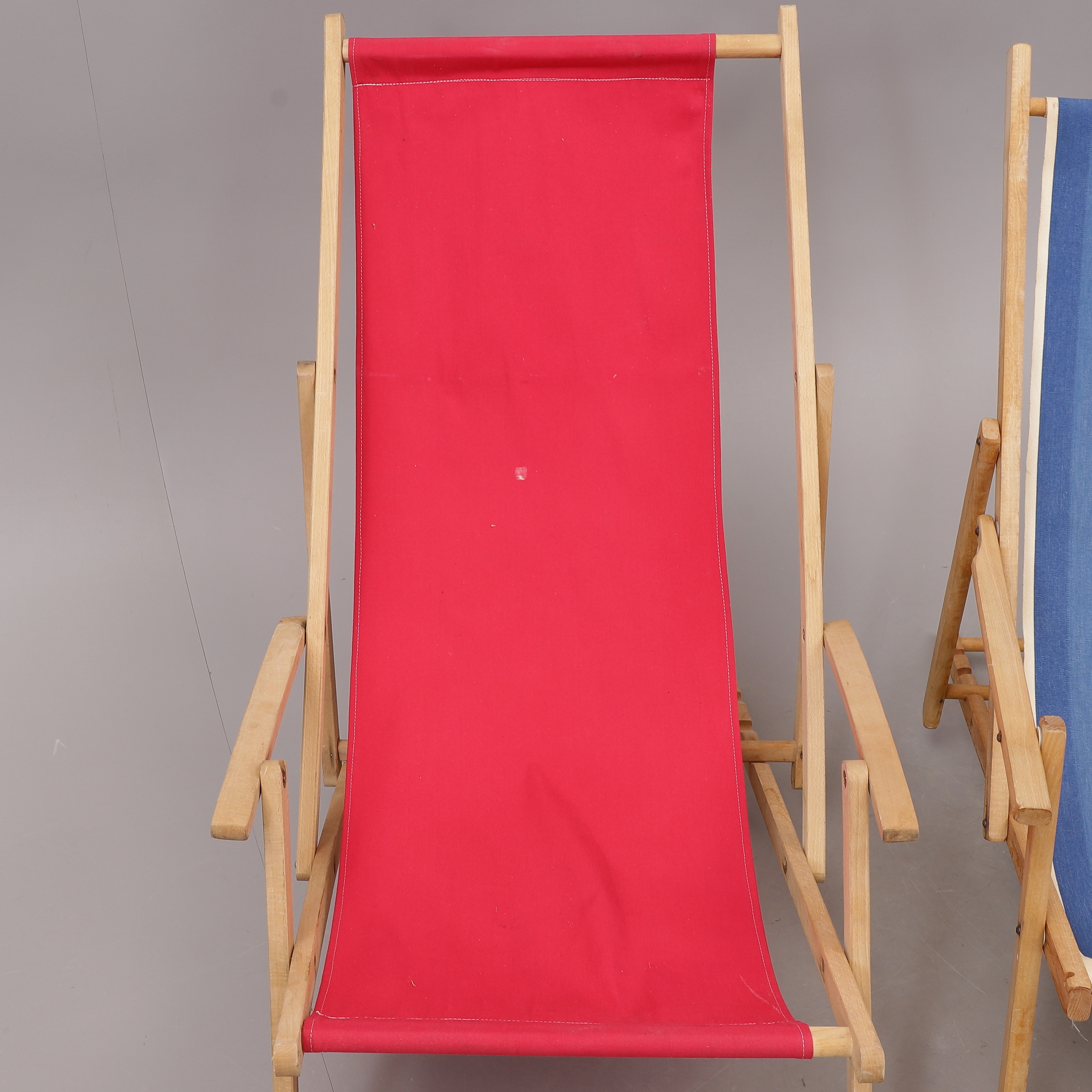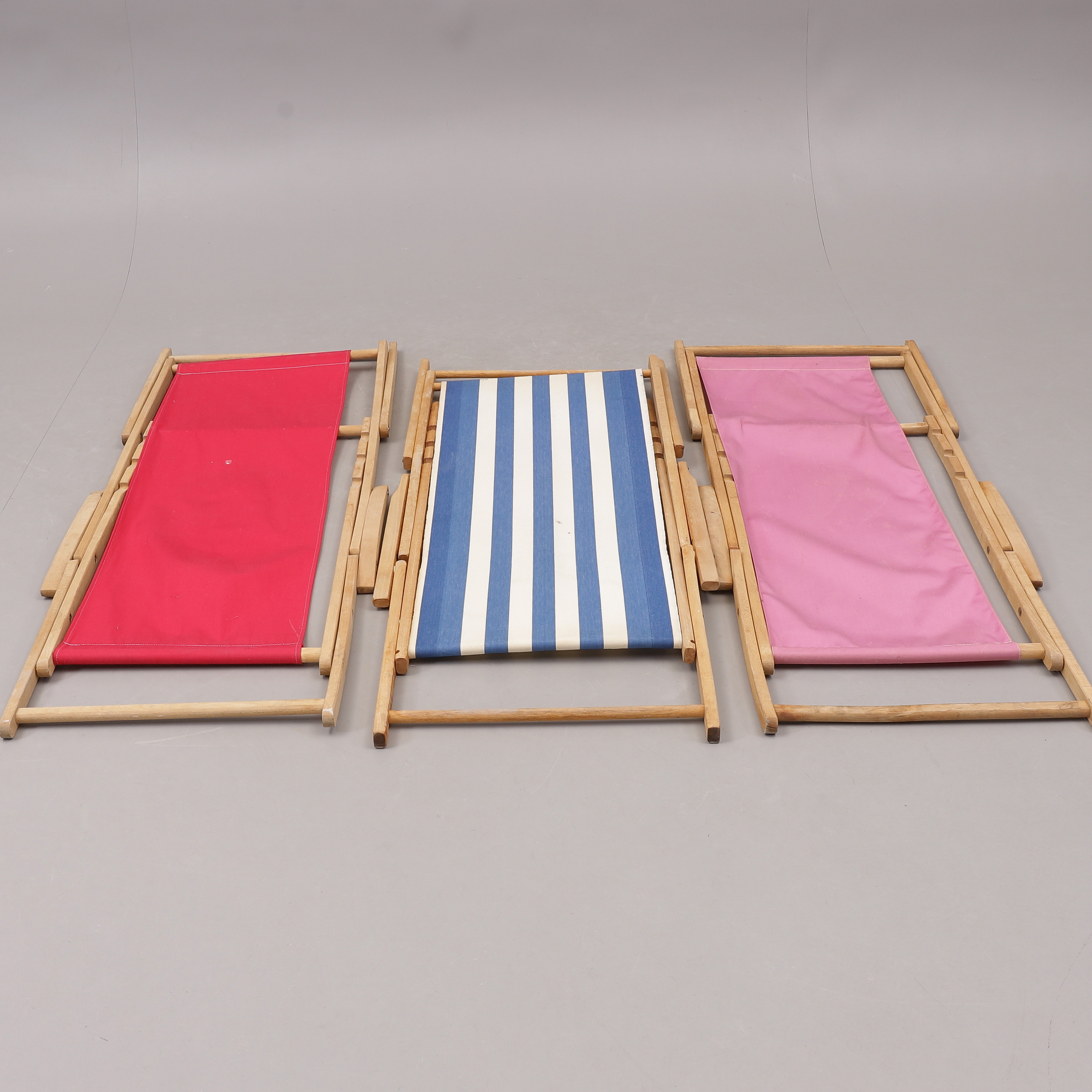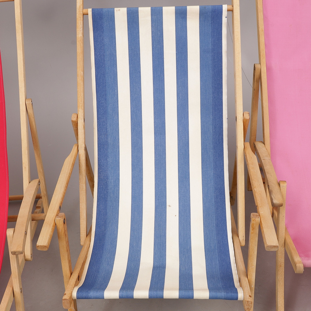 2166047. SONNENSTÜHLE, 3 Stück, faltbar, Holz/Stoff, 1900er Jahre.