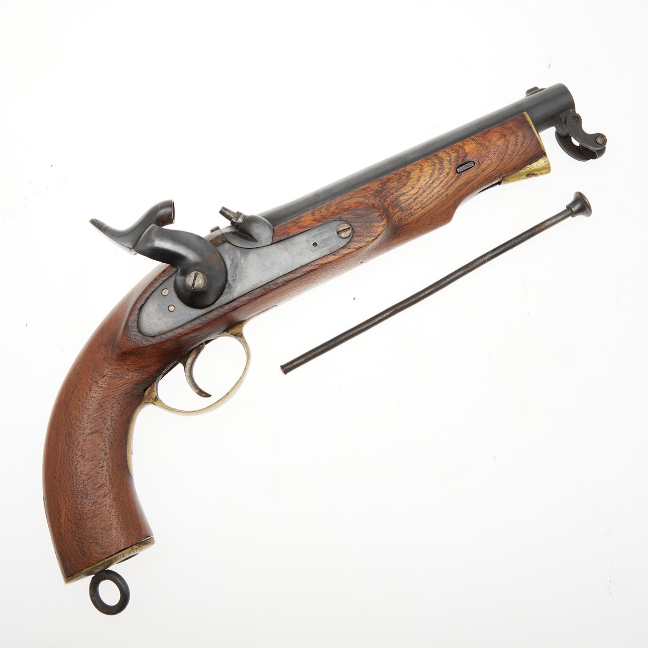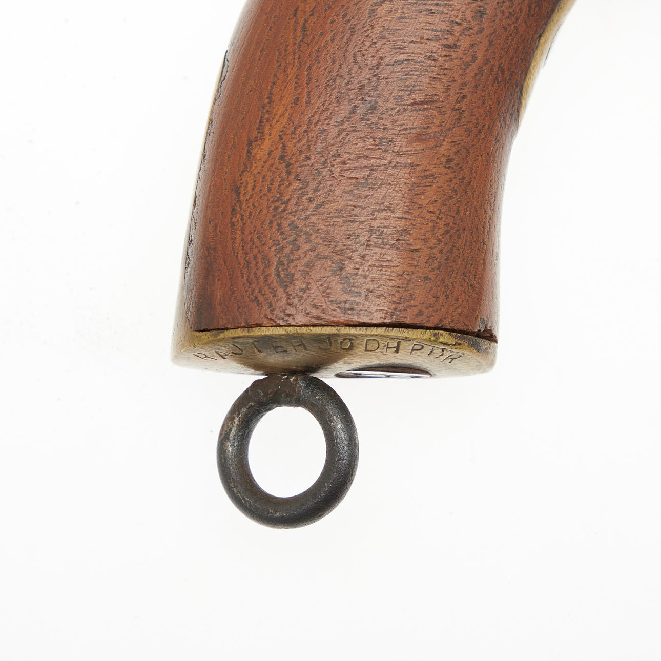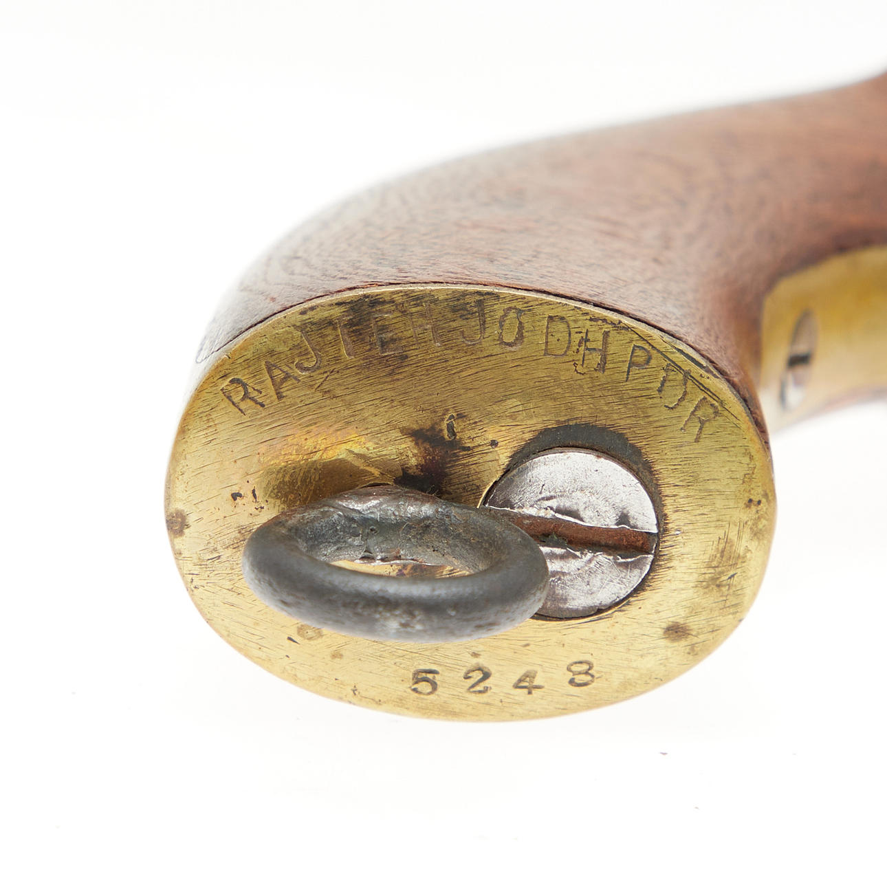 Vorderlader-Pistole, Tower, 2. Hälfte 19. Jahrhundert. Vorderlader-Pistole mit Perkussionsmechanismus, runder Lauf mit Korn, Nussholzschaft mit brünierter eiserner Garnitur, Abzugsbügel aus Messing, Riemenöse und schwenkbarem Ladestock, Kolbenbeschlag mit 'Rajteh Jodhpur' und '5248' geprägt, L.37cm.