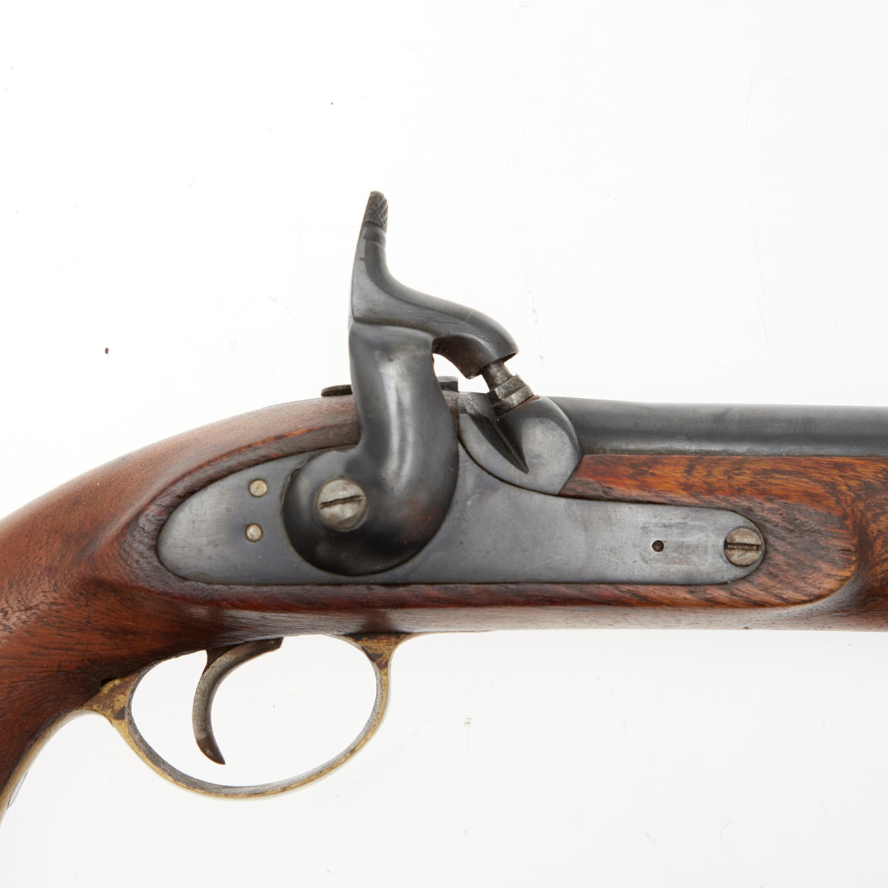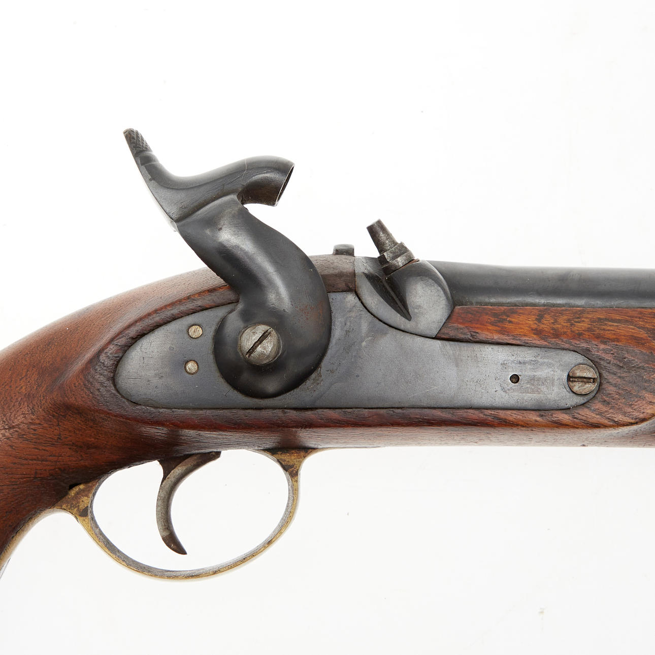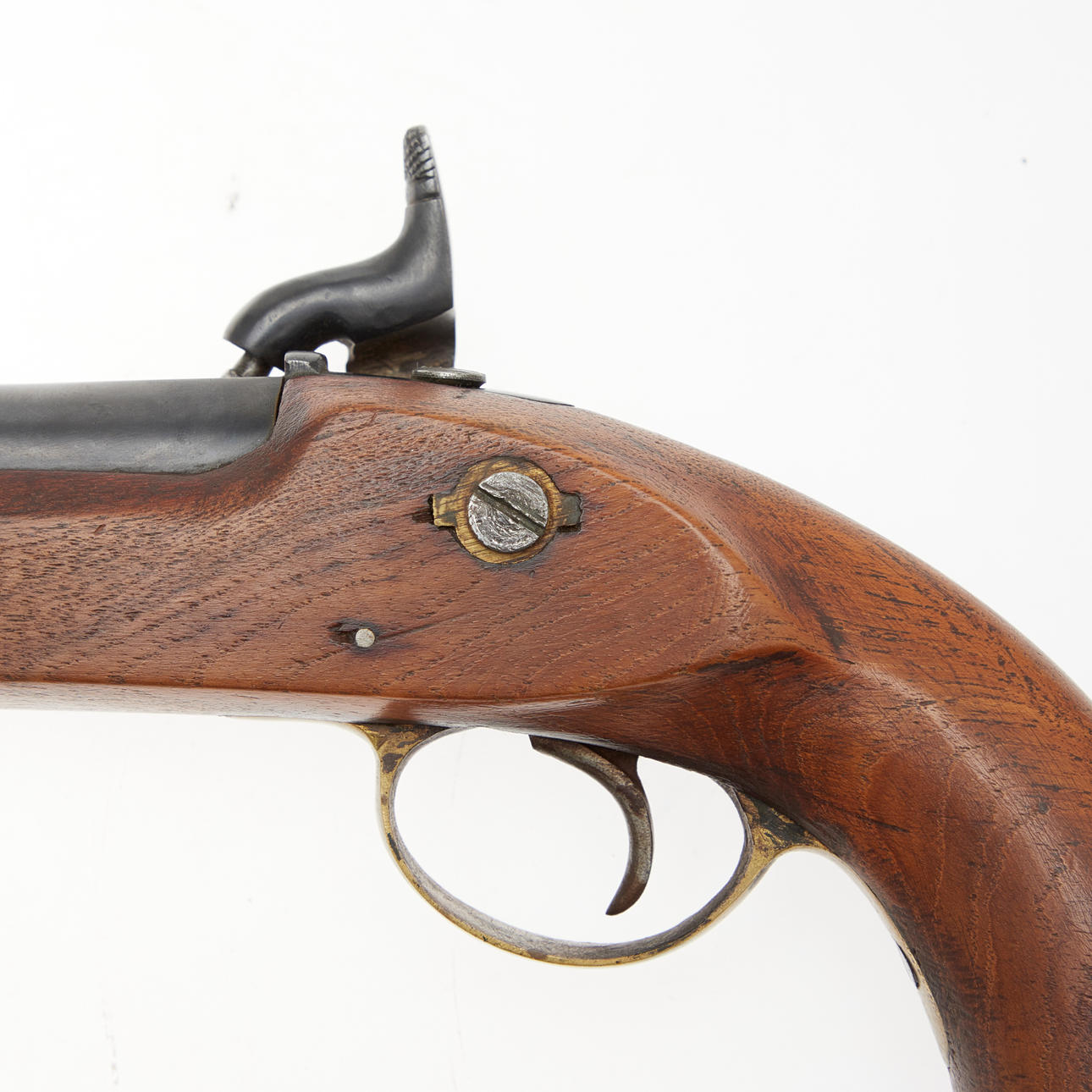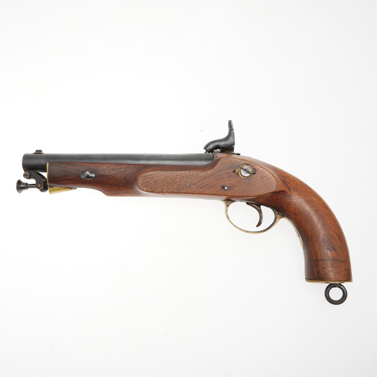 Vorderlader-Pistole, Tower, 2. Hälfte 19. Jahrhundert. Vorderlader-Pistole mit Perkussionsmechanismus, runder Lauf mit Korn, Nussholzschaft mit brünierter eiserner Garnitur, Abzugsbügel aus Messing, Riemenöse und schwenkbarem Ladestock, Kolbenbeschlag mit 'Rajteh Jodhpur' und '5248' geprägt, L.37cm.