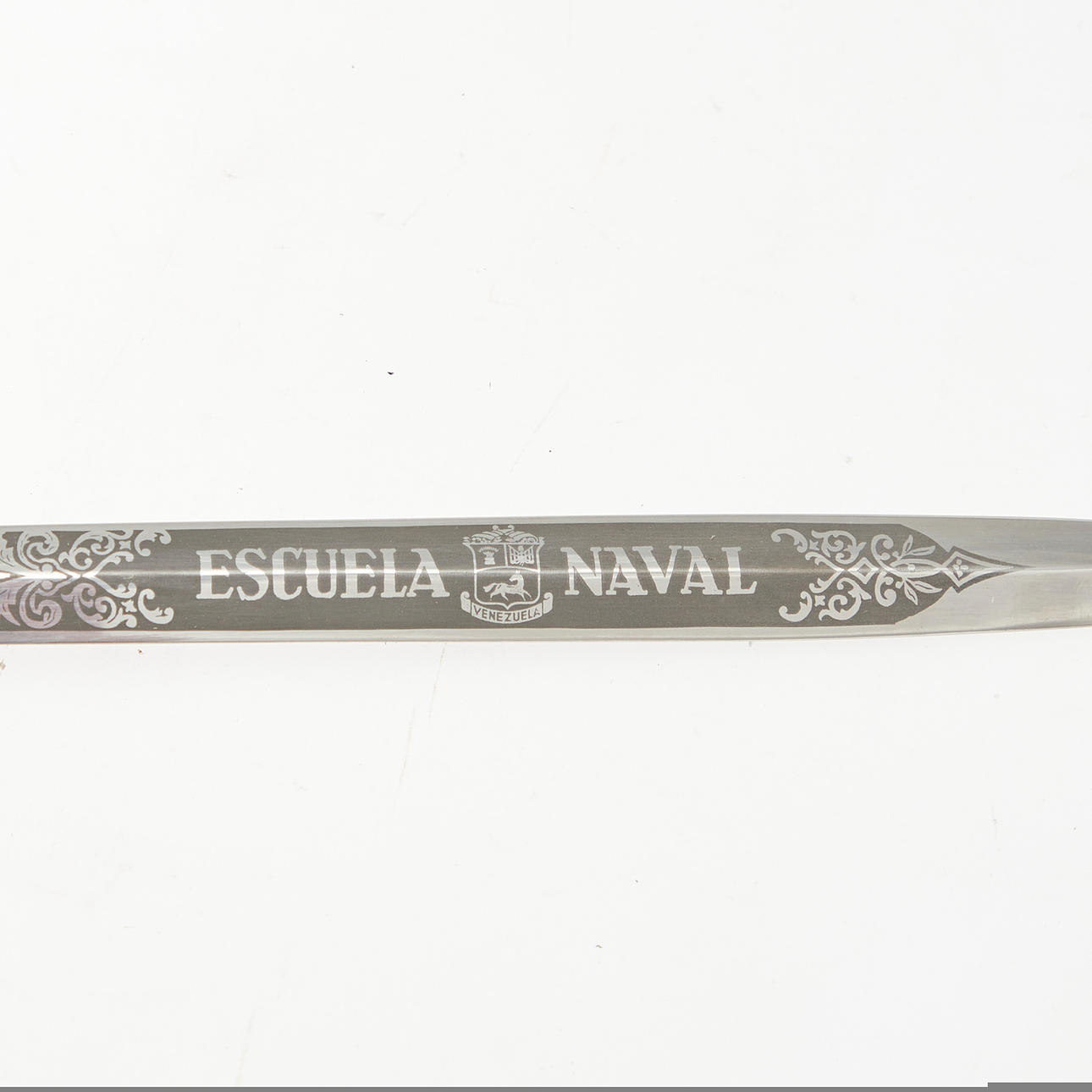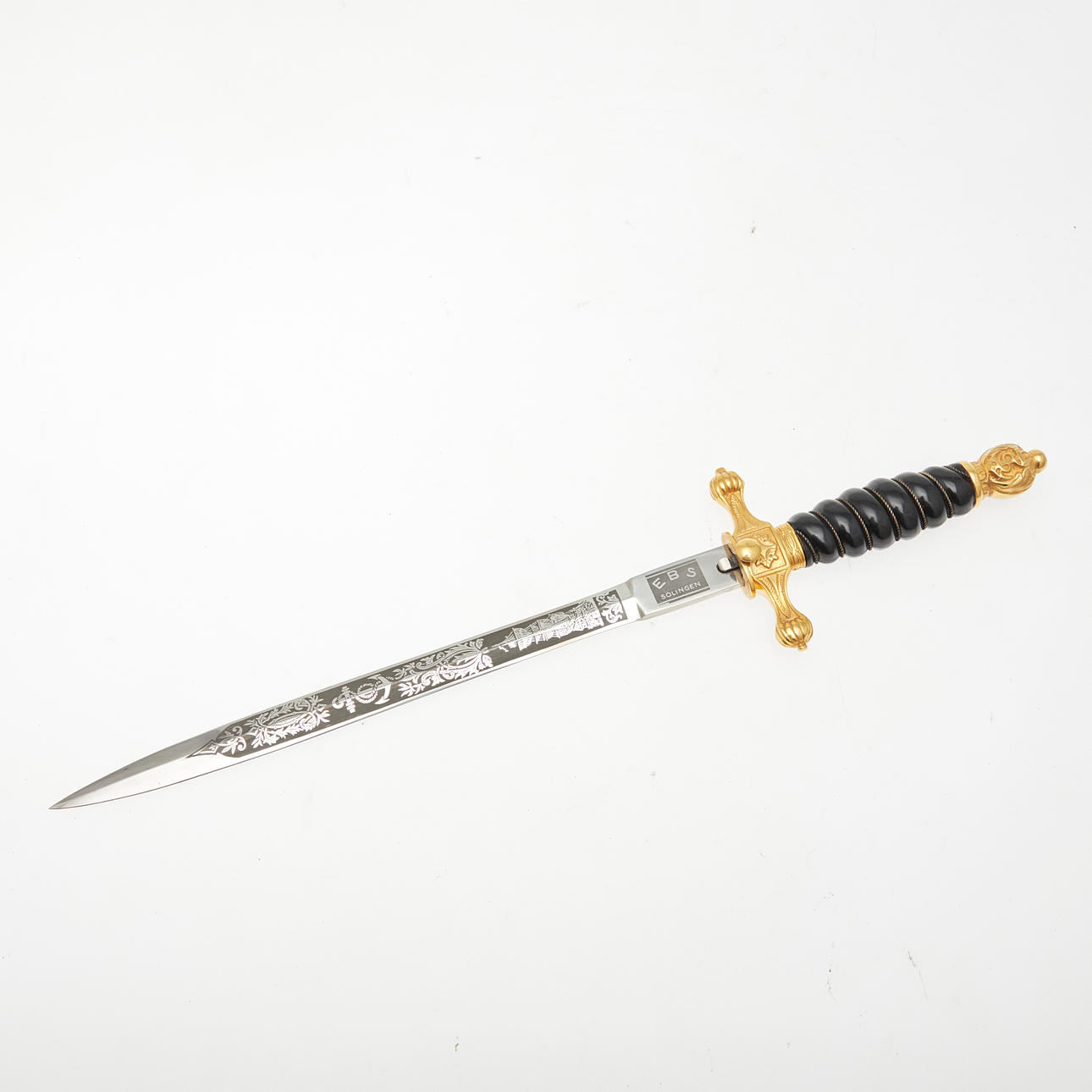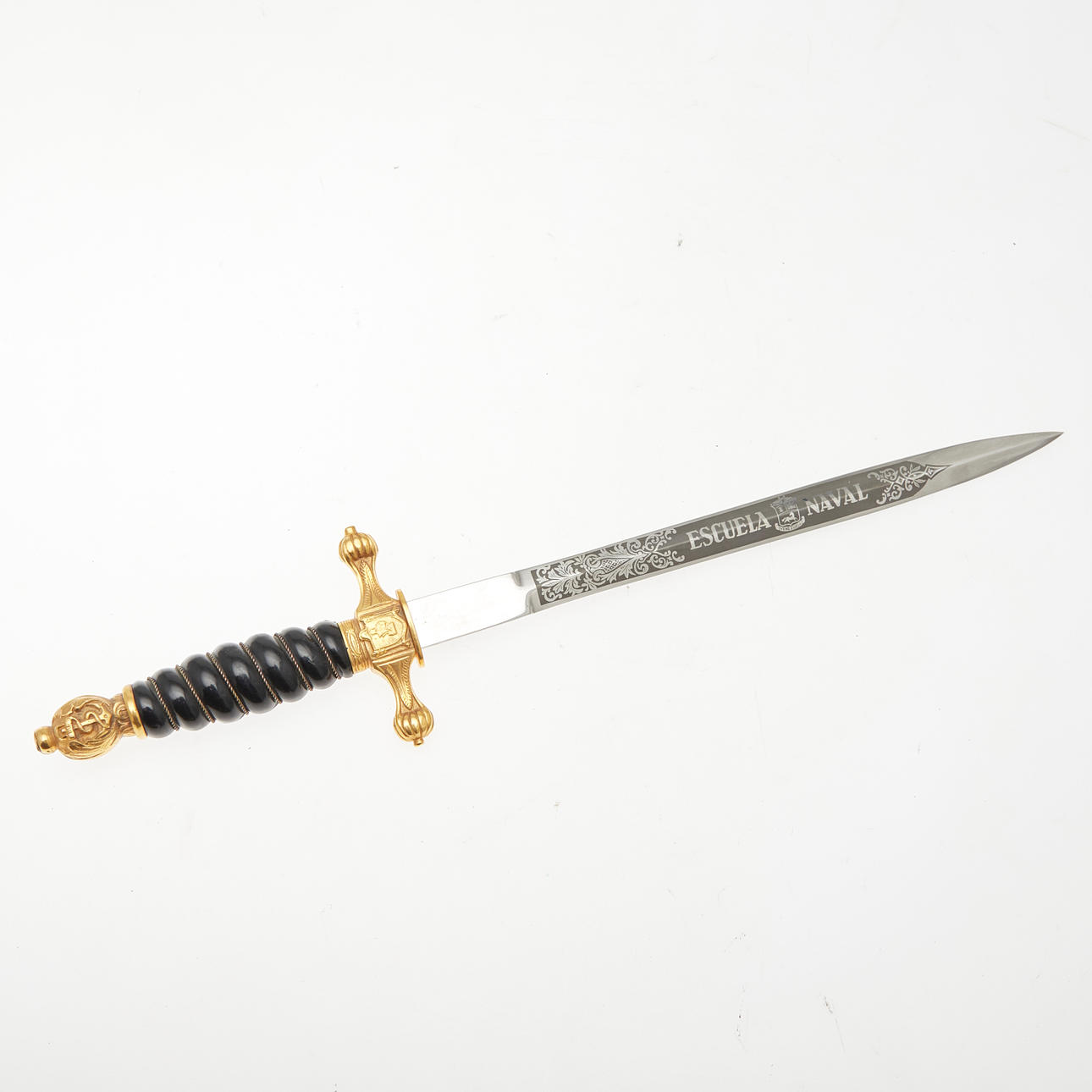 Dolch der venezolanischen Marine, 20. Jahrhundert, Solingen. Dolch mit einer vernickelten Klinge mit einseitiger Ätzung 'Escuela Naval', gewundenes Heft aus schwarzem Kunststoff mit Drahtwicklung, Parierstange und Knauf aus Messing mit Marine-Reliefs, sowie Arretierknopf, geschwärzte Lederscheide mit Messingbeschlägen und zwei beweglichen Trageringen, unterseitig der Parierstange mit 'EBS Solingen' geätzt, L.37,5cm, Klingenlänge: 24,5cm, Klingenbreite: 21mm.