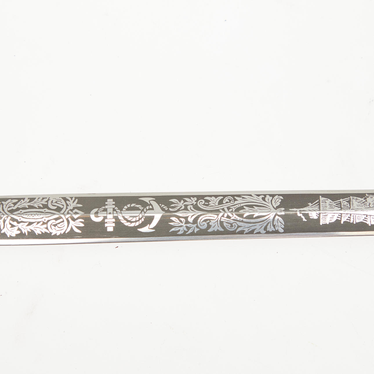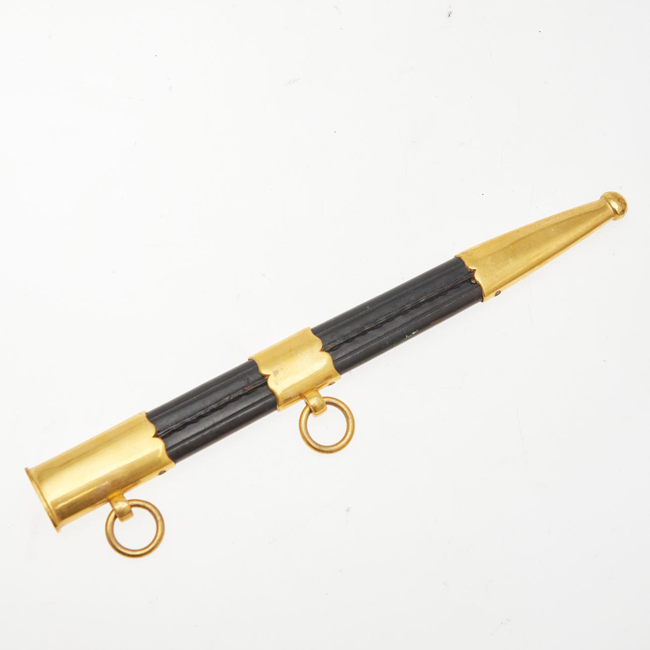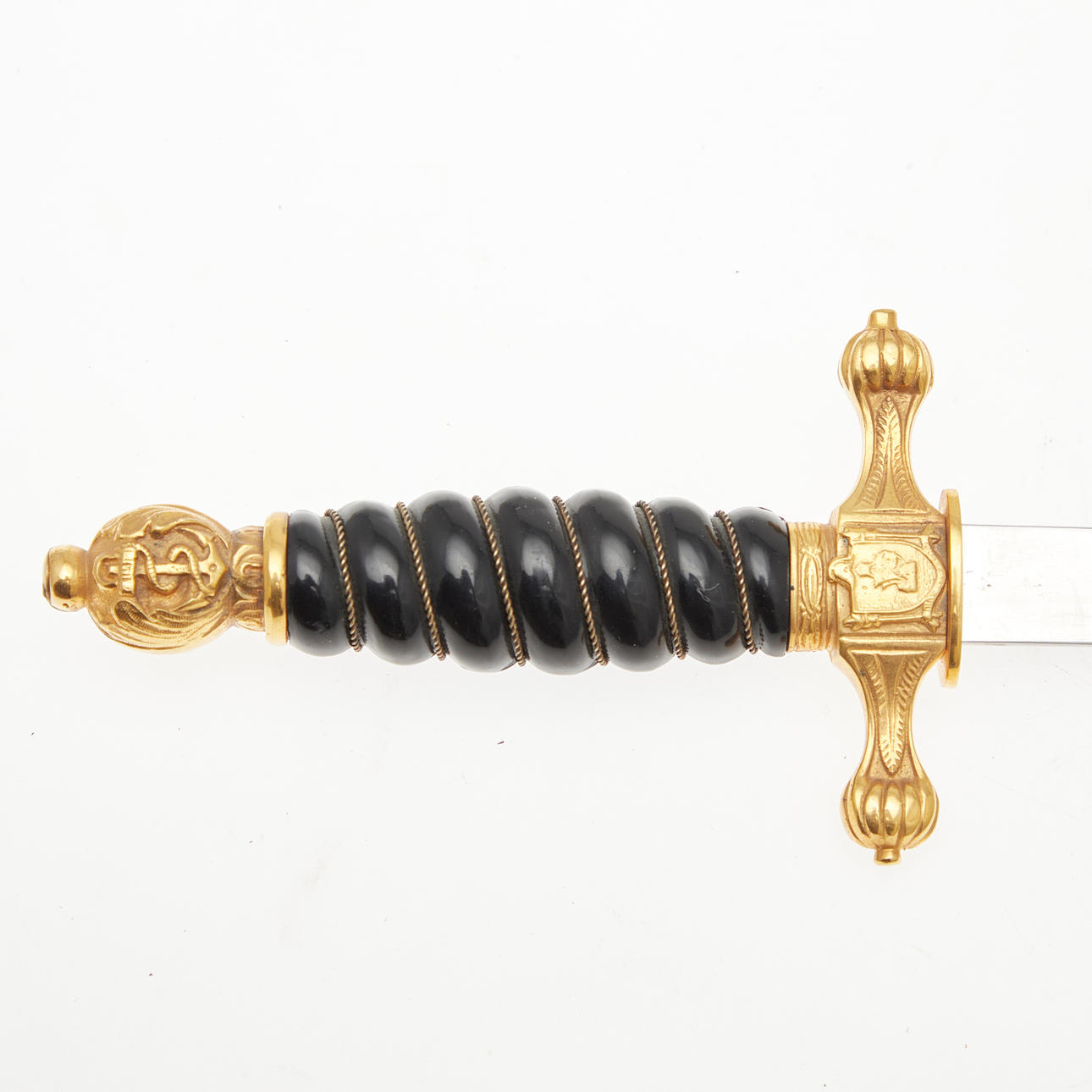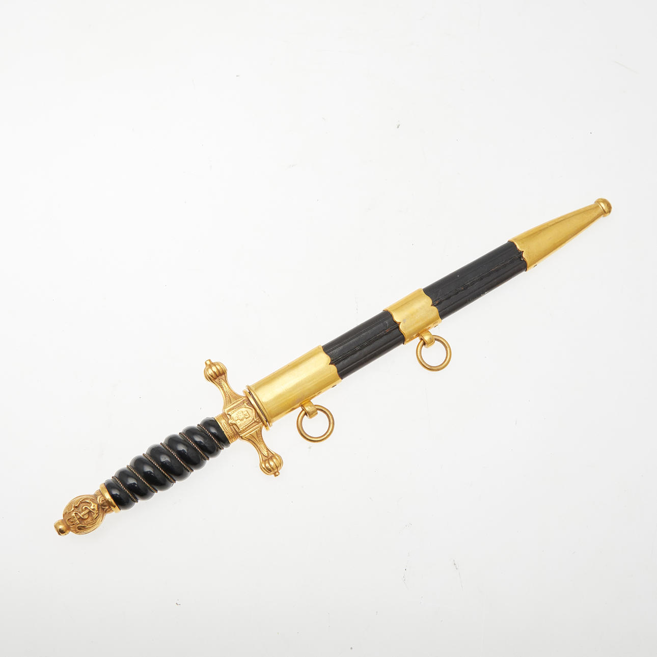 Dolch der venezolanischen Marine, 20. Jahrhundert, Solingen. Dolch mit einer vernickelten Klinge mit einseitiger Ätzung 'Escuela Naval', gewundenes Heft aus schwarzem Kunststoff mit Drahtwicklung, Parierstange und Knauf aus Messing mit Marine-Reliefs, sowie Arretierknopf, geschwärzte Lederscheide mit Messingbeschlägen und zwei beweglichen Trageringen, unterseitig der Parierstange mit 'EBS Solingen' geätzt, L.37,5cm, Klingenlänge: 24,5cm, Klingenbreite: 21mm.