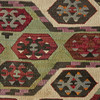Kelim / Teppich, Stoff. Handgewebter Teppich aus Garn und Faden mit einem geometrischen Hexagonmuster in polychromer Farbgebung, an den Längsseiten mit Fransen versehen, 196x143cm.