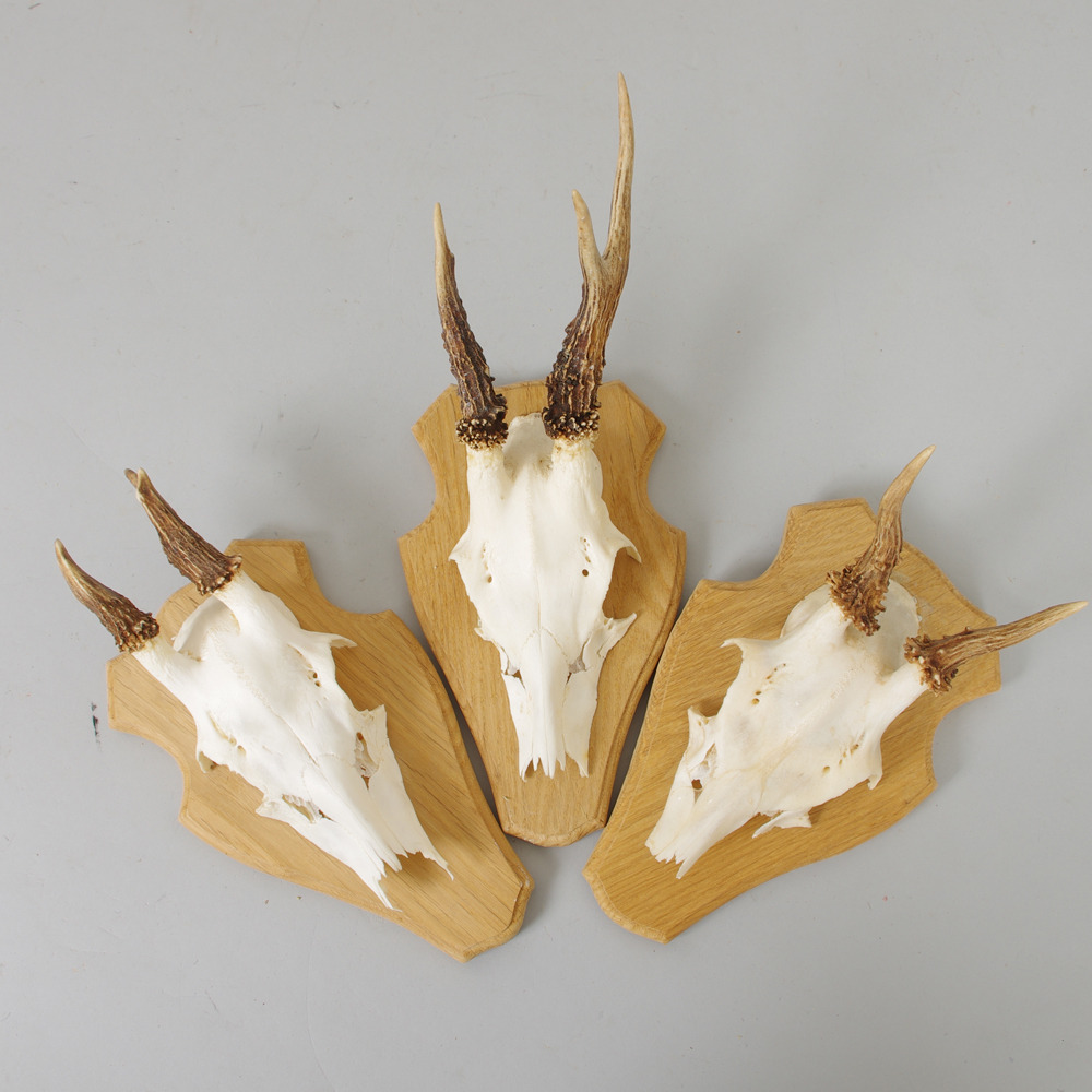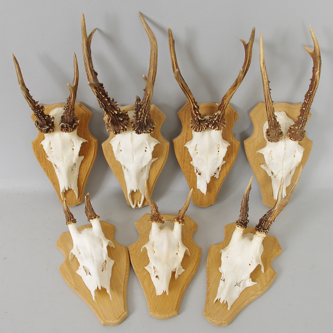 218304. JAGDTROPHÄEN, 7 Stück auf Holzschilden.