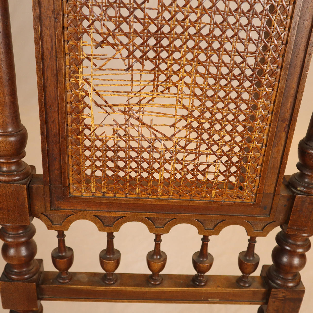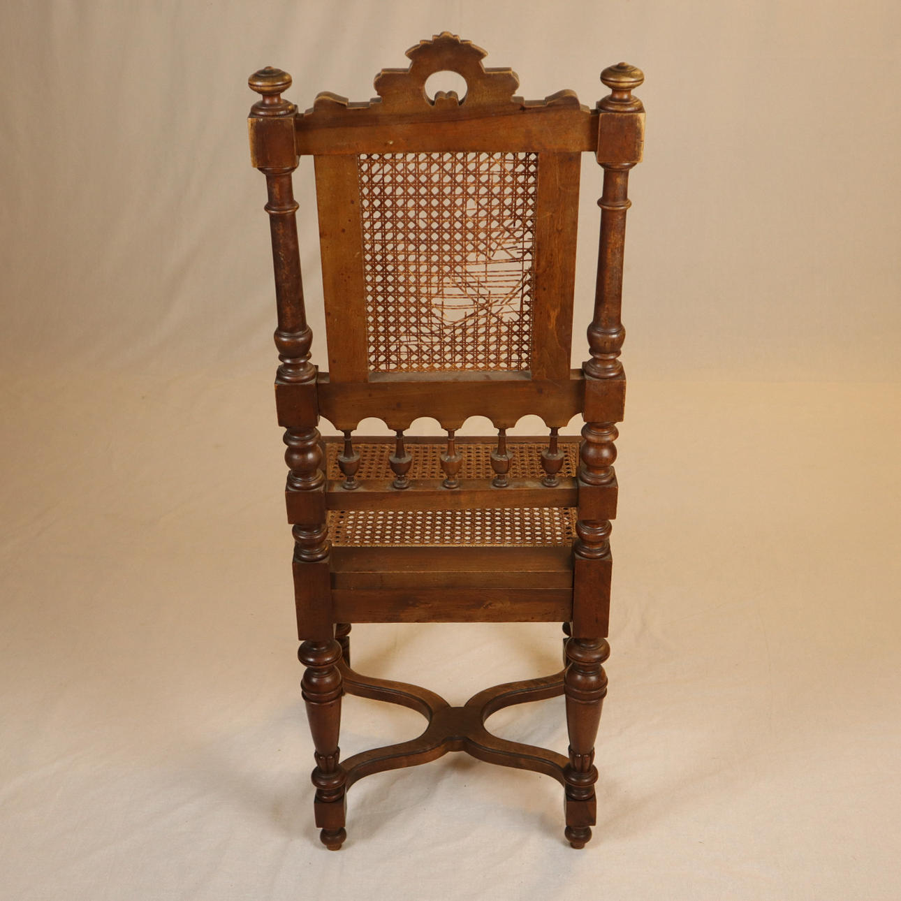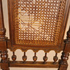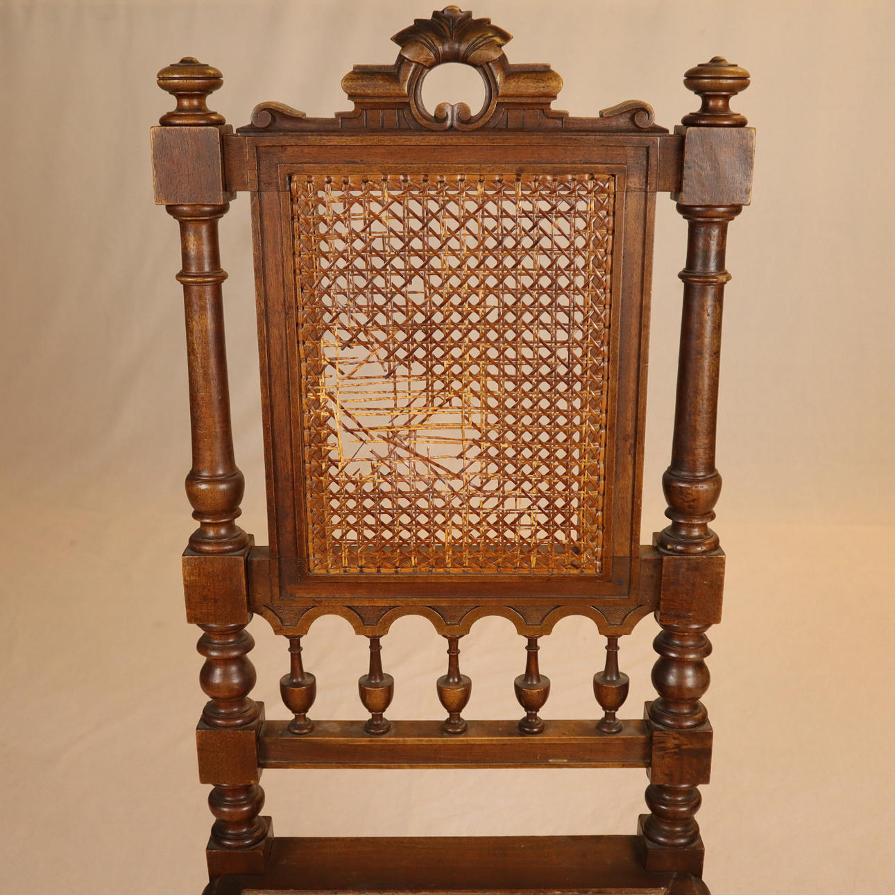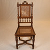 Eiche, Rückenlehne mit floralem Schnitzdekor, Rückenlehne und sitzfläche mit Rohrgeflecht, Fuße vorne gedrechselt und gerillt, Beine mit Verstrebung, H: Rückenlehne/Sitz: ca. 108/47 cm.