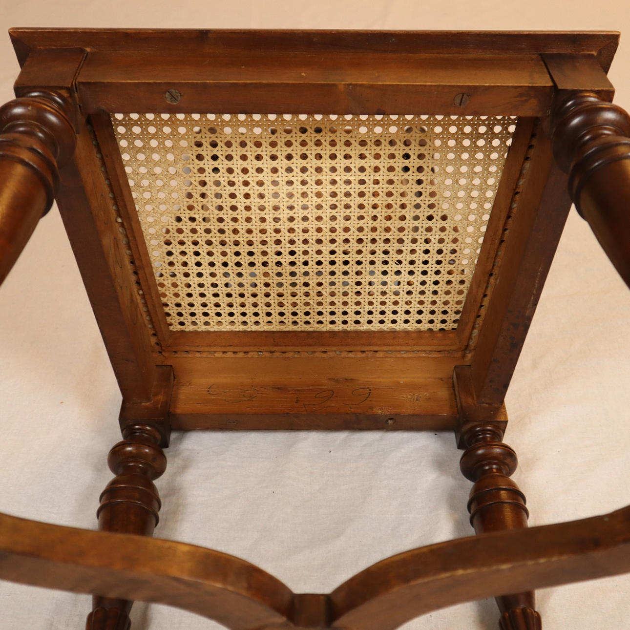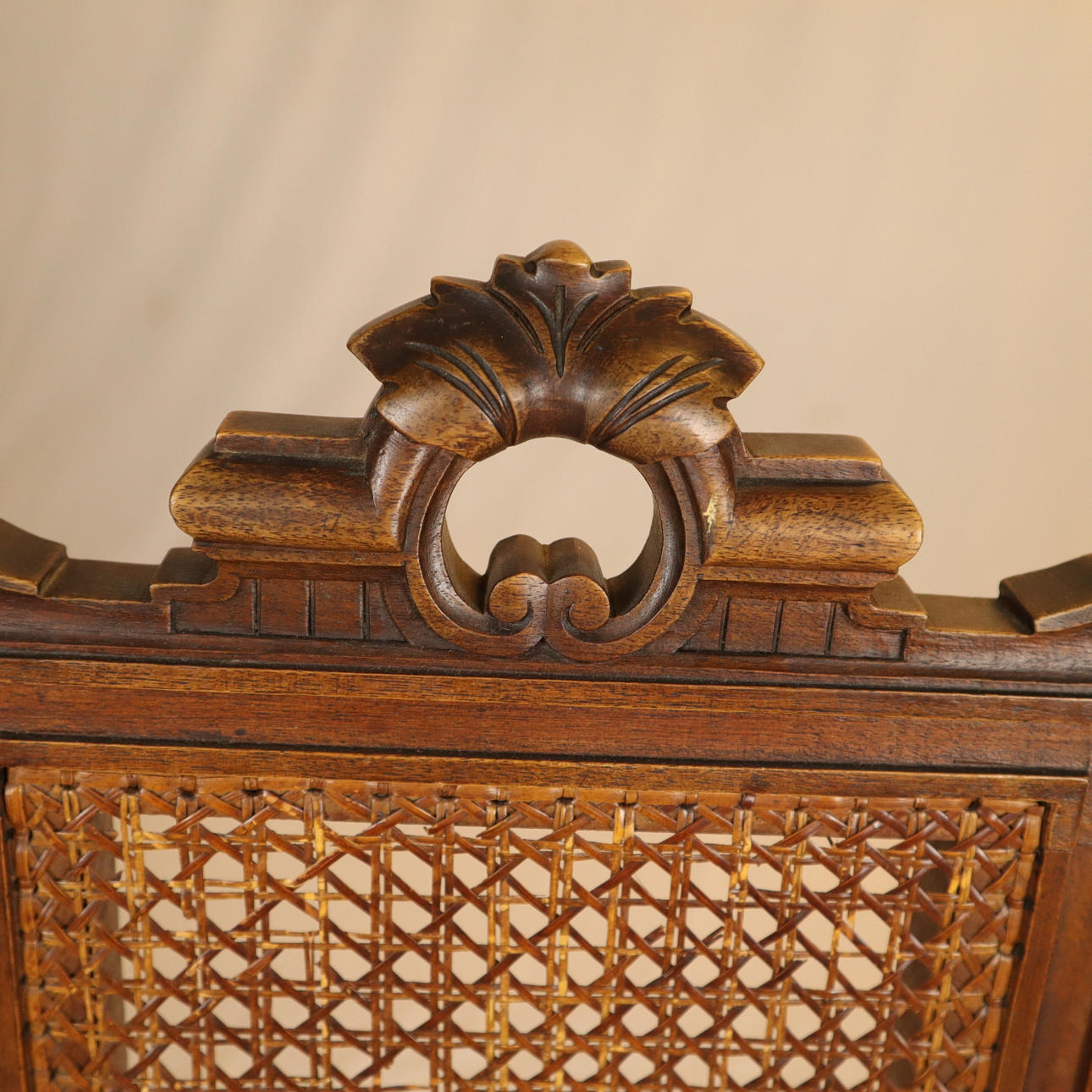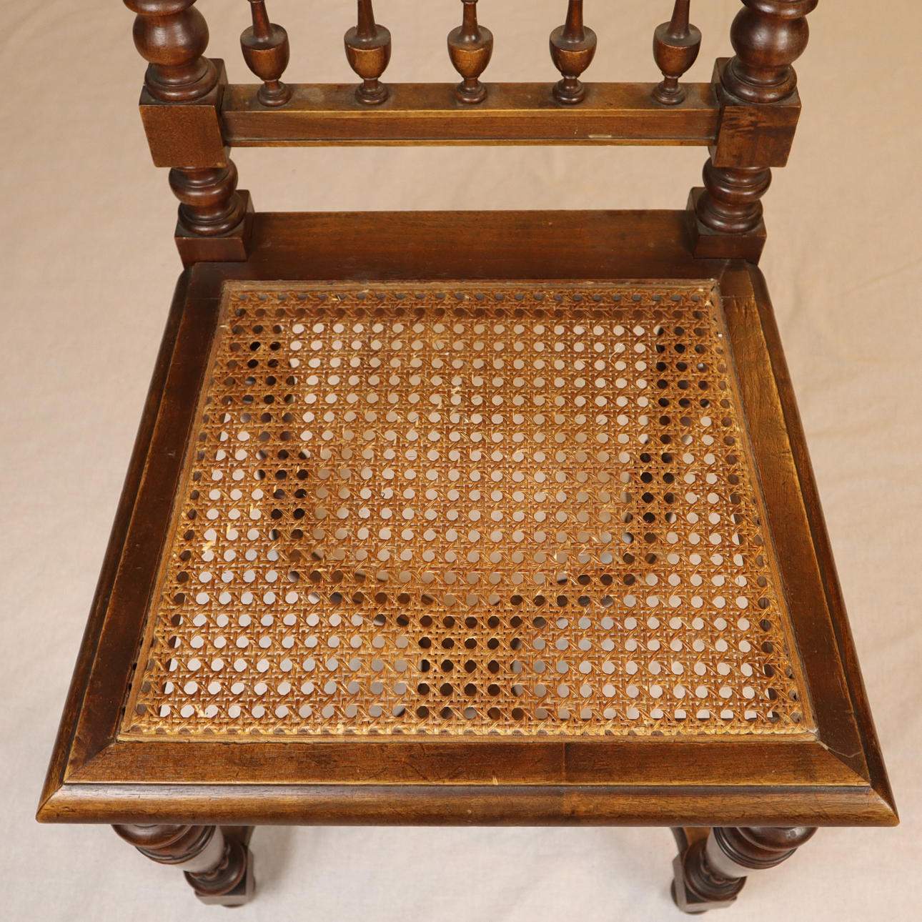 Eiche, Rückenlehne mit floralem Schnitzdekor, Rückenlehne und sitzfläche mit Rohrgeflecht, Fuße vorne gedrechselt und gerillt, Beine mit Verstrebung, H: Rückenlehne/Sitz: ca. 108/47 cm.
