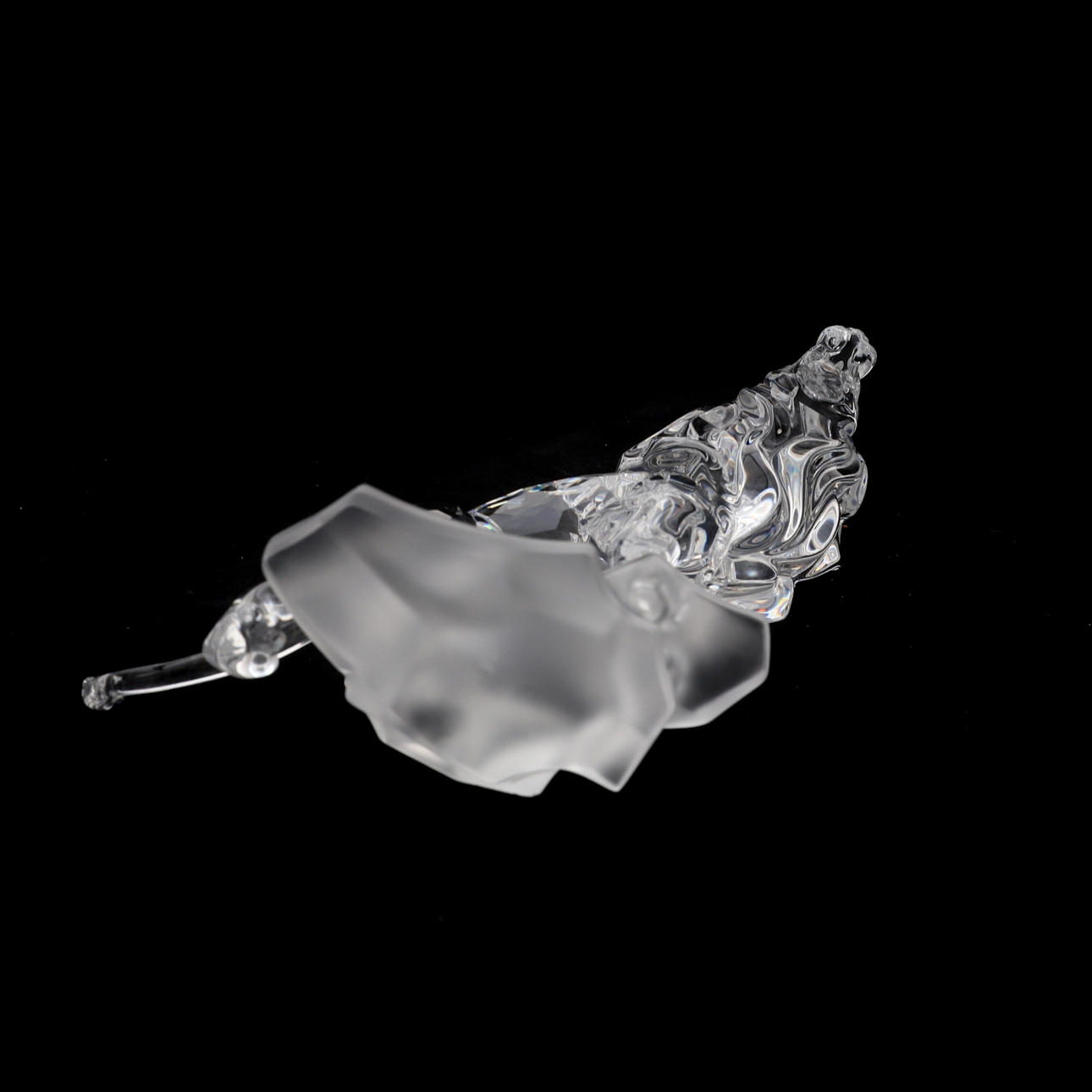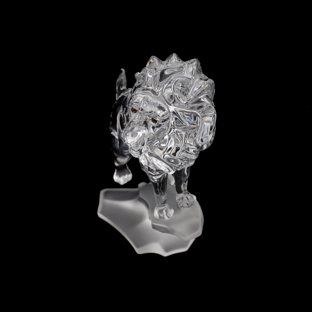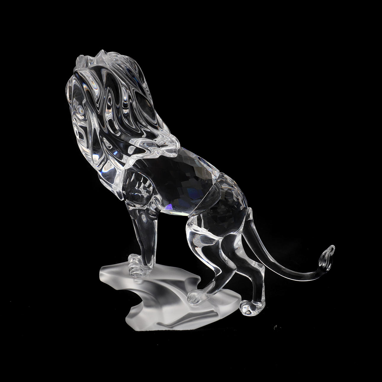 Nr. 269377, der Löwe in klarem facettiertem Kristall steht auf einem gefrosteten Kristallfelsen, 11,5 cm hoch, mit Zertifikat, in originaler Passepartout-Schatulle.