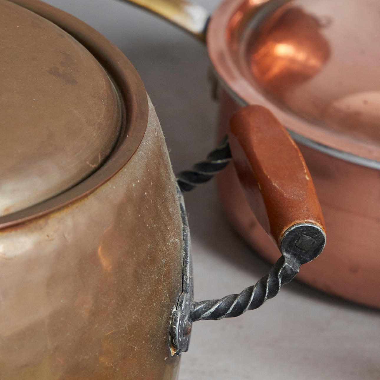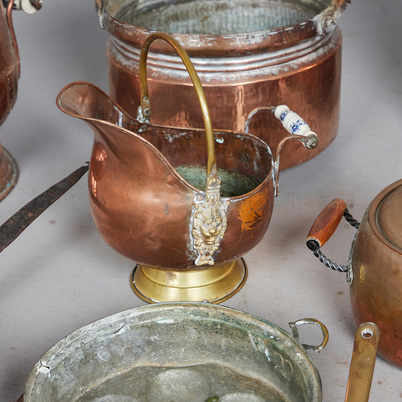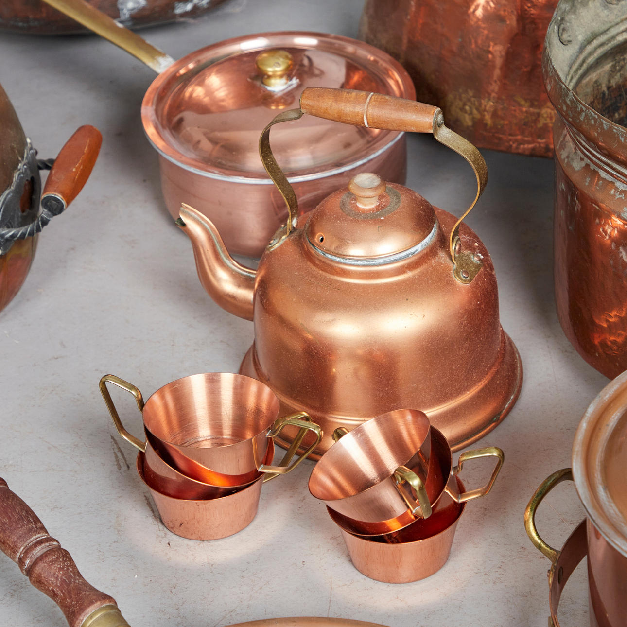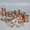 Kupfer-Konvolut, Küchenutensilien. Konvolut bestehend aus Kesseln, Töpfen, einem Teekessel, Pfannen, Eierpfannen, Tassen und Kellen, vereinzelt mit Holz- und Porzellangriffen und Metallapplikationen versehen, H.4-54cm, D.7,5-33cm. (26).