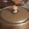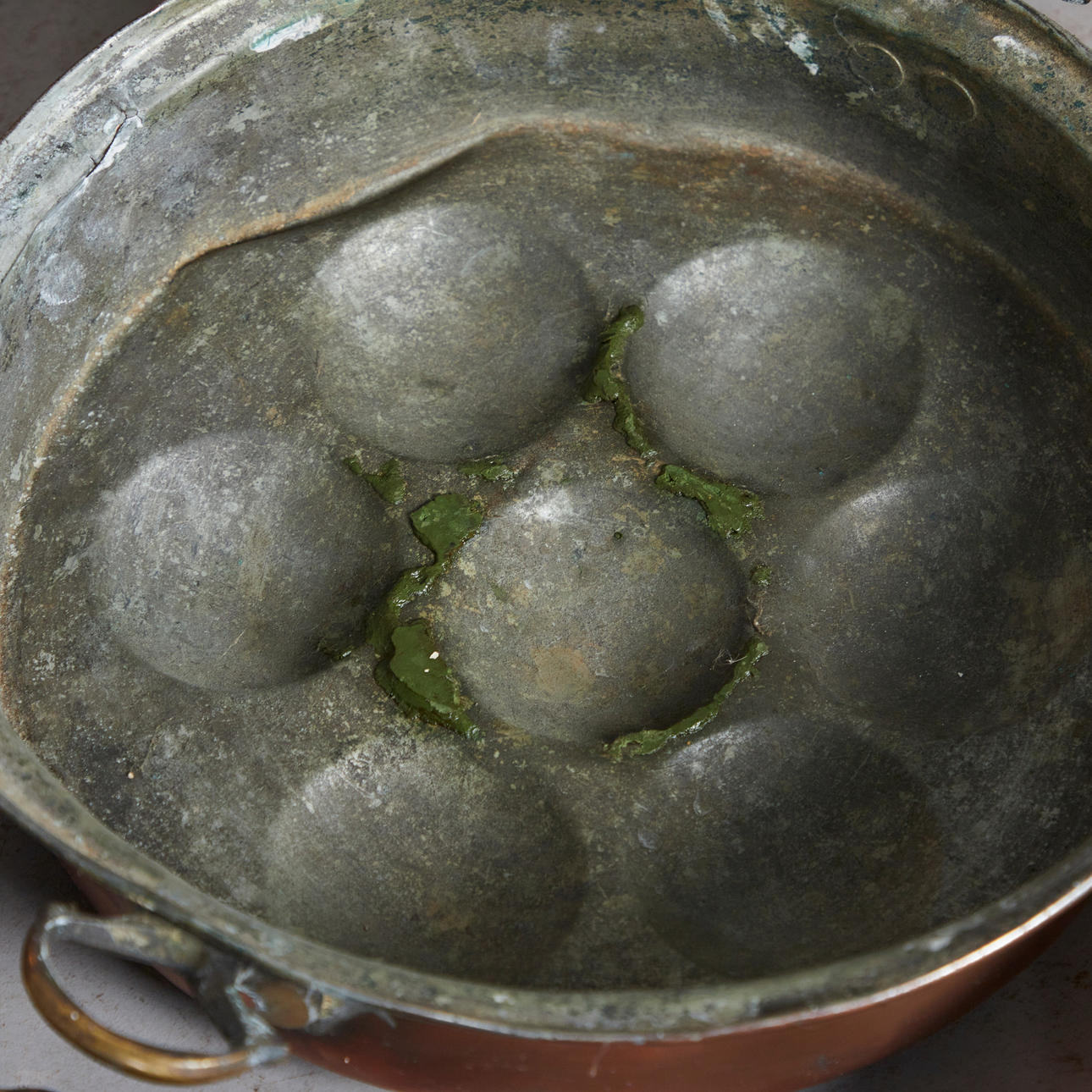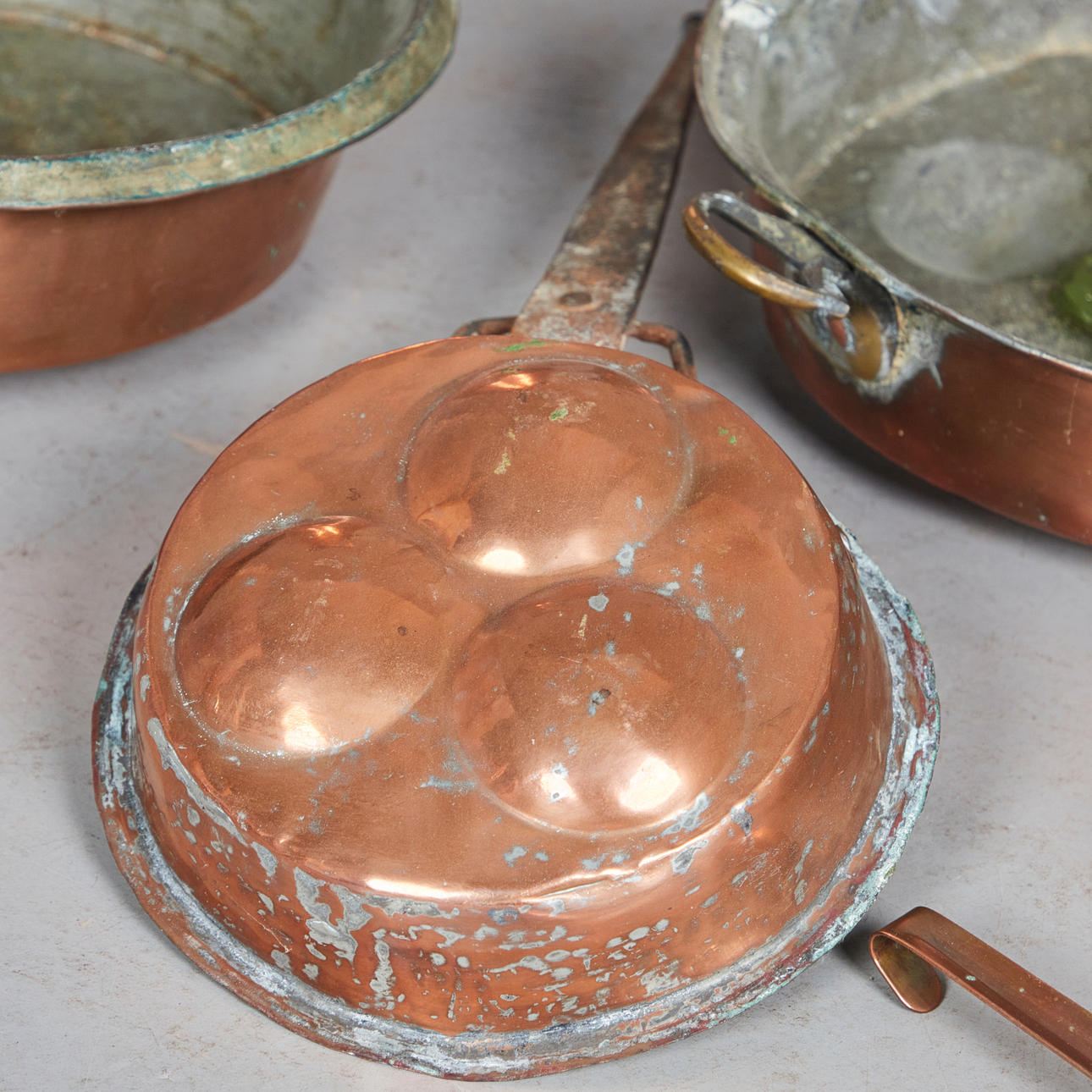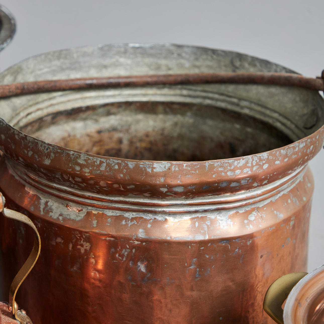 Kupfer-Konvolut, Küchenutensilien. Konvolut bestehend aus Kesseln, Töpfen, einem Teekessel, Pfannen, Eierpfannen, Tassen und Kellen, vereinzelt mit Holz- und Porzellangriffen und Metallapplikationen versehen, H.4-54cm, D.7,5-33cm. (26).