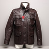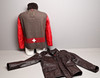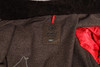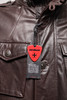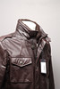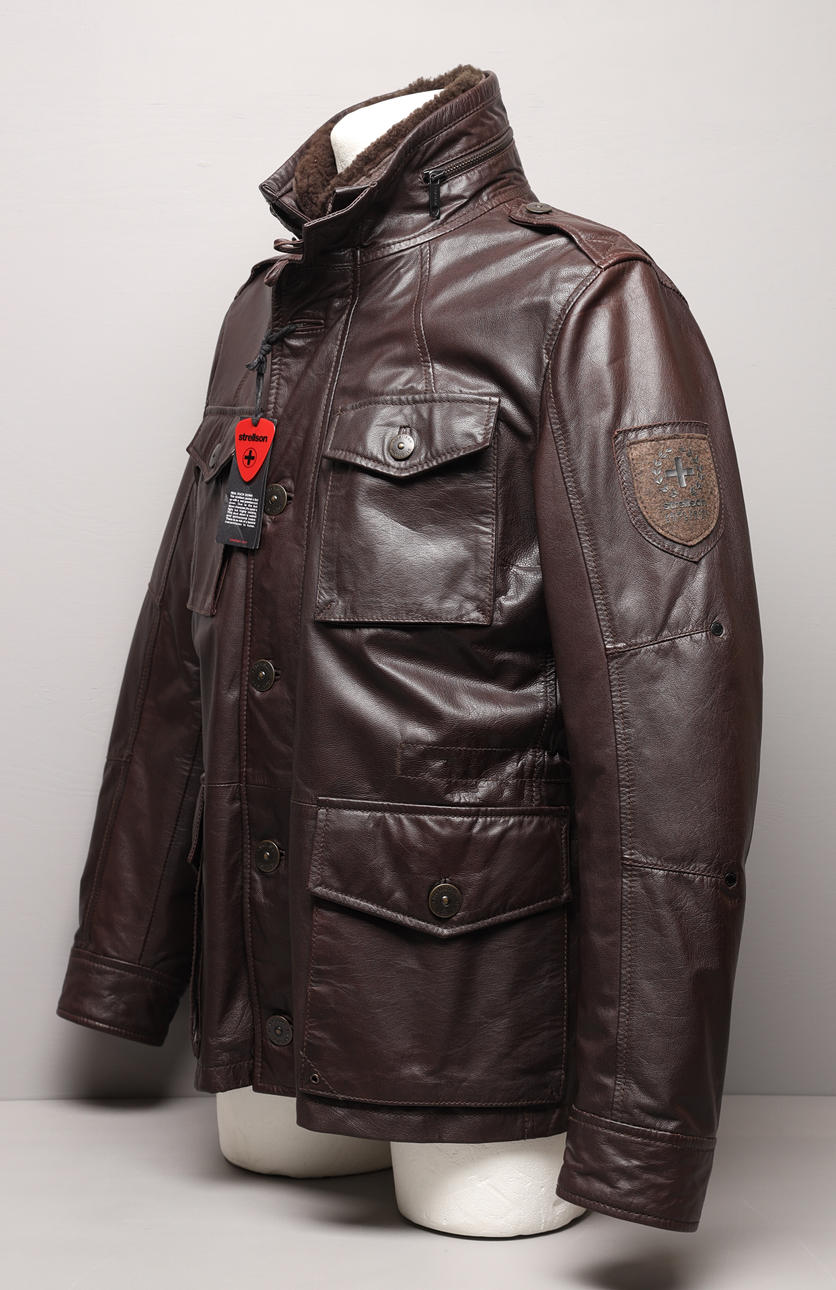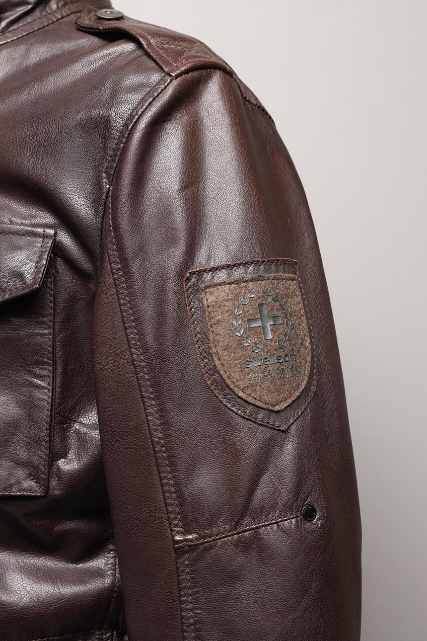Doppeljacke, zwei in einem. Kann separat verwendet werden. Außenjacke aus braunem Leder. Herausnehmbare Innenjacke aus Wolle mit Taschenmesser in Kette. Hergestellt in der Schweiz.