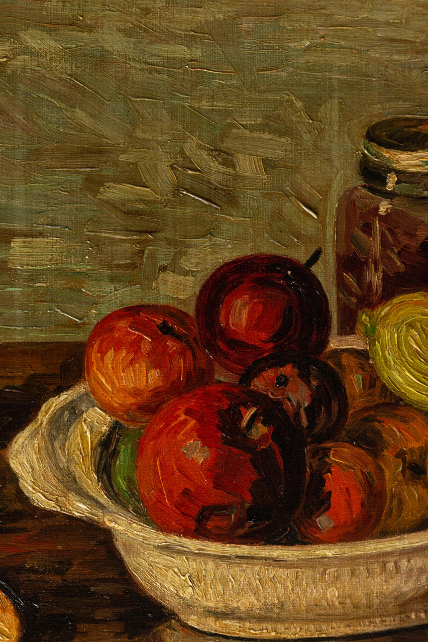 Carola Stratmann (1881-1950), Stillleben mit Obstschale, Öl auf Leinwand, wohl 1928, unten rechts signiert, auf einem beiliegendem Besitzervermerk datiert, 40 x 50 cm, mit Rahmen 50,5 x 60,5 cm.