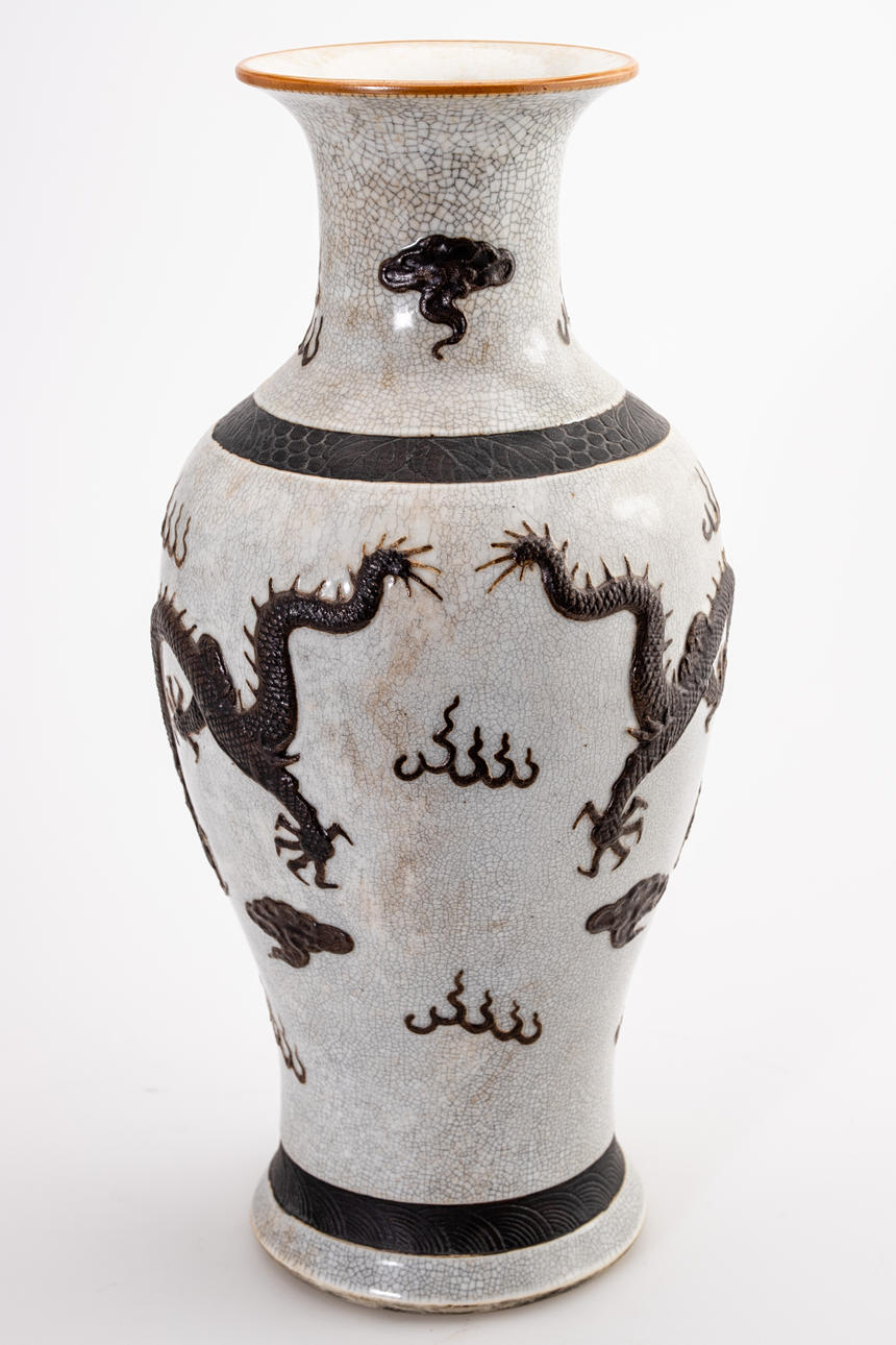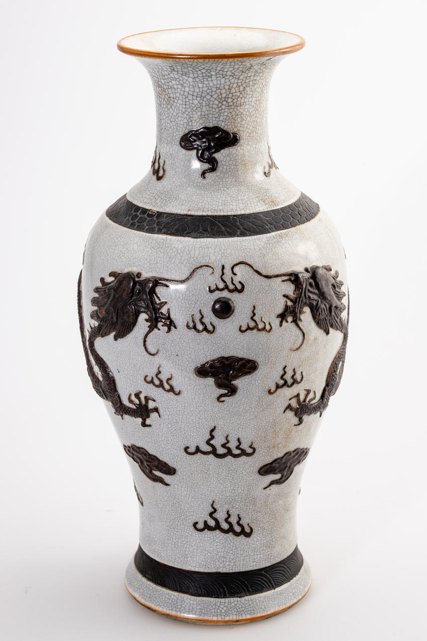 Steinzeug. Balusterform in krakelierter Glasur, zwei Drachen, Wolken- und Feuerornamente im Relief. Vierzeichenmarke: Cheng Hua Nian Zhi. H. 45 cm, Dm. 20 cm.