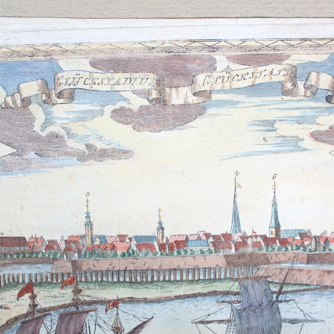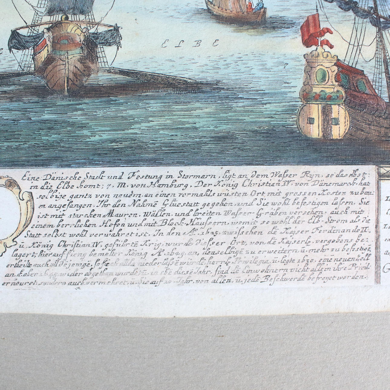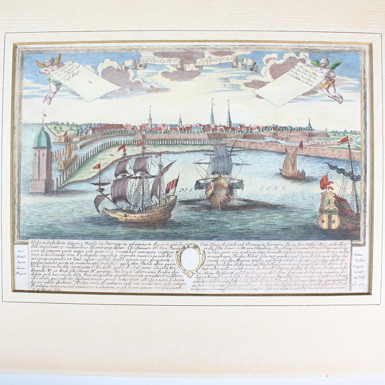 Kupferstich, koloriert, 'Glückstadt', Bildmaß: 22 x 30 cm, Passepartout-Maß: 33 x 40 cm.