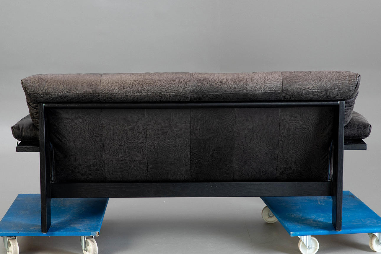 Gestell aus lackiertem Holz in Schwarz. Bezug in genarbtem Schwarzleder. HxShxBxT: 78x41x177x100 cm.