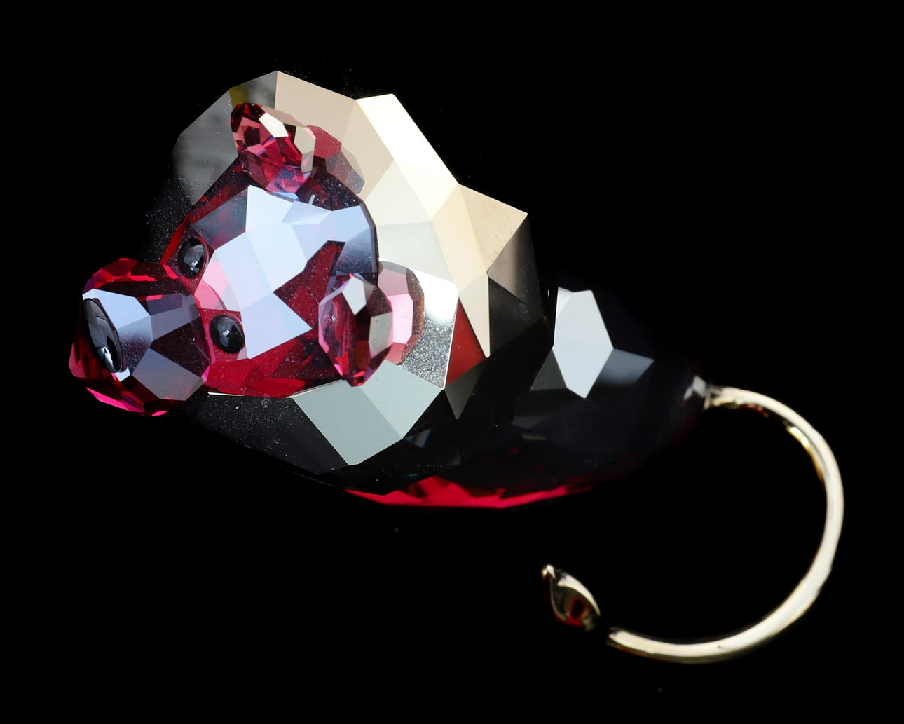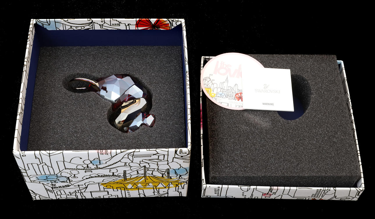 Nummer 1079591, der Löwe in einem fuchsiagoldenen Shadow-Kristall mit einer metallisch-hellgoldfarbenen Mähne und einem hellgoldfarbenen Metallschwanz, tiefschwarzen Augen und Nase, 6,5 cm hoch, in Originalverpackung mit Außenhülle.