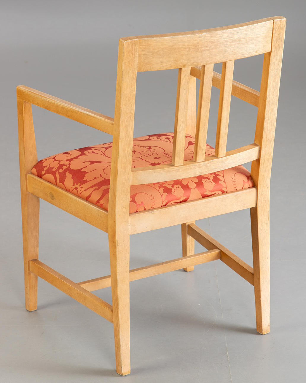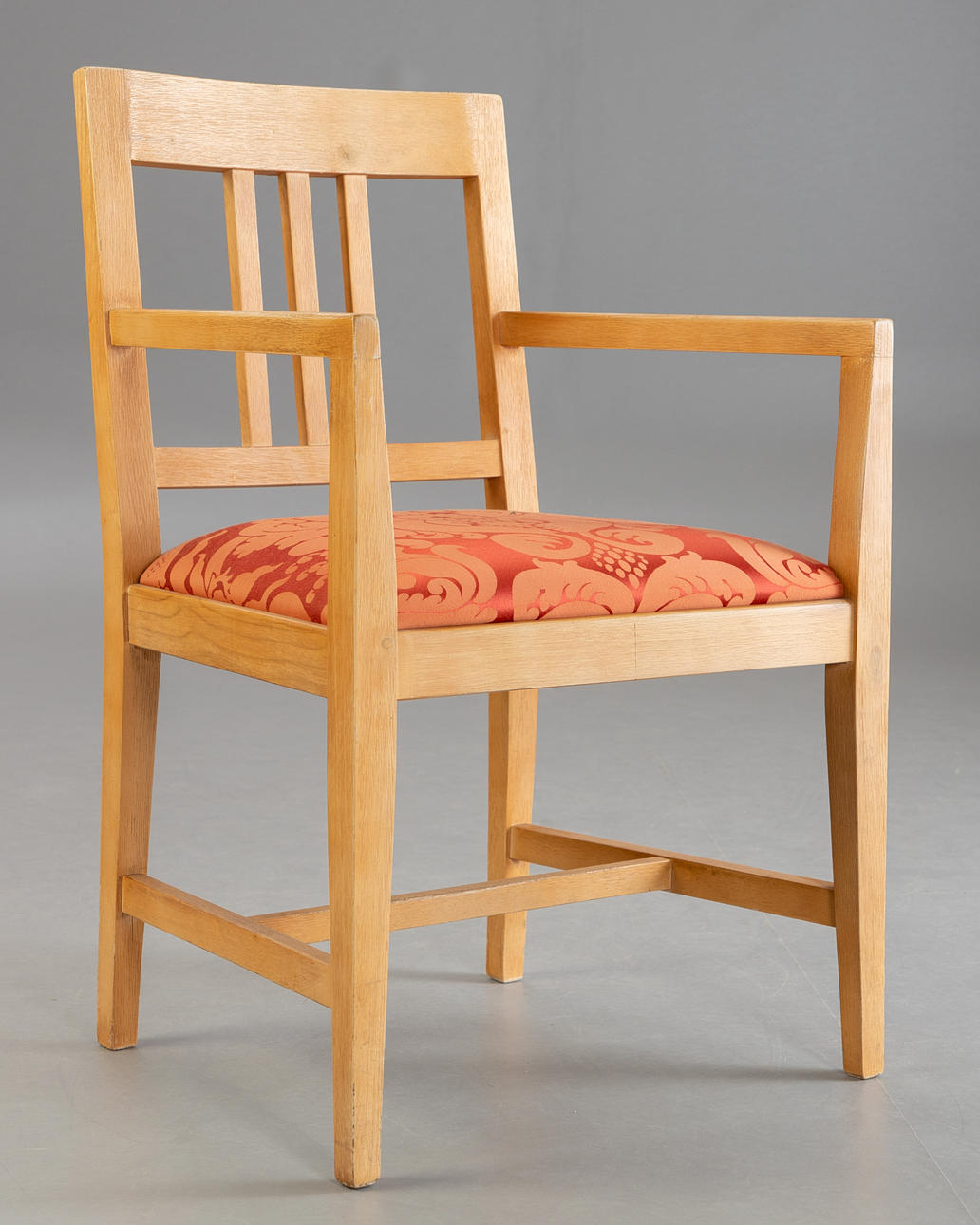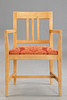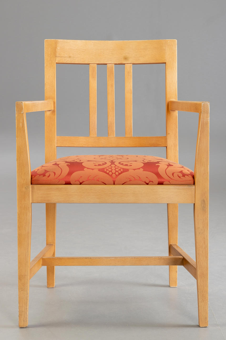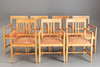 Sieben Stühle von Marktex mit Armlehnen und Sitzpolsterung, mit Stoff bezogen. Pinienholz