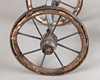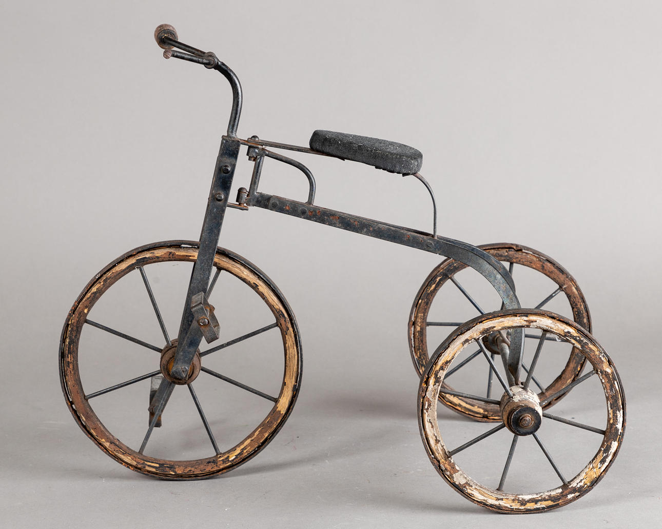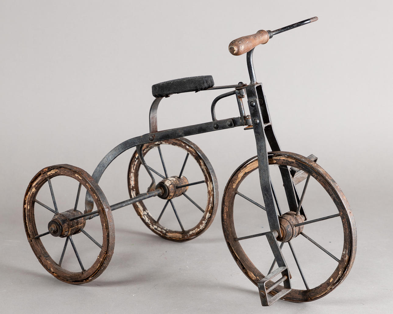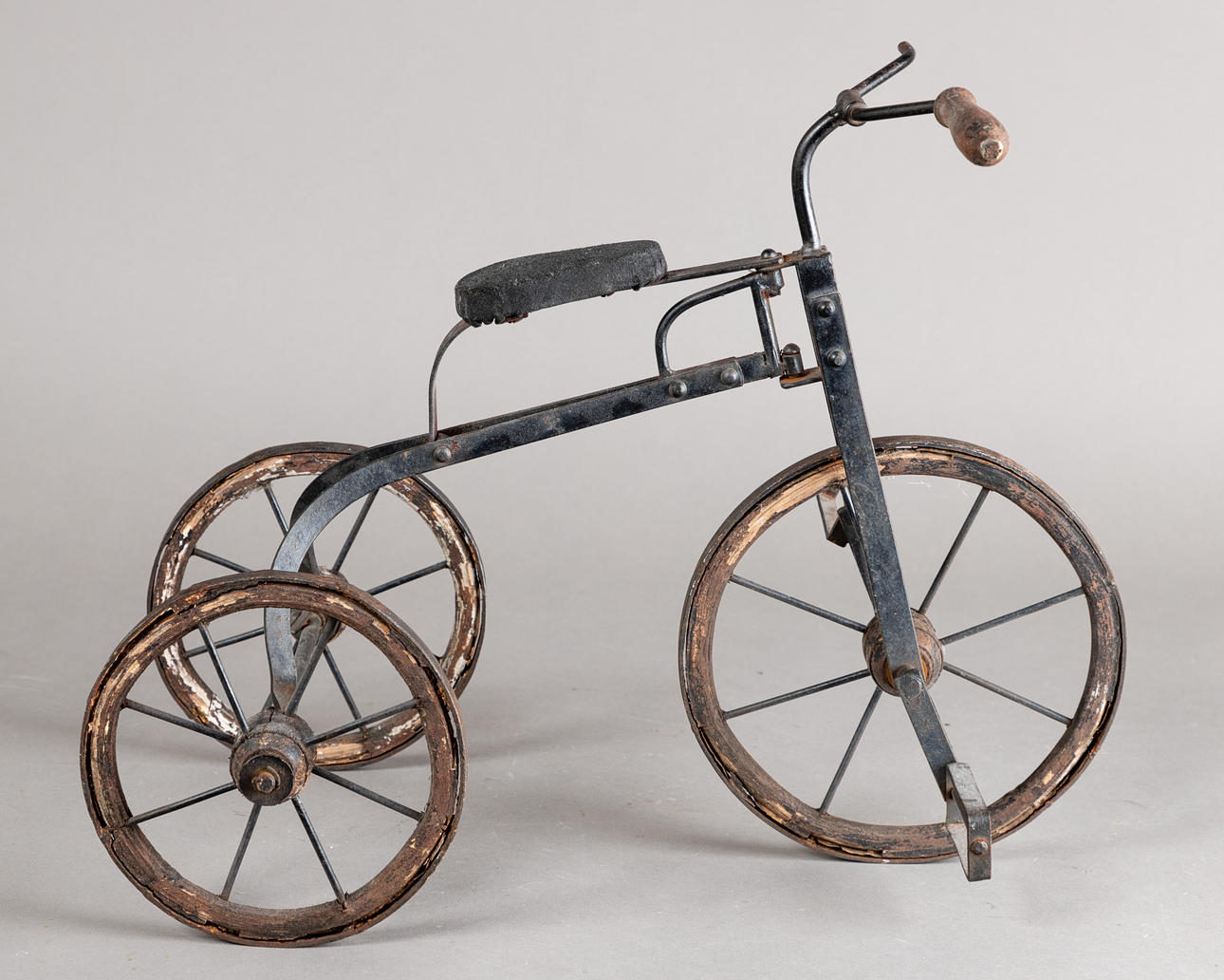 Antikes Dreirad, Schmiedeeisen, Holzräder mit Metallbeschlag und Eisenspeichen mit Holzachsen, H: ca. 40 cm, B: ca. 26 cm.