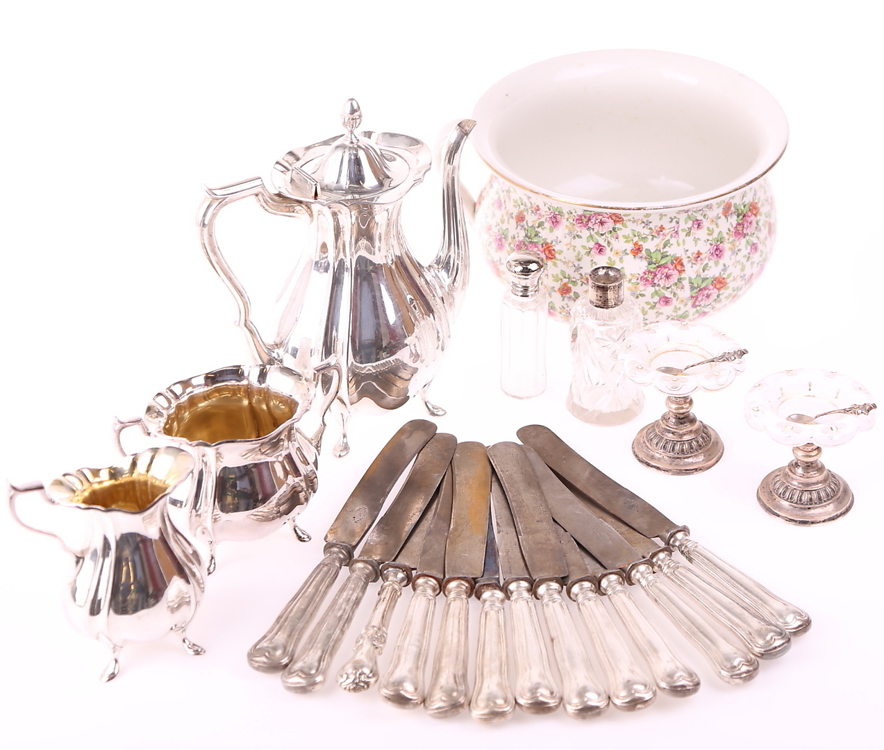 221594. KAFFESET, 3-teilig, Neusilber + POTTA + HUSGERÅD.