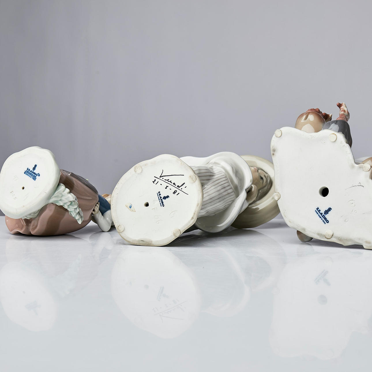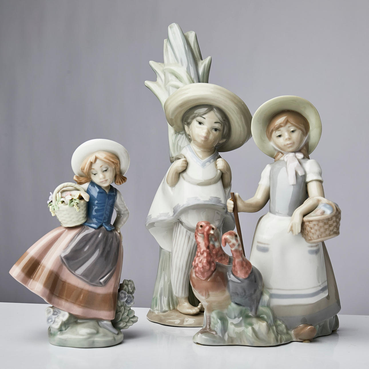 Mädchen mit Truthähnen, Junge mit Strohhalm, kleineres Mädchen mit Blumen und zwei Geishas Höhen zwischen 30-17 cm.