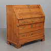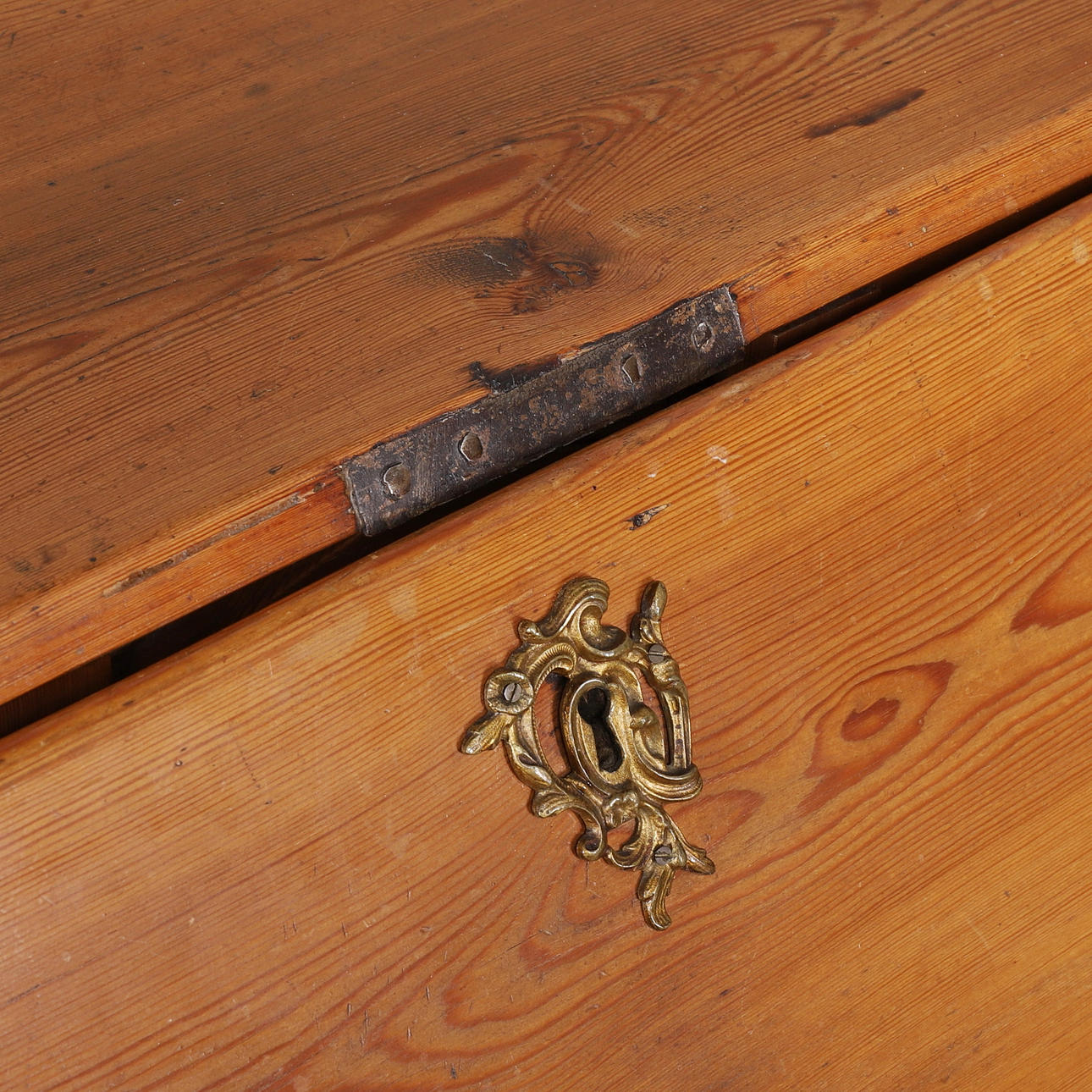 Schreibtisch mit schräger Klappe, Kiefer massiv und Beschläge aus gelbem Metall. Schreibeinheit mit Schubladeninnenraum, sowie drei ausziehbaren Schubladen.