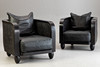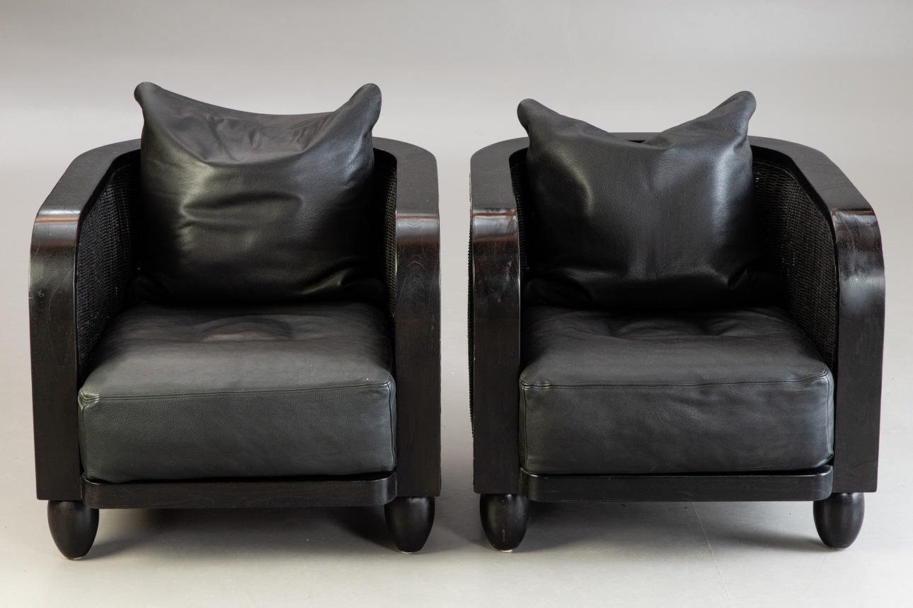 Paar Rattan Sessel von Lambert. Bezeichnet. Sessel aus doppelwandigem Pitritt Geflecht, schwarz lackiert. Umlaufender Rahmen aus massivem Holz, kegelförmige Holzfüße. Lose aufliegende Sitzpolster mit schwarzem Lederbezug.