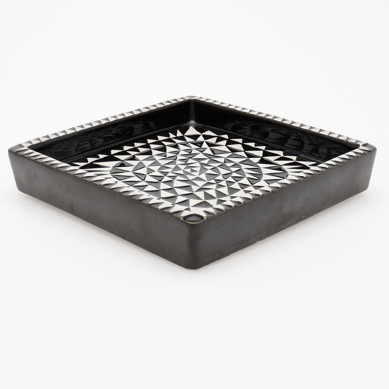Glasiertes Steinzeug mit Dekor in Schwarz und Weiß, ca. 20x20 cm, Höhe ca. 4 cm.