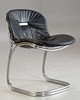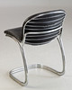 Stuhl mit freischwingenden Gestell aus verchromten Metall mit horizonalen Streben. Lederbezogene Polsterauflage in schwarz mit Druckknöpfen an Gestell befestigt.