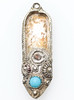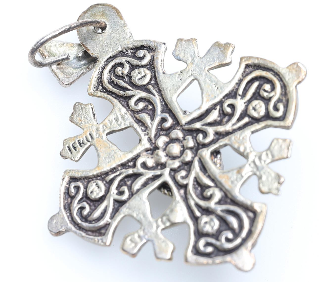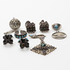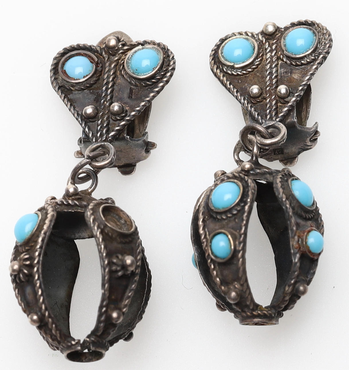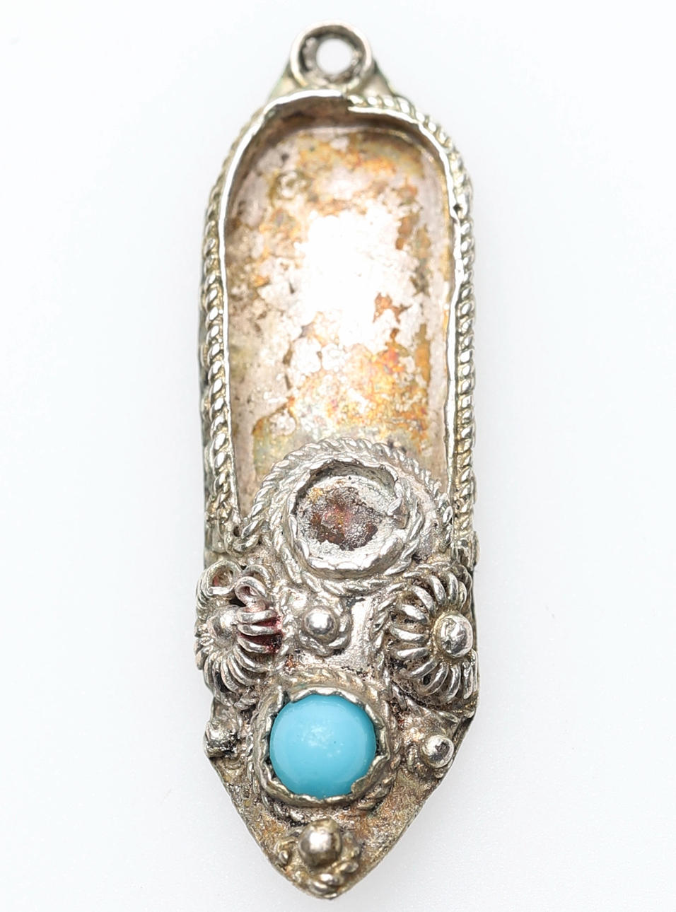 Anhänger, Kugel mit Filigran, Länge ca. 5,5 cm Charm, Schuh mit Türkis, Länge ca. 3 cm Anhänger, Baum im Ring, geschnitten aus einer libanesischen Münze (25 Piaster), Durchmesser ca. 2,5 cm Anhänger, Kreuz mit grünem Stein, Gravur Jerusalem auf der Rückseite. Länge ca. 5 cm Ein Paar Ohrringe, mit Türkisen, Clips. Länge ca. 4 cm Ring, mit Türkisen, größenverstellbar mit offenem Band Ring, gestempeltes Sterling, türkis, Ringständer 15,5 / 49 Ein Paar Ohrringe, würfelförmig mit Türkisen, Länge ca. 4 cm Gesamtgewicht ca. 59 Gramm.