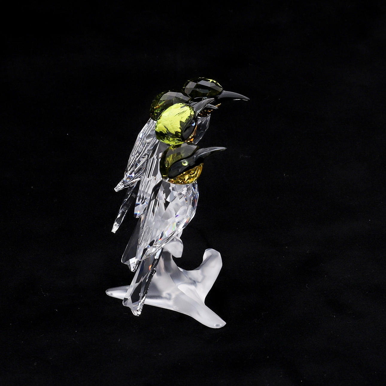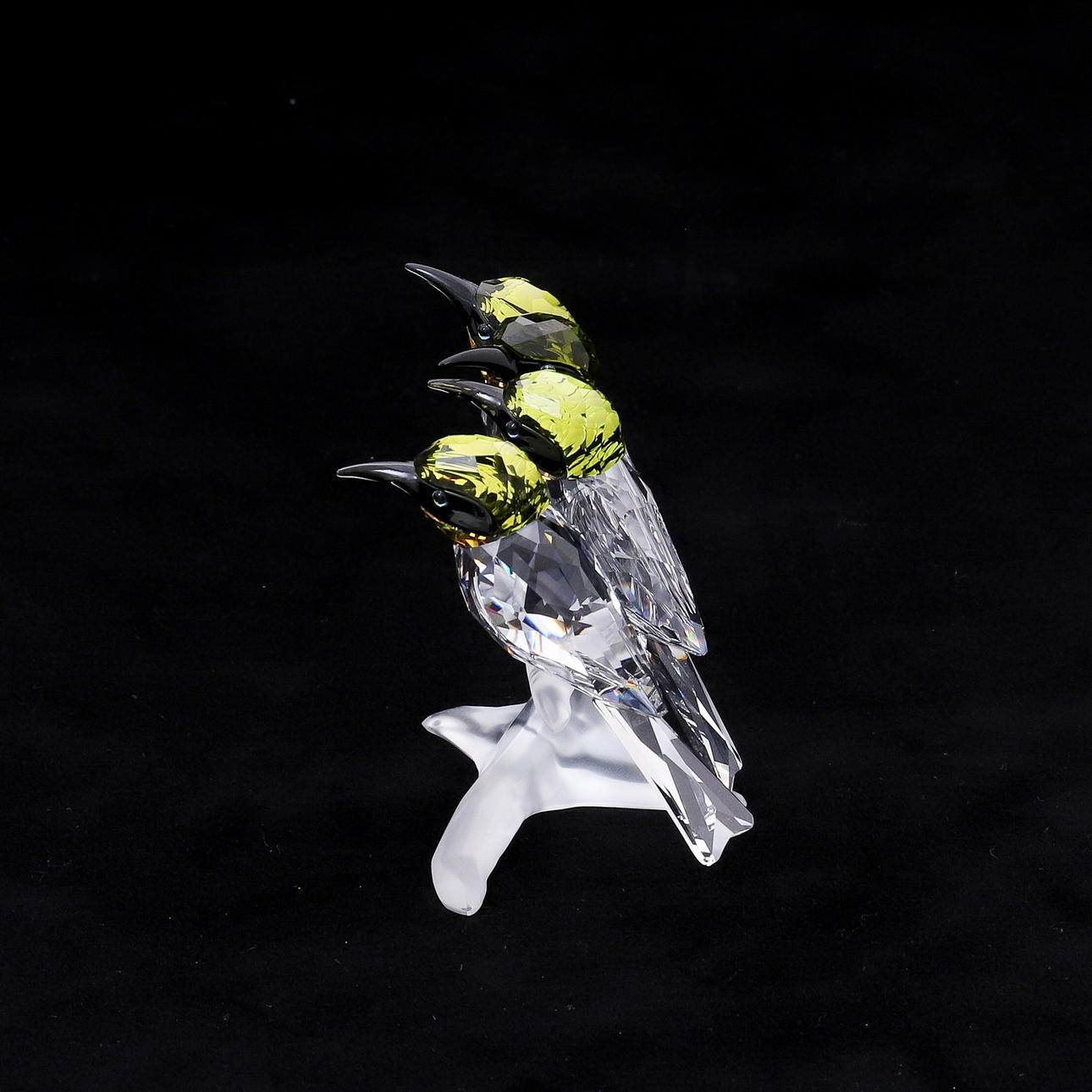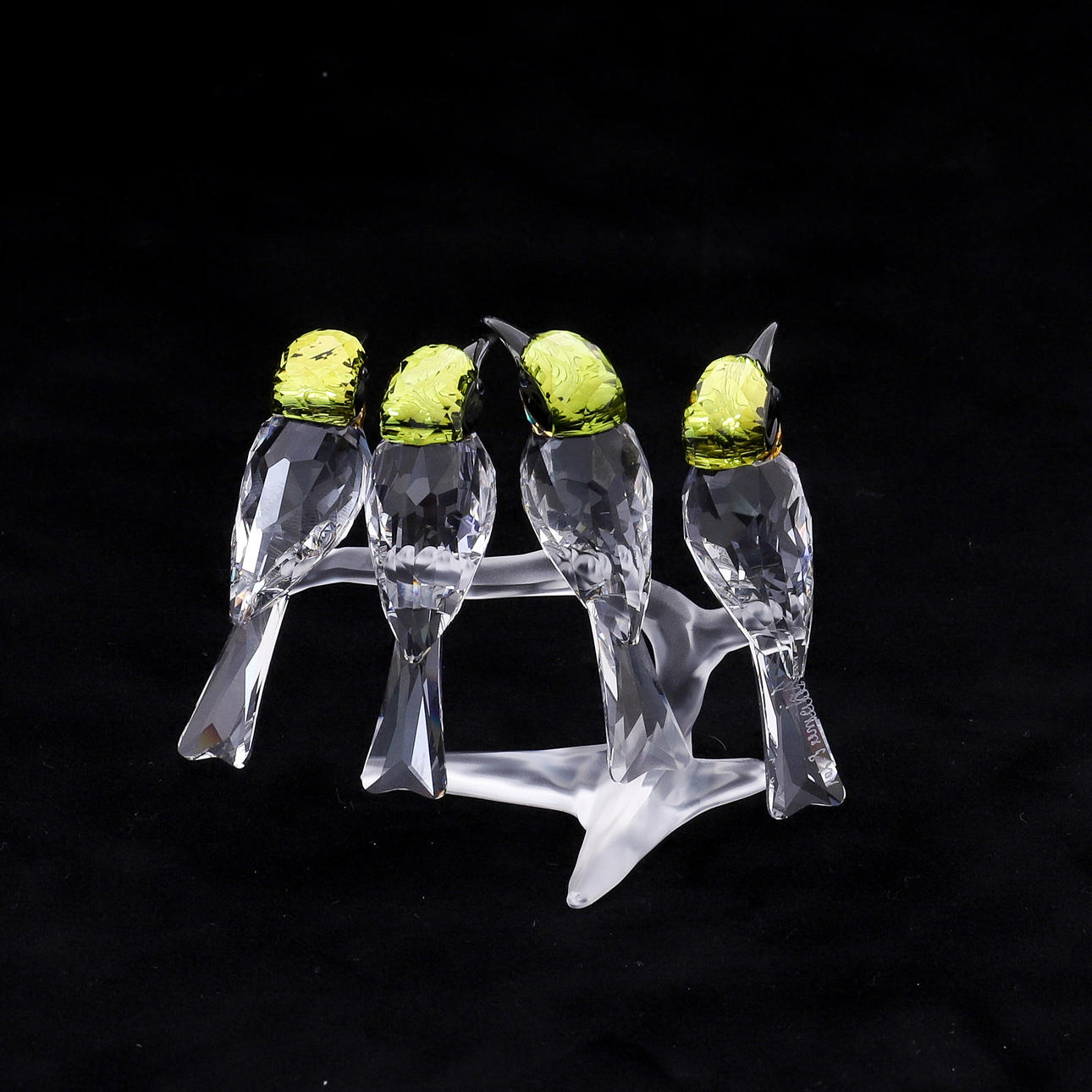 1109894, die vier Vögel mit hellgrünen Köpfen, schwarzen Schnäbeln und Wangen und gelben Kehlen, der Körper in klarem facettiertem Kristall, sitzend auf einem mattierten Kristallzweig, signiert auf dem Schwanz eines Vogels, 7,5 cm hoch, mit Zertifikat, in Originalkarton und Außenumschlag aus Karton.