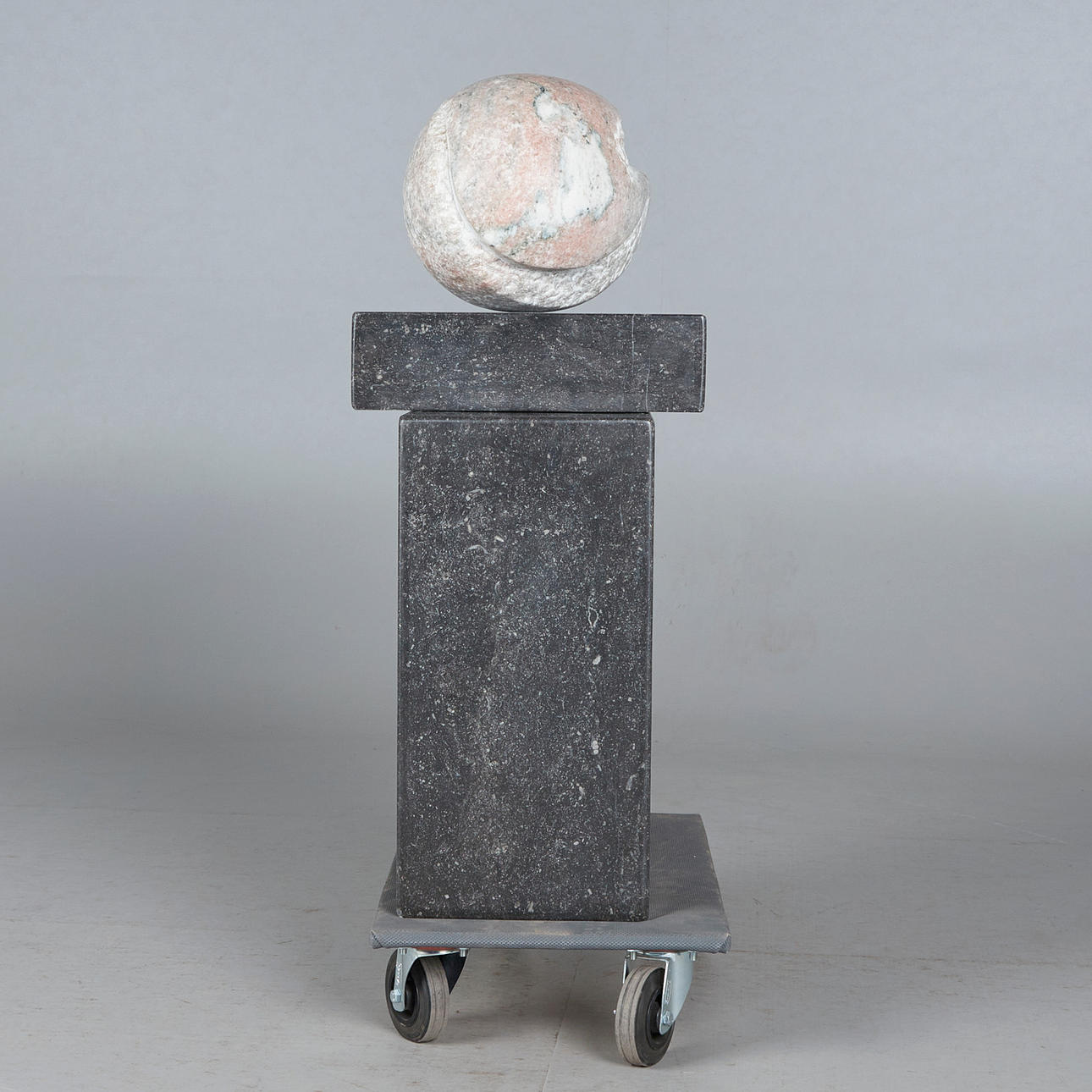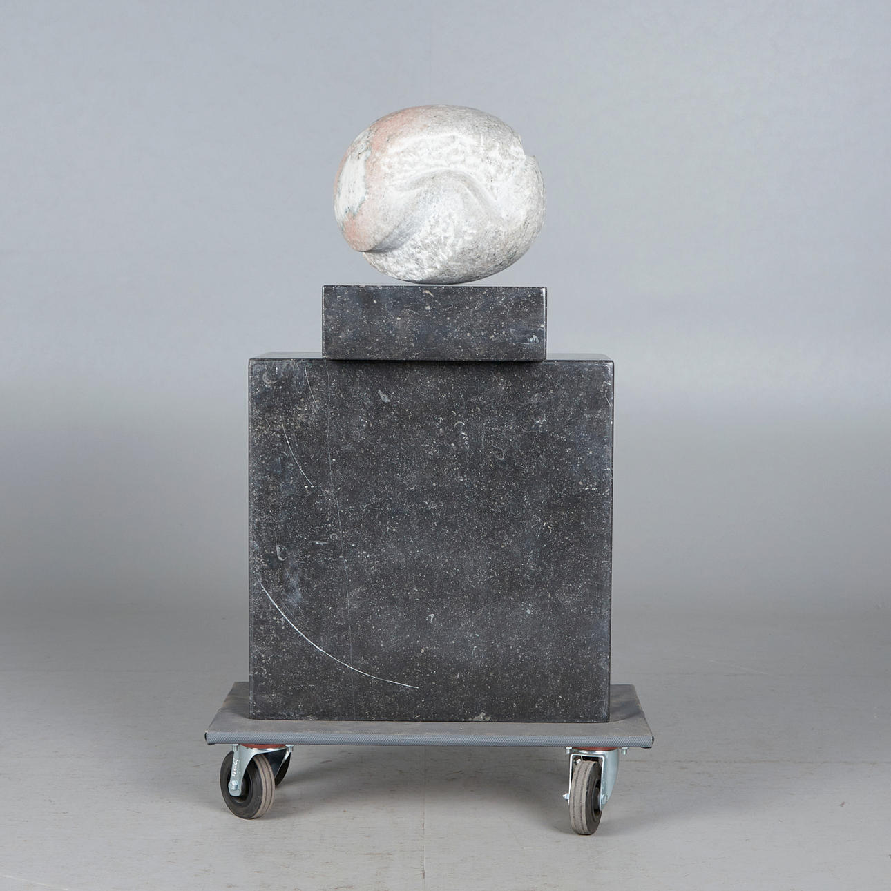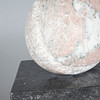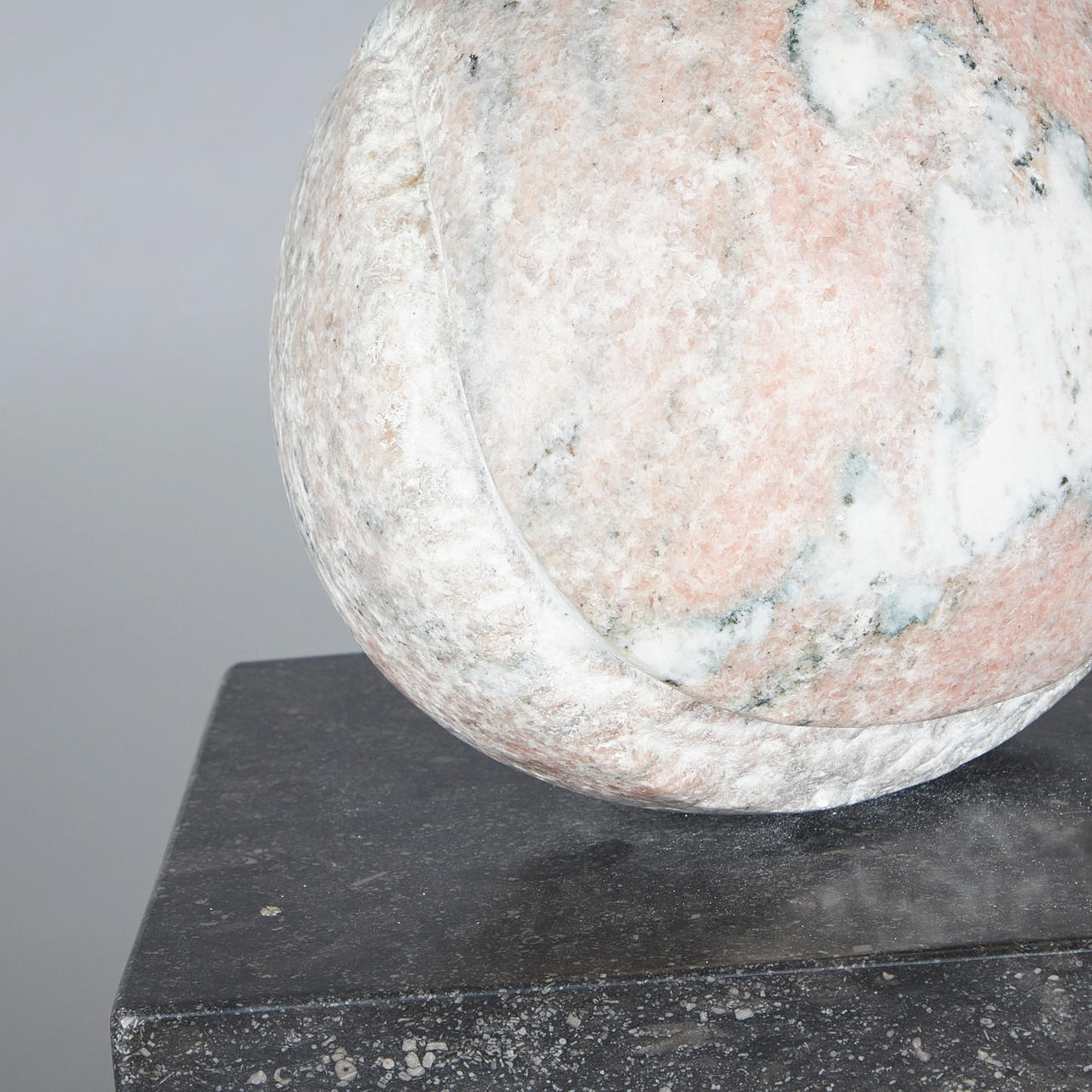 Michael Pohlmann, Skulptur / Figur, 'Gebrochene Eiform', Marmor, 1987. Biomorphe Skulptur aus weiß-roséfarbenem Marmor auf zwei blockförmigen, anthrazitgrauen Sockeln platziert, Gesamtmaß: H.86cm, L.30cm, T.50cm, Skulptur: H.35cm, L.30cm, T.30cm.