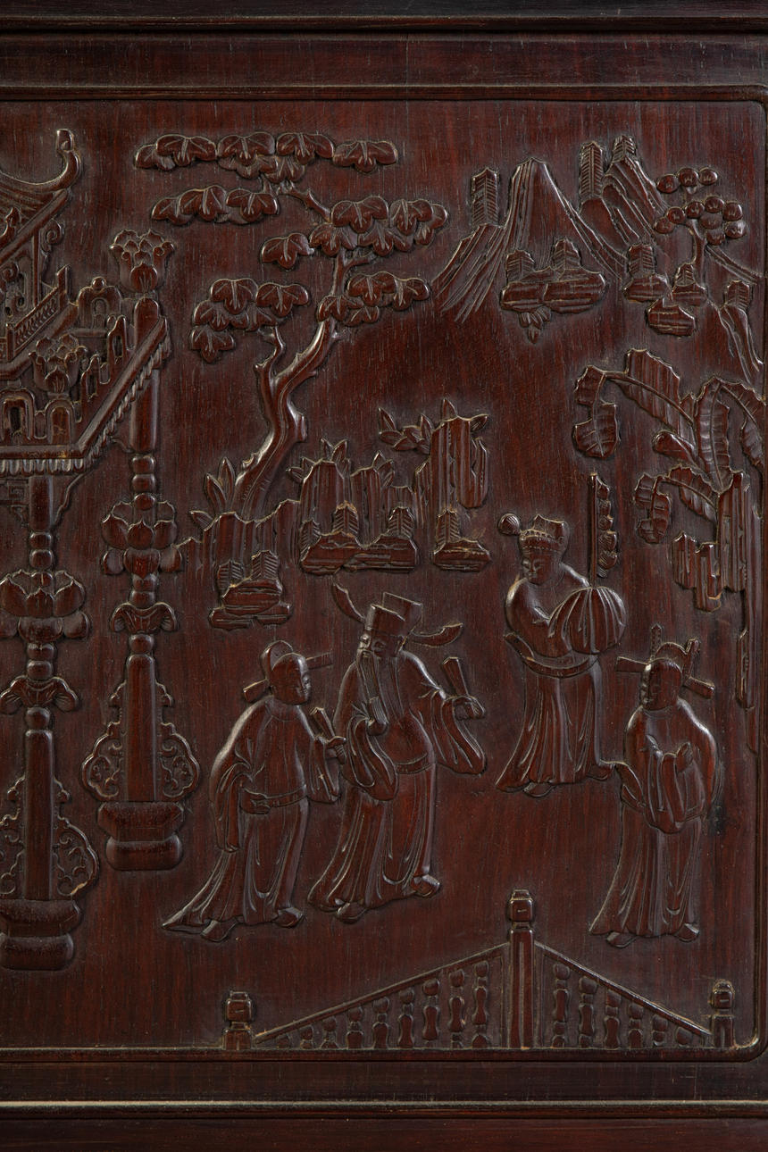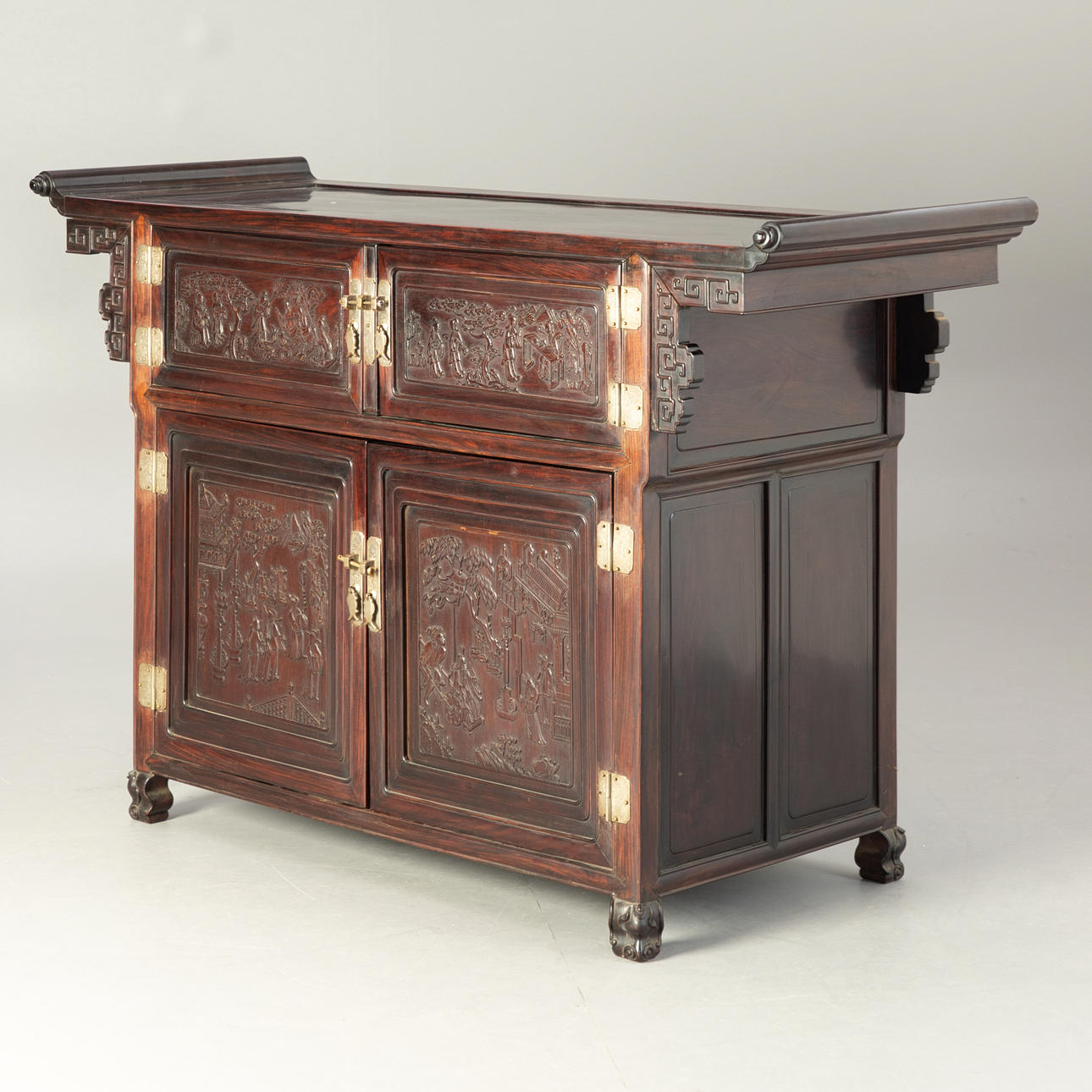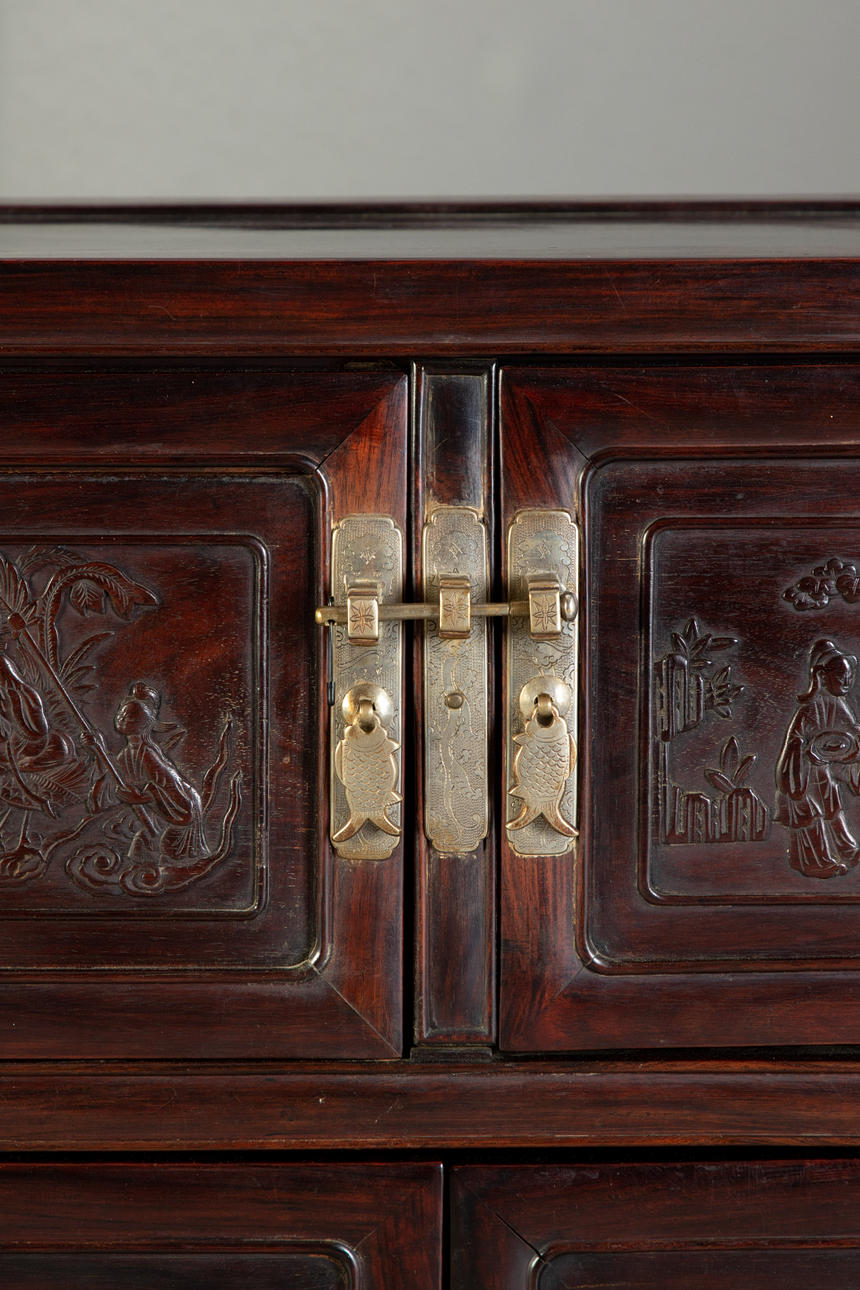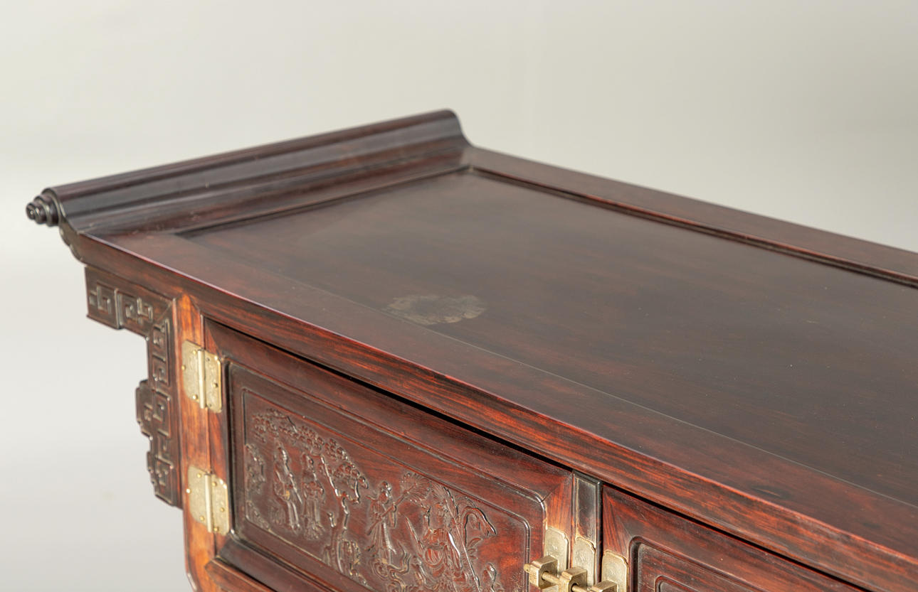 Hartholz. Rechteckiger Korpus mit seitlich auskragender Platten auf geschwungenen Füßen. Flügeltüren in verschiedenen Größen, Figurenszenen und Pavillon in Garten- und Berglandschaft im Relief. Griff in der Form von Fisch, mit Metallbeschlägen und Türriegeln. HxBxT: 102x160x58 cm