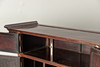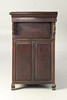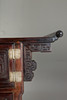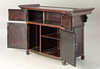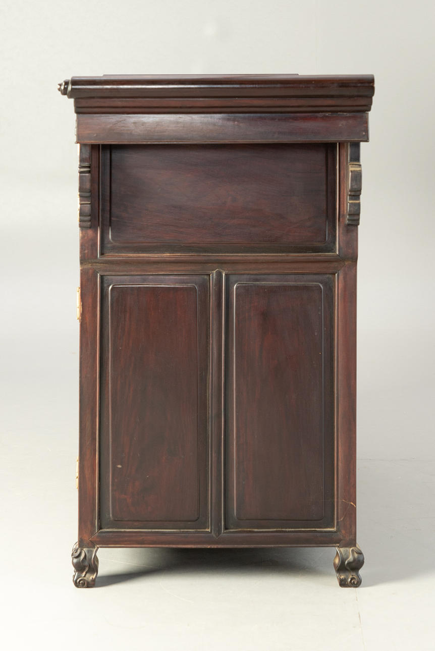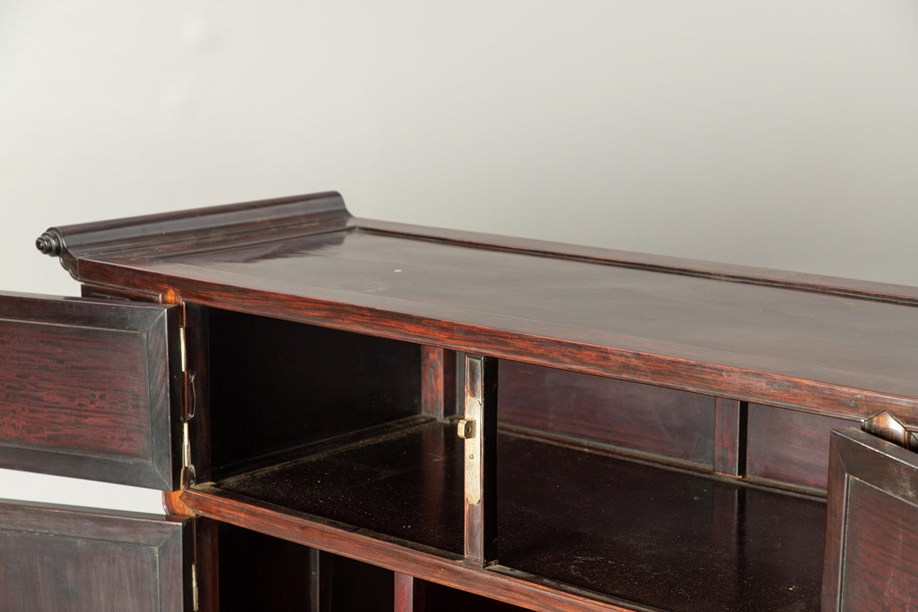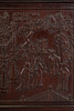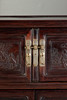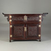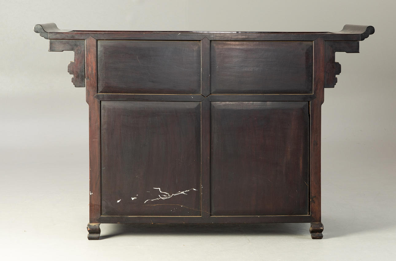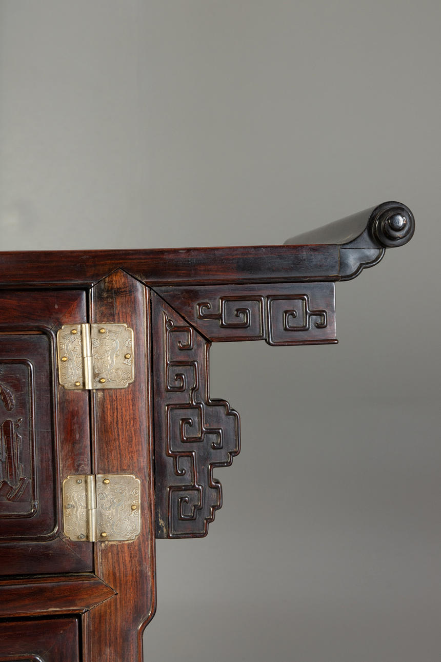 Hartholz. Rechteckiger Korpus mit seitlich auskragender Platten auf geschwungenen Füßen. Flügeltüren in verschiedenen Größen, Figurenszenen und Pavillon in Garten- und Berglandschaft im Relief. Griff in der Form von Fisch, mit Metallbeschlägen und Türriegeln. HxBxT: 102x160x58 cm