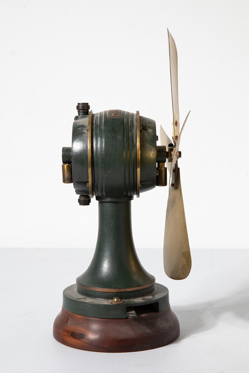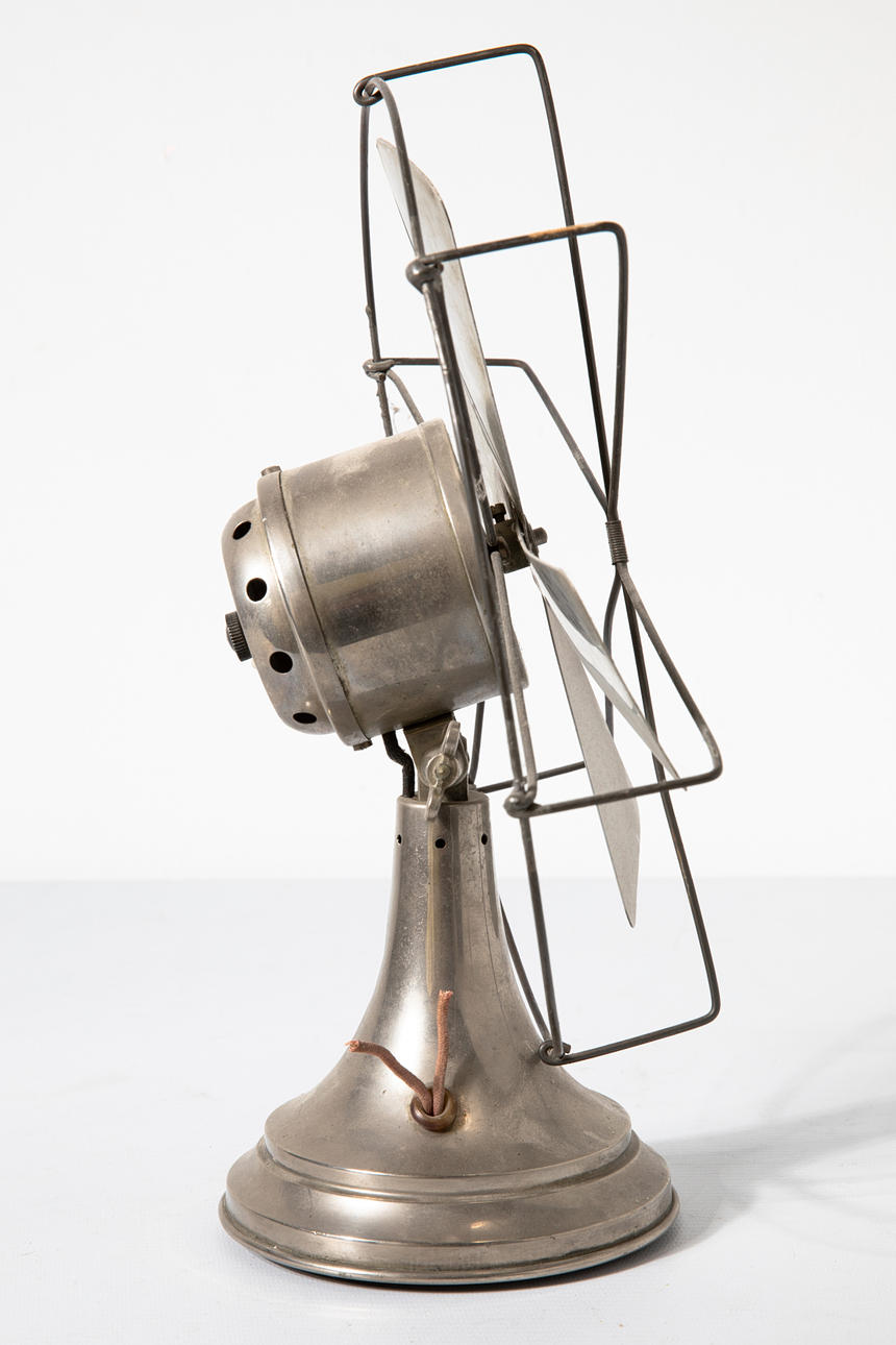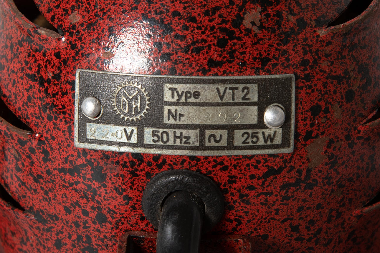 4 Tischventilatoren/ Ventilatoren. Verschiedenen Materialien, u.a. Metall, Messing, partiell lackiert Verschiedene Größen H. 37 cm, 35 cm, 21 cm, 26,5 cm. Teilweise bezeichnet mit Firmenmarken und Modellnummern (VEM WTB Dresden, VDH, Paris mit Stern).