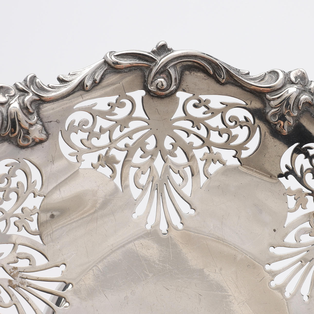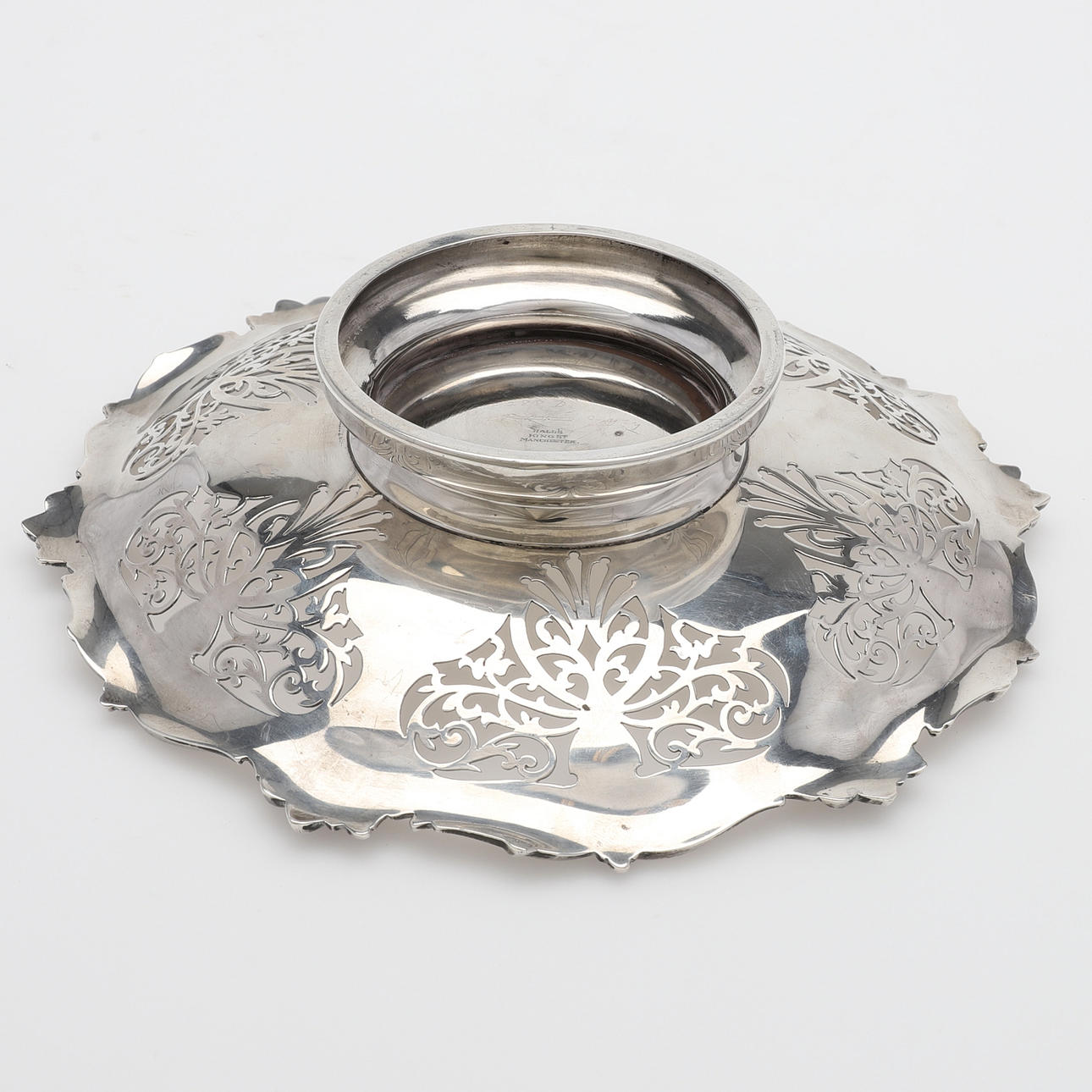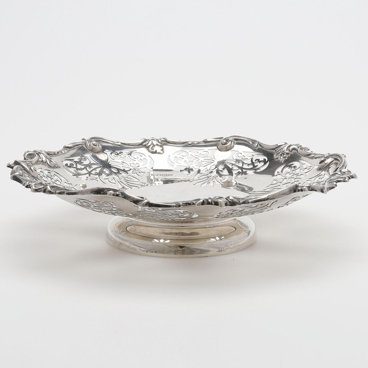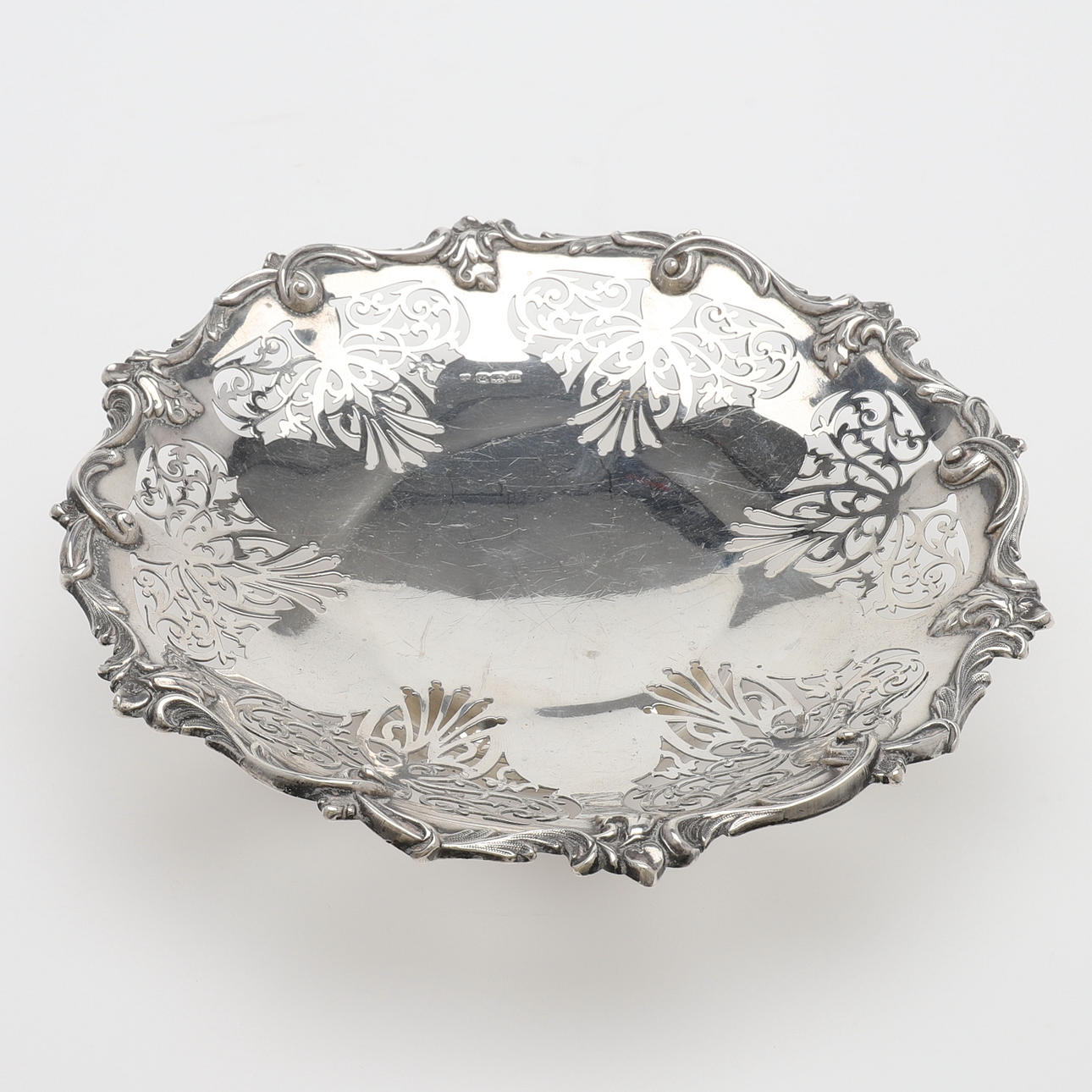 Silber mit durchbrochenem Dekor, gestempelt Sheffield 1929, Durchmesser 21,5 cm, Gewicht 221 cm.