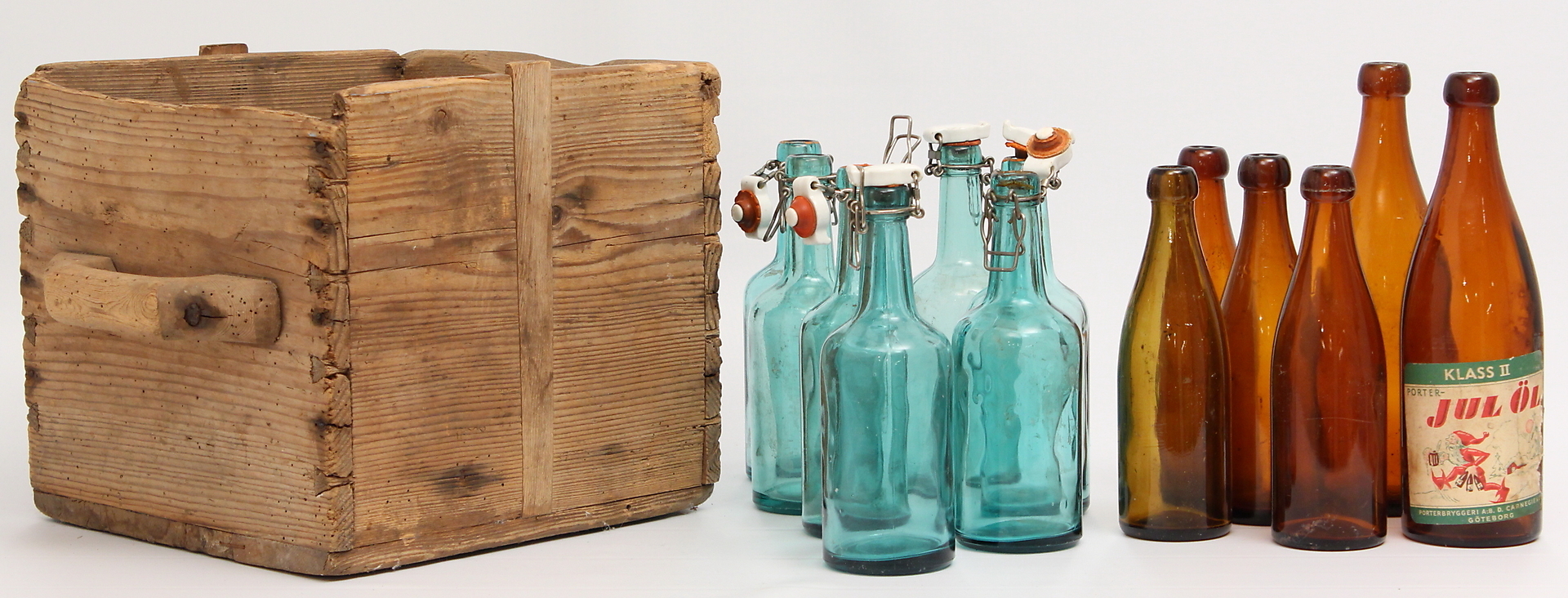 226867. HOLZKISTE mit Flaschen, Vintage.
