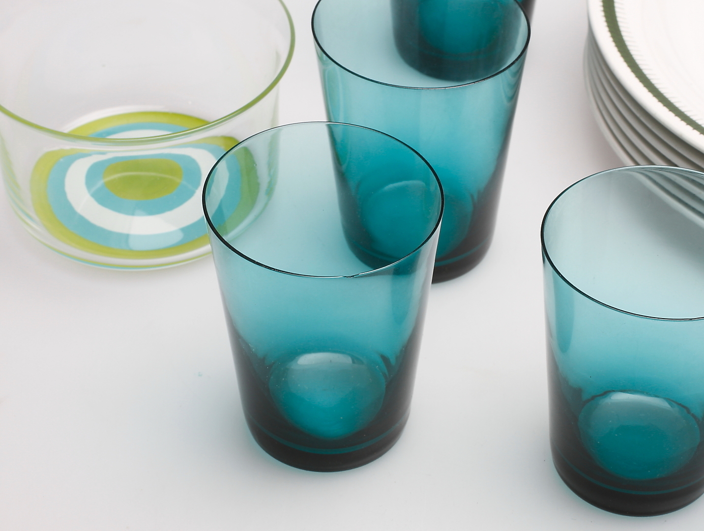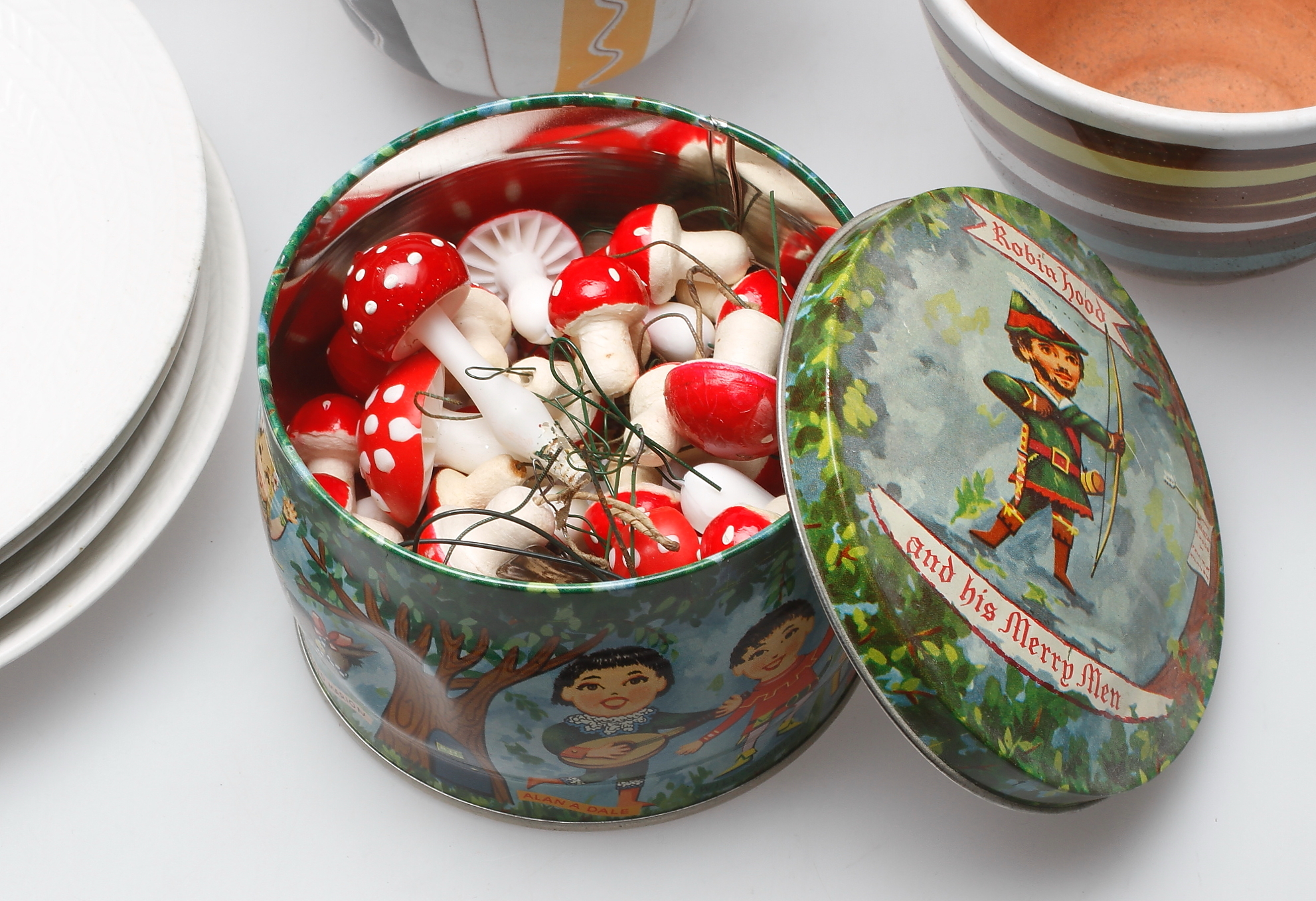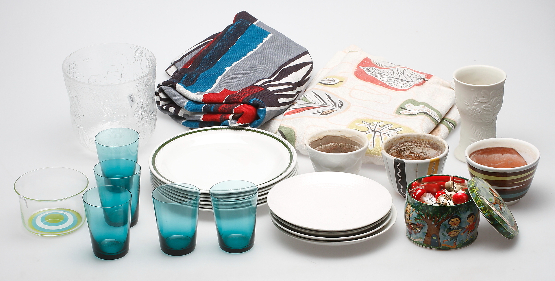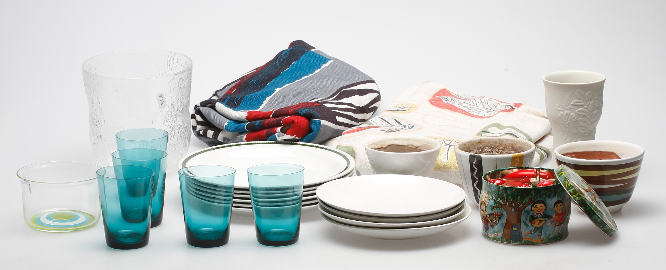 227147. KERAMIK und GLAS, TEXTILIEN und Blechdose.