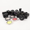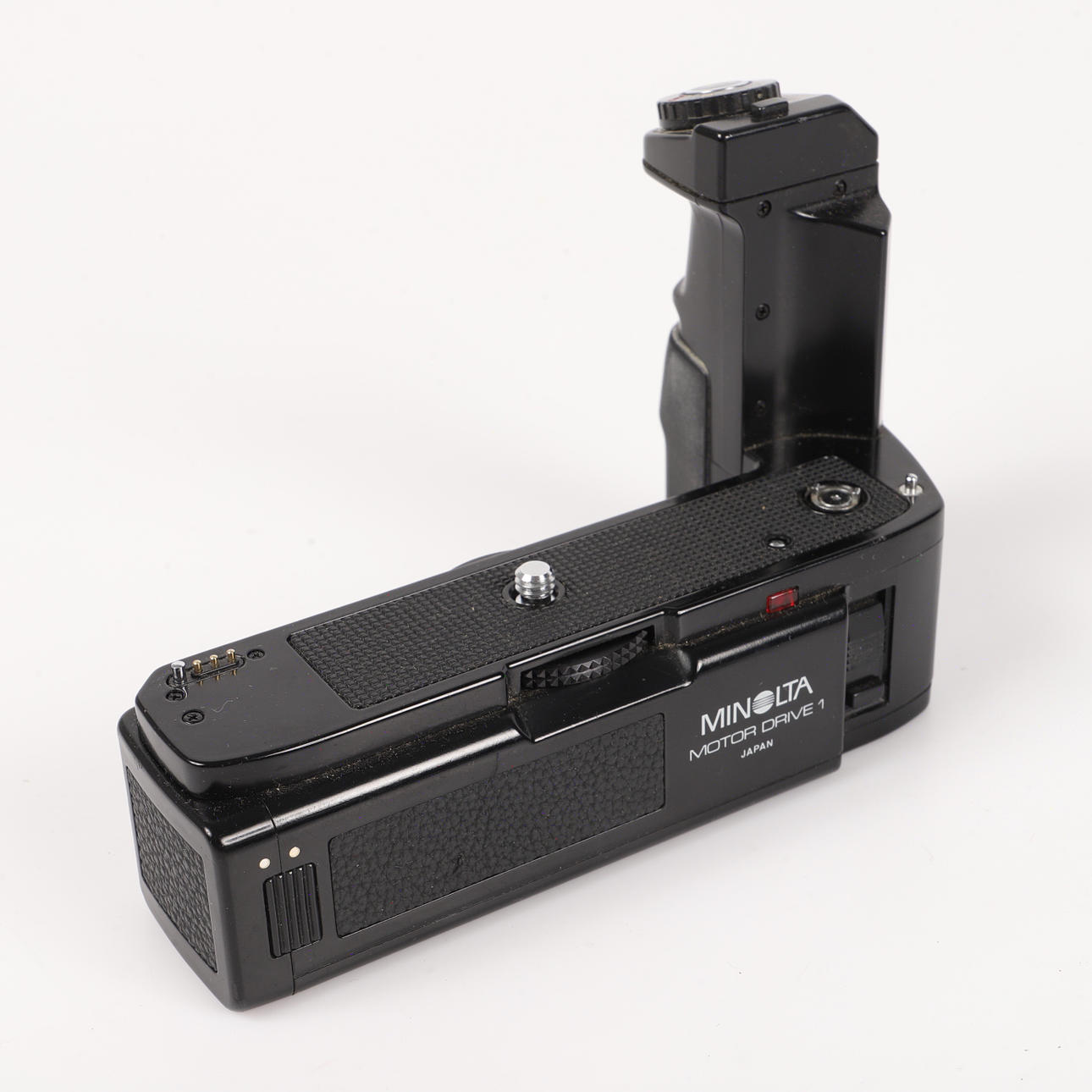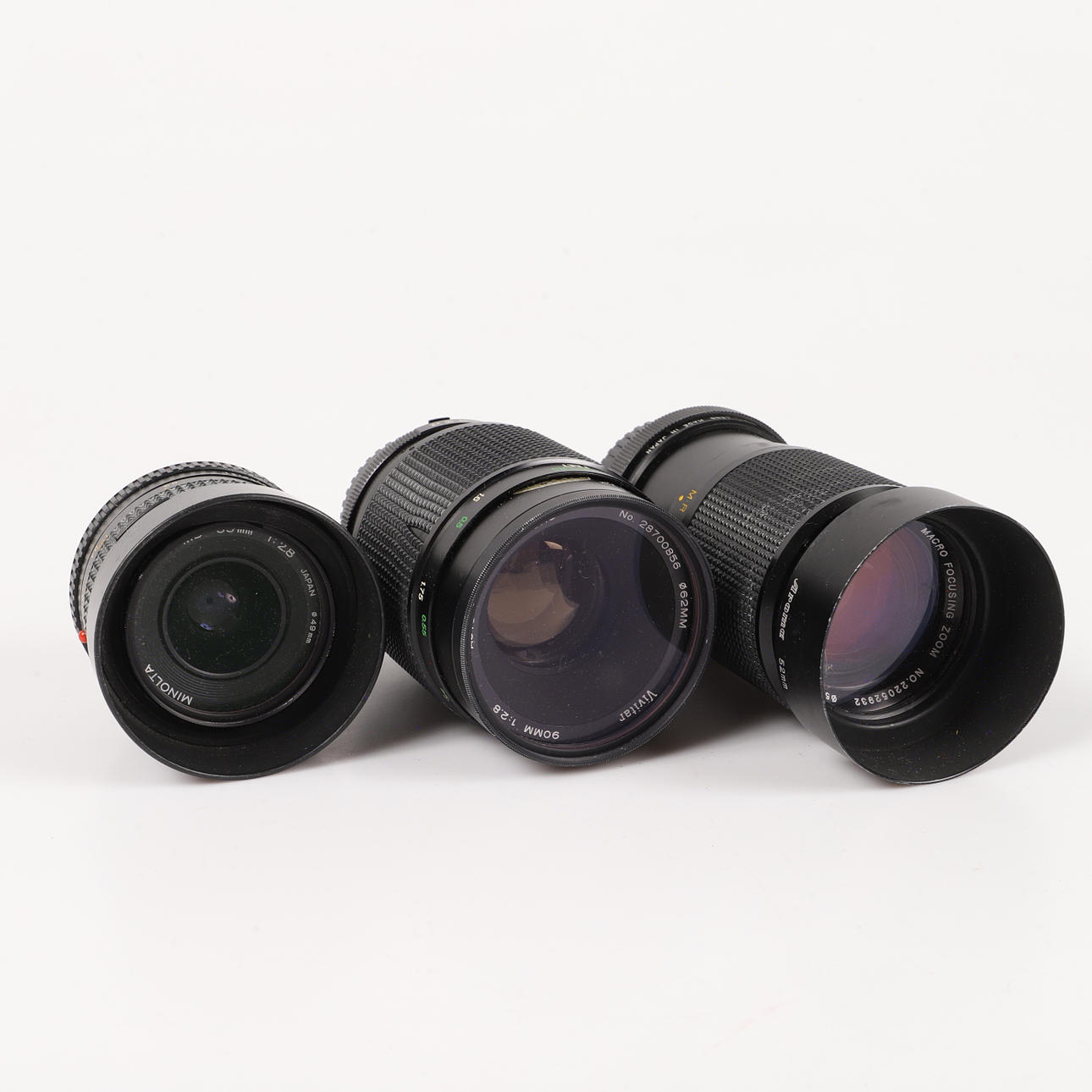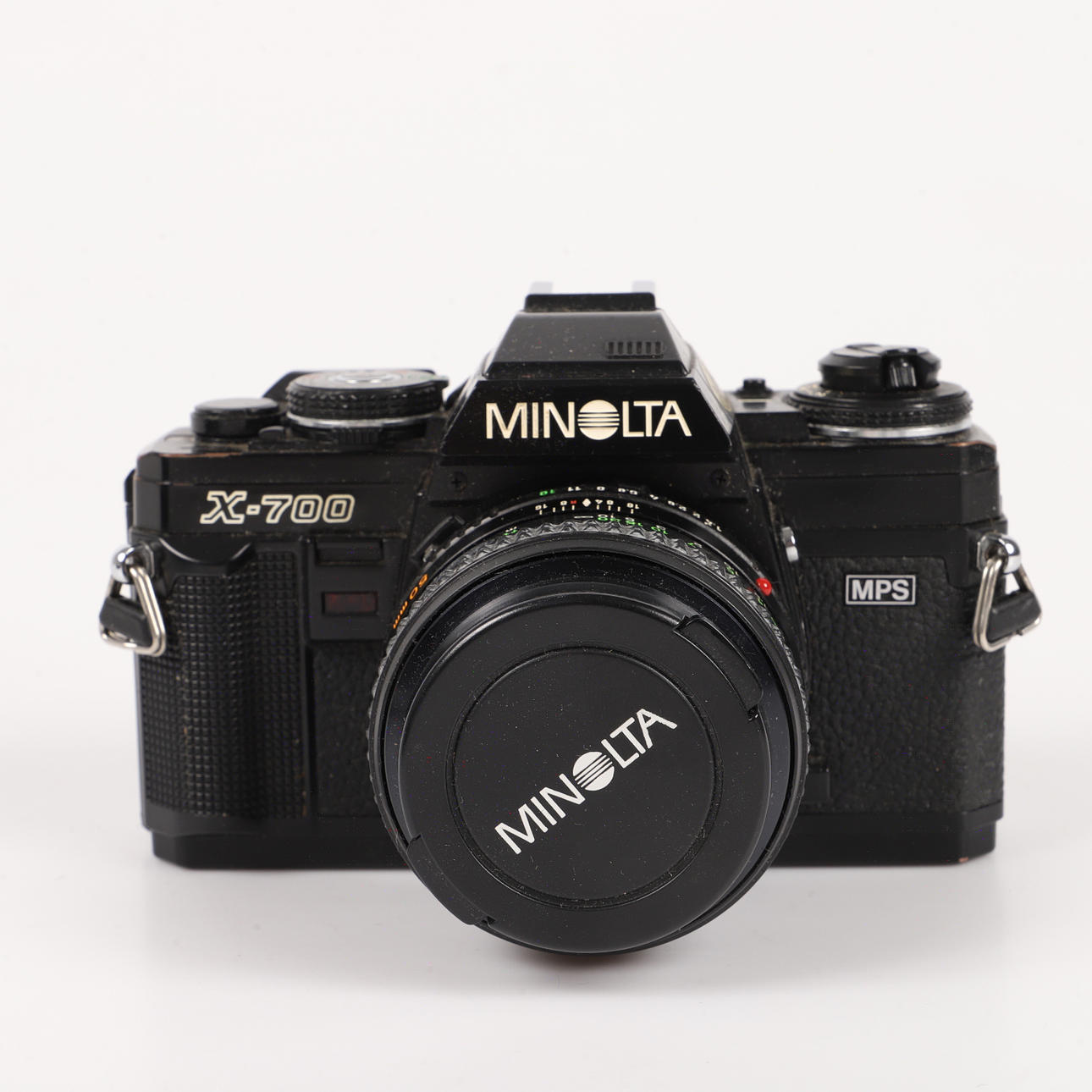 Kameragehäuse, X-700 Objektiv, Minolta 3,5 und 50 mm, Vivitar 90 und 70-150 mm Minolta „Motor Drive 1 Flash Auto 280 px Diverse Filter und Sonnenschutz und Bedienungsanleitungen“.