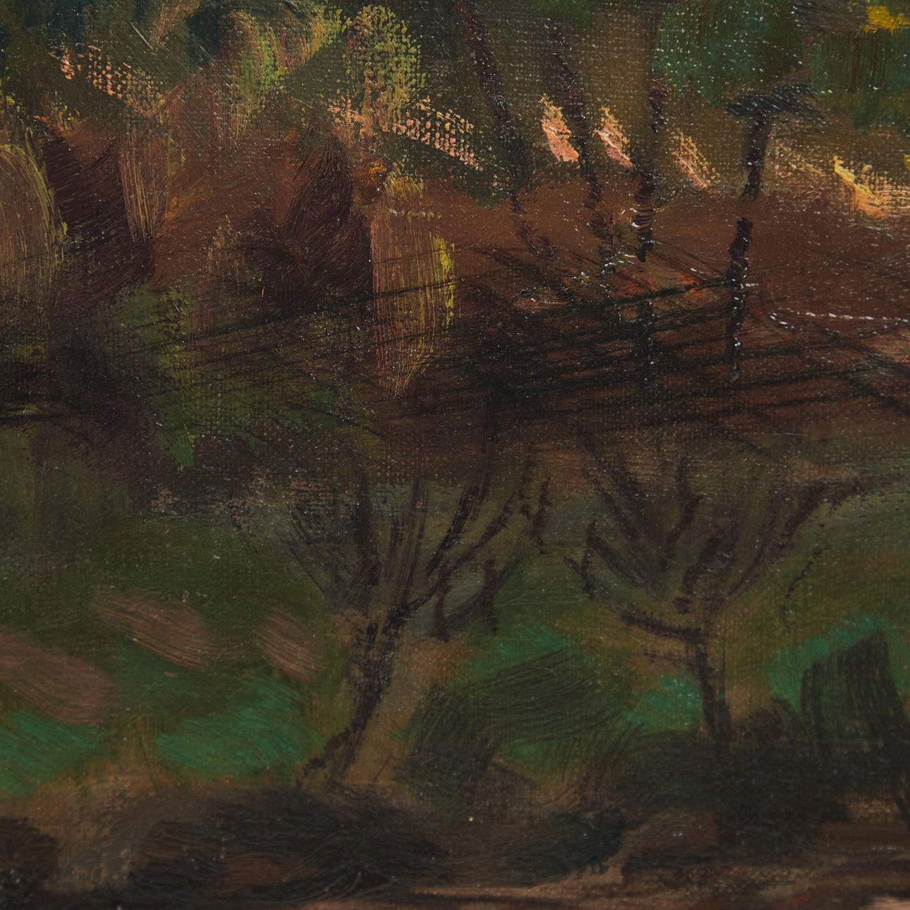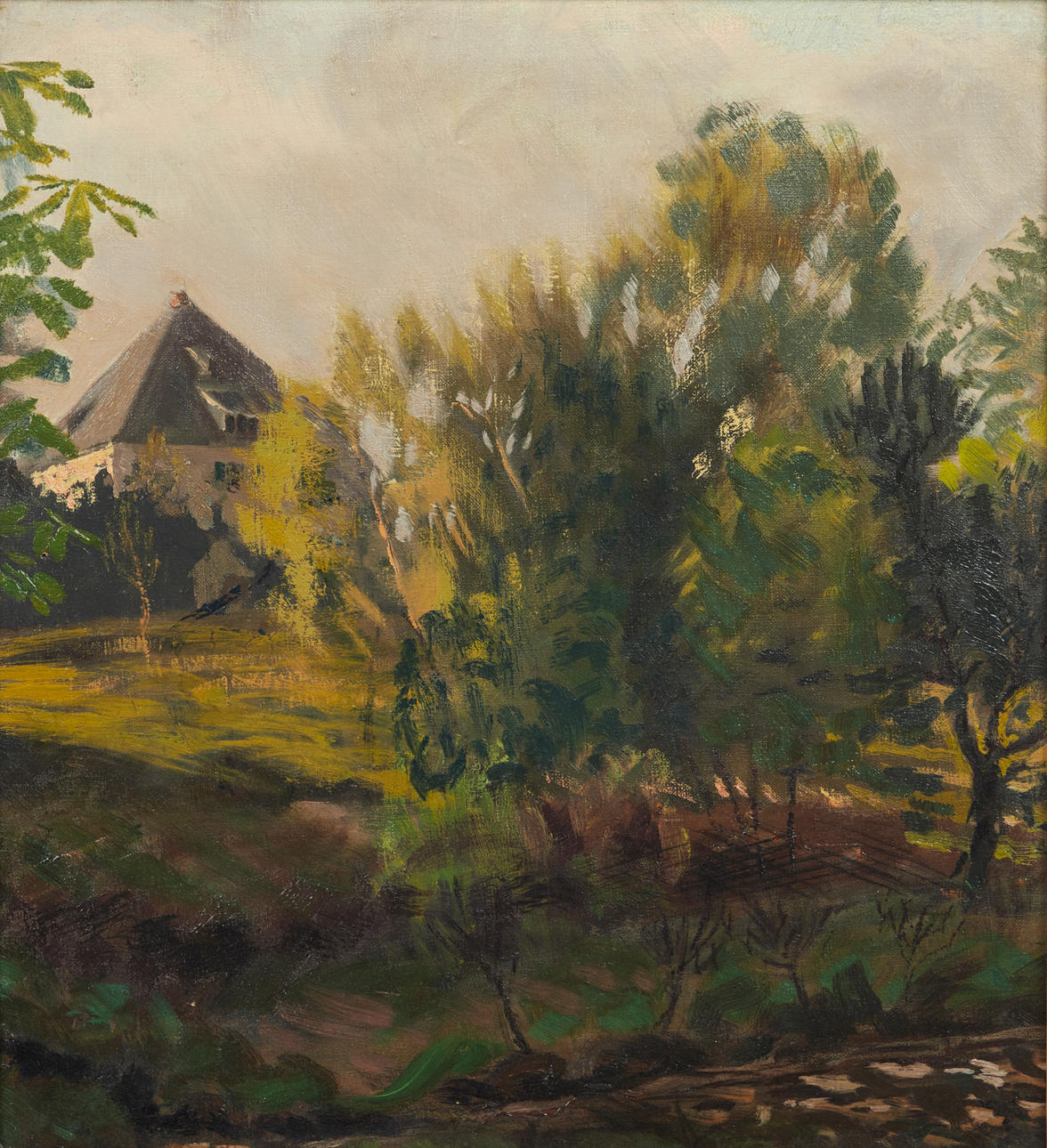 Rudolf Schulte im Hofe (1865-1928), Gemälde, Gartenansicht, Öl auf Leinwand. Darstellung eines sommerlichen Exterieurs mit Perspektive auf ein Haus vom Fuß eines Hügels, am Rahmen mit Künstlerplakette versehen, 55x49cm (75x67cm).