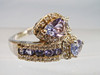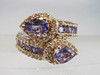 Der Ringkopf ist besetzt mit zwei tropfenförmig facettierten Tansaniten in gegenläufiger Anordnung. Die Ringschultern tragen rund facettierte Tansanite, die von Weißtopasen eingefasst sind.