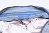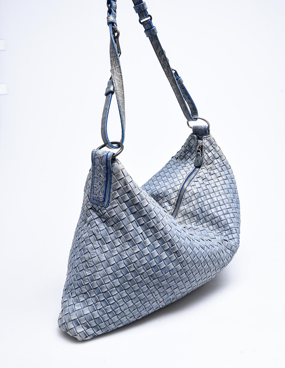 Geflochten aus blauem Nappaleder mit Details aus Leder mit Krokoprägung. Schnallen und Gehäuse aus dunkel oxidiertem Weißmetall. Innenausstattung aus Wildleder, ein größeres Seitenfach mit Reißverschluss und ein kleineres offenes für ein Mobiltelefon.