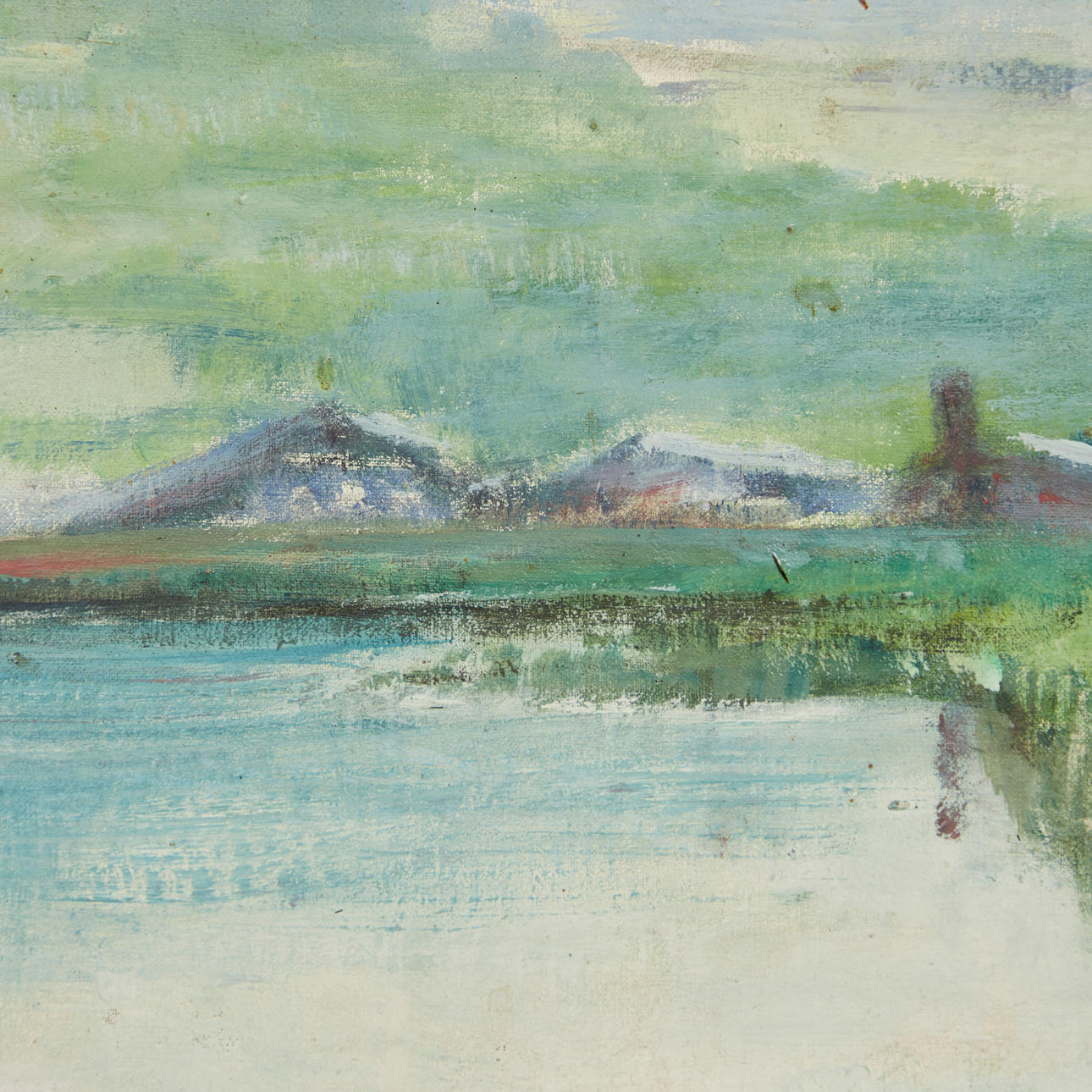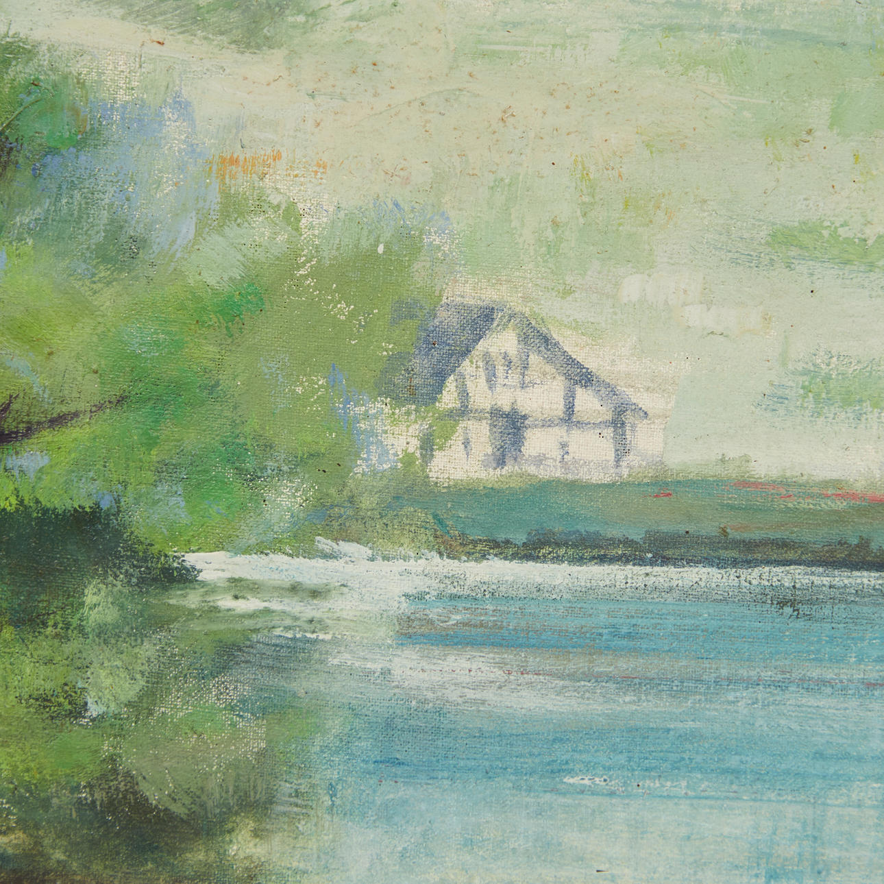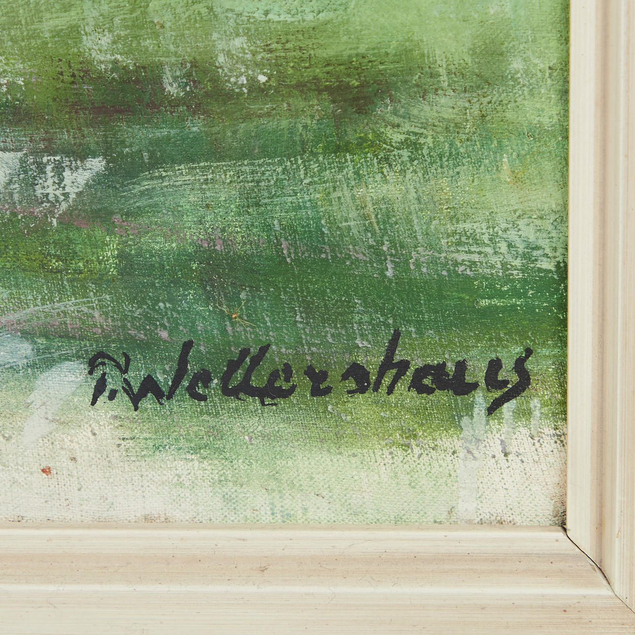 Paul Wellershaus (1887-1976), Gemälde, Blick über die Landschaft, Öl auf Leinwand. Darstellung eines sommerlichen grünen Exterieurs mit einem Gewässer und ausschnitthaftem Blick auf mehrere Fachwerkhäuser im Hintergrund, unten rechts signiert, 54,5x70,5cm (68x83cm).