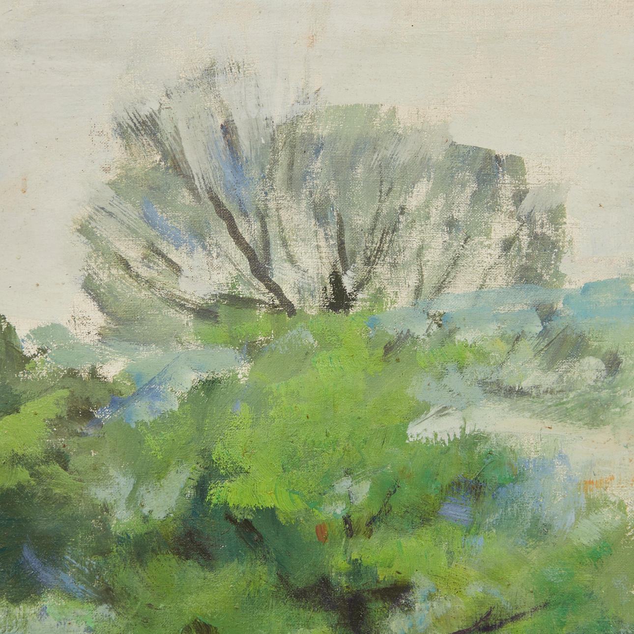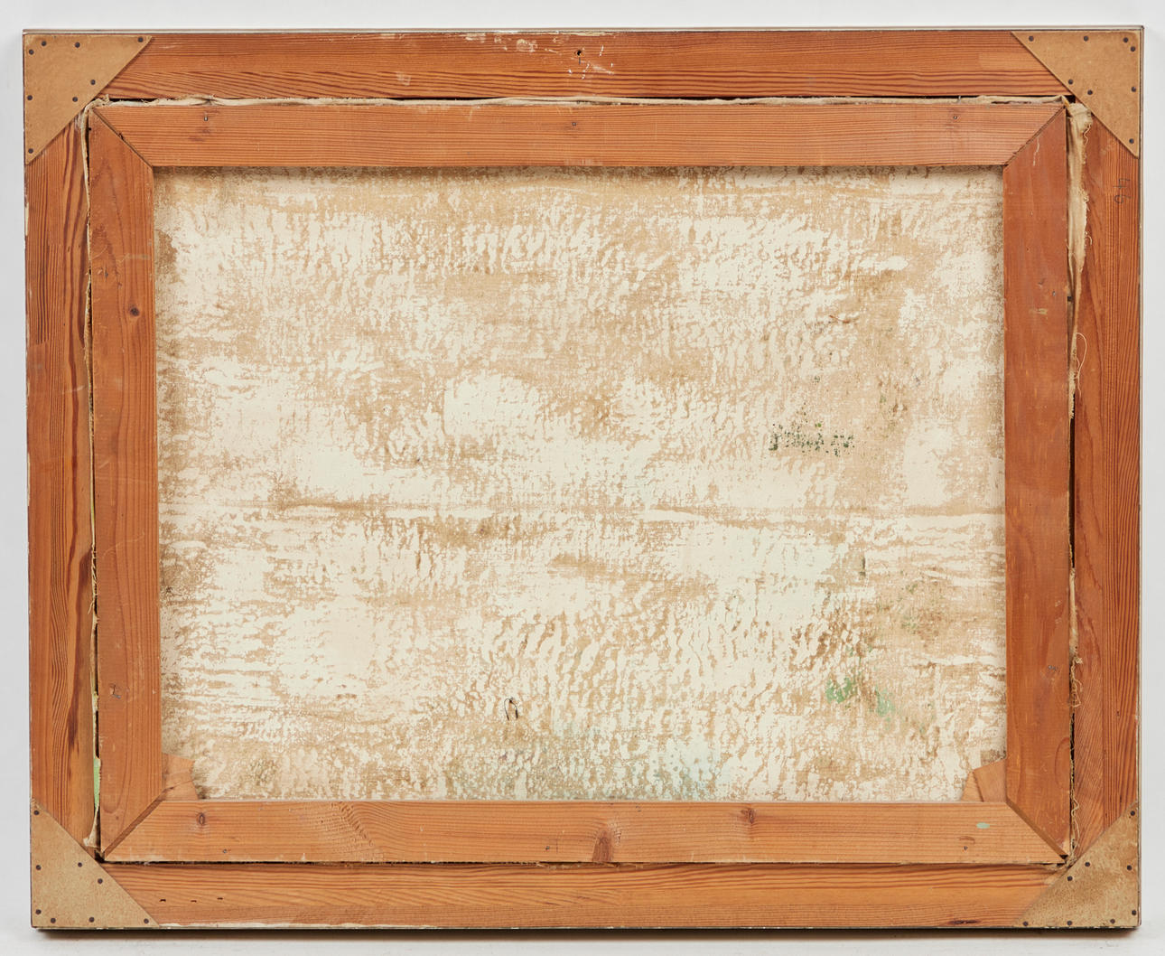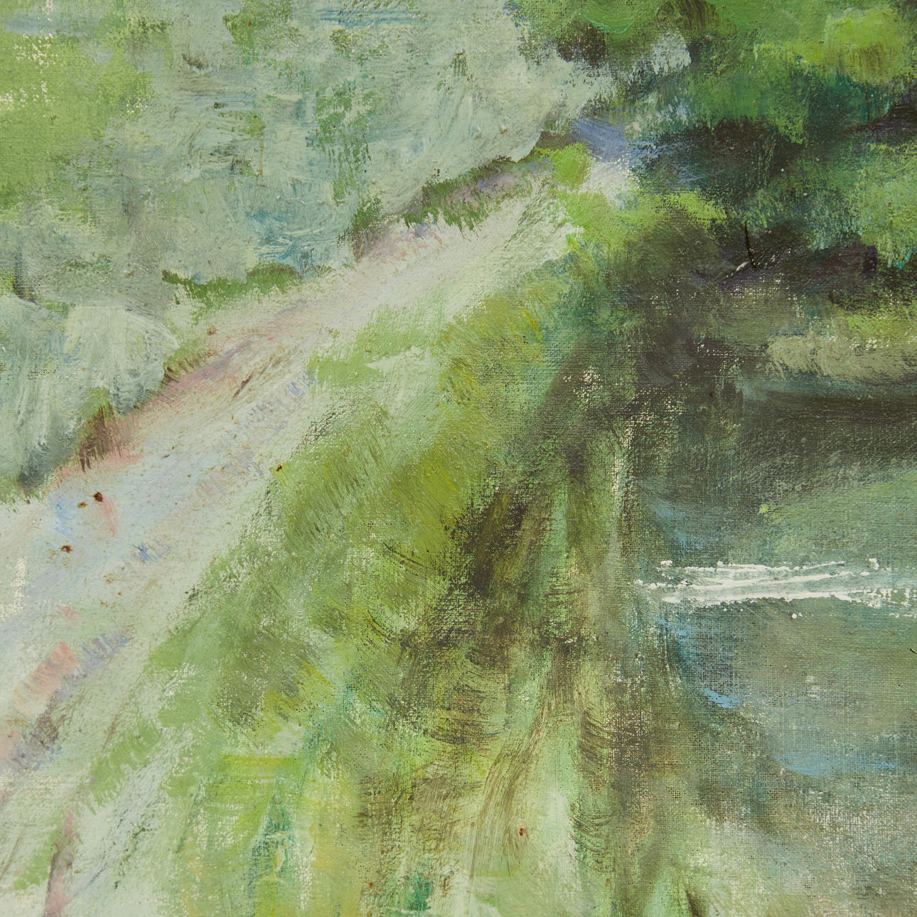 Paul Wellershaus (1887-1976), Gemälde, Blick über die Landschaft, Öl auf Leinwand. Darstellung eines sommerlichen grünen Exterieurs mit einem Gewässer und ausschnitthaftem Blick auf mehrere Fachwerkhäuser im Hintergrund, unten rechts signiert, 54,5x70,5cm (68x83cm).