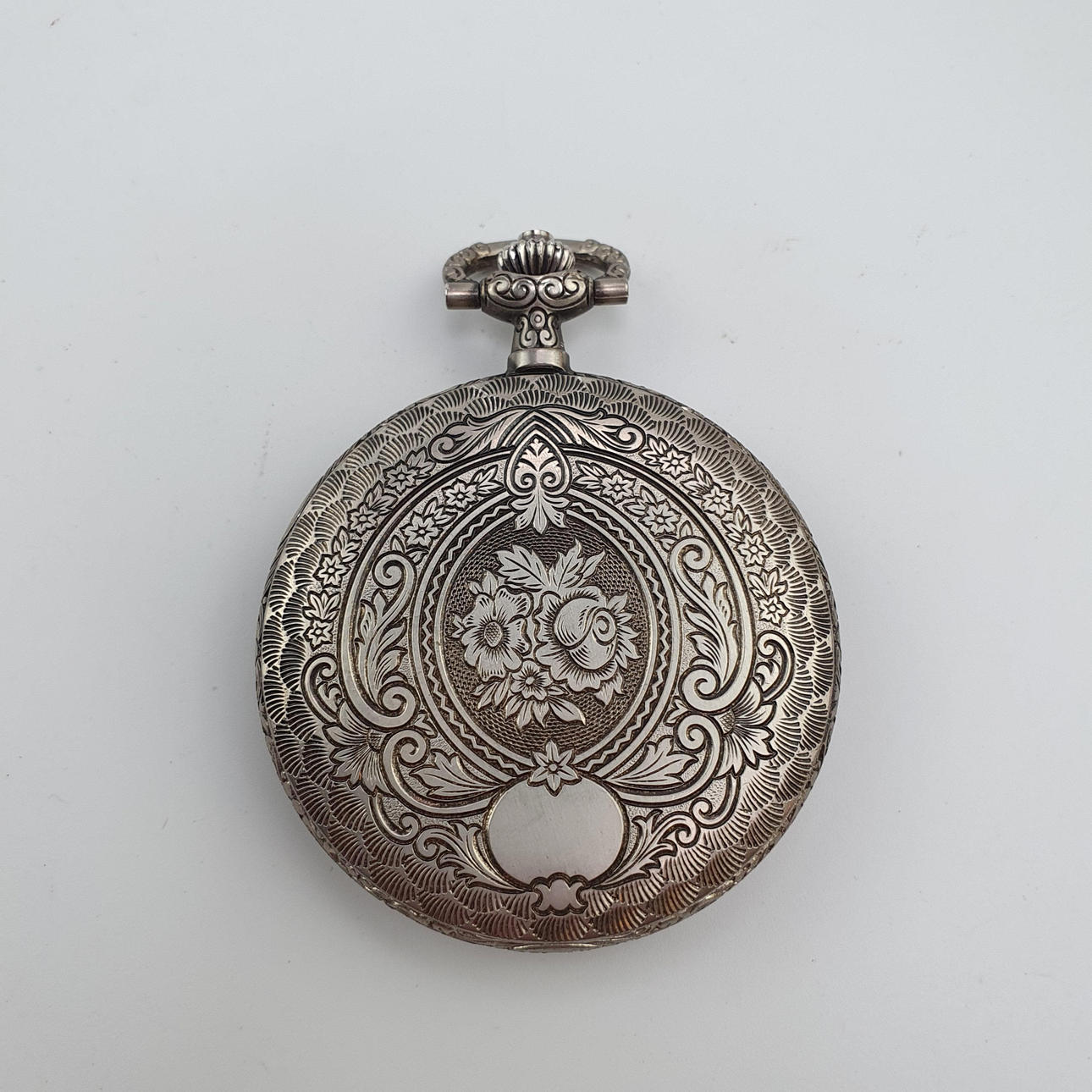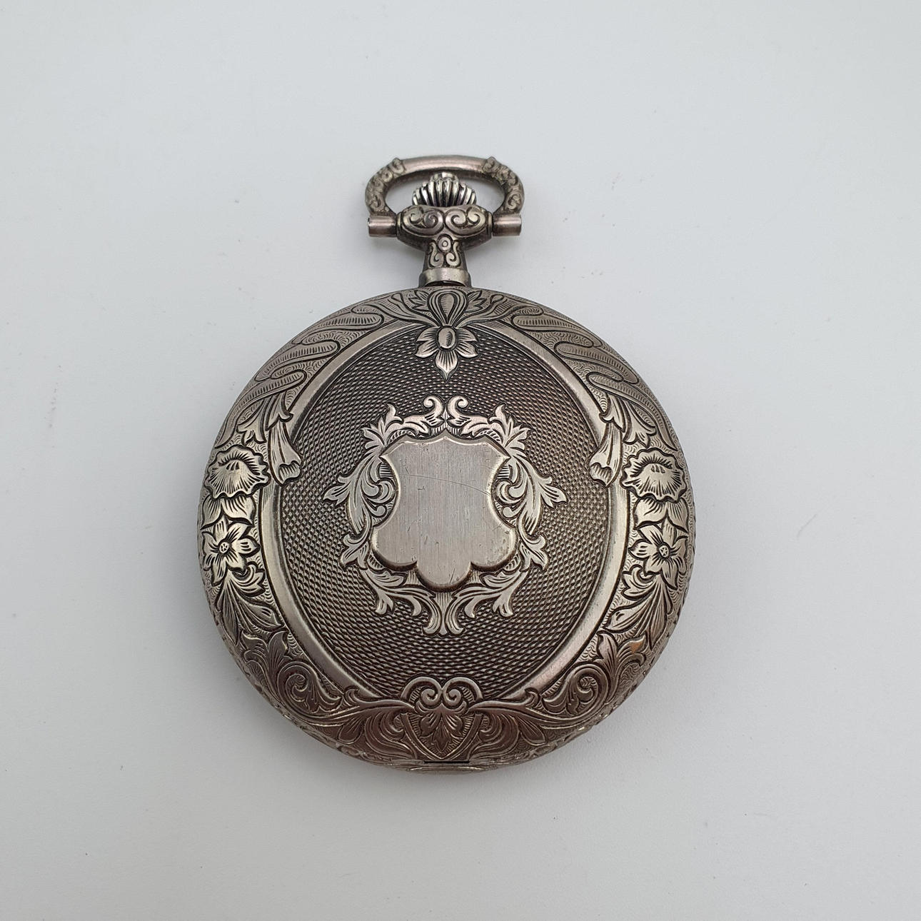 Metall, gravierter Dekor, Sprungdeckel, weißes Zifferblatt mit schwarzen römischen Zahlen und kleiner Sekunde bei der „6“, Kronenaufzug, Gehäuse-Dm.ca. 48 mm.